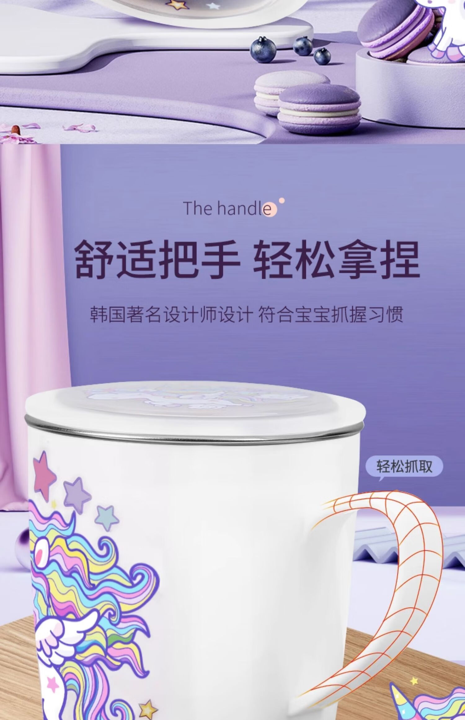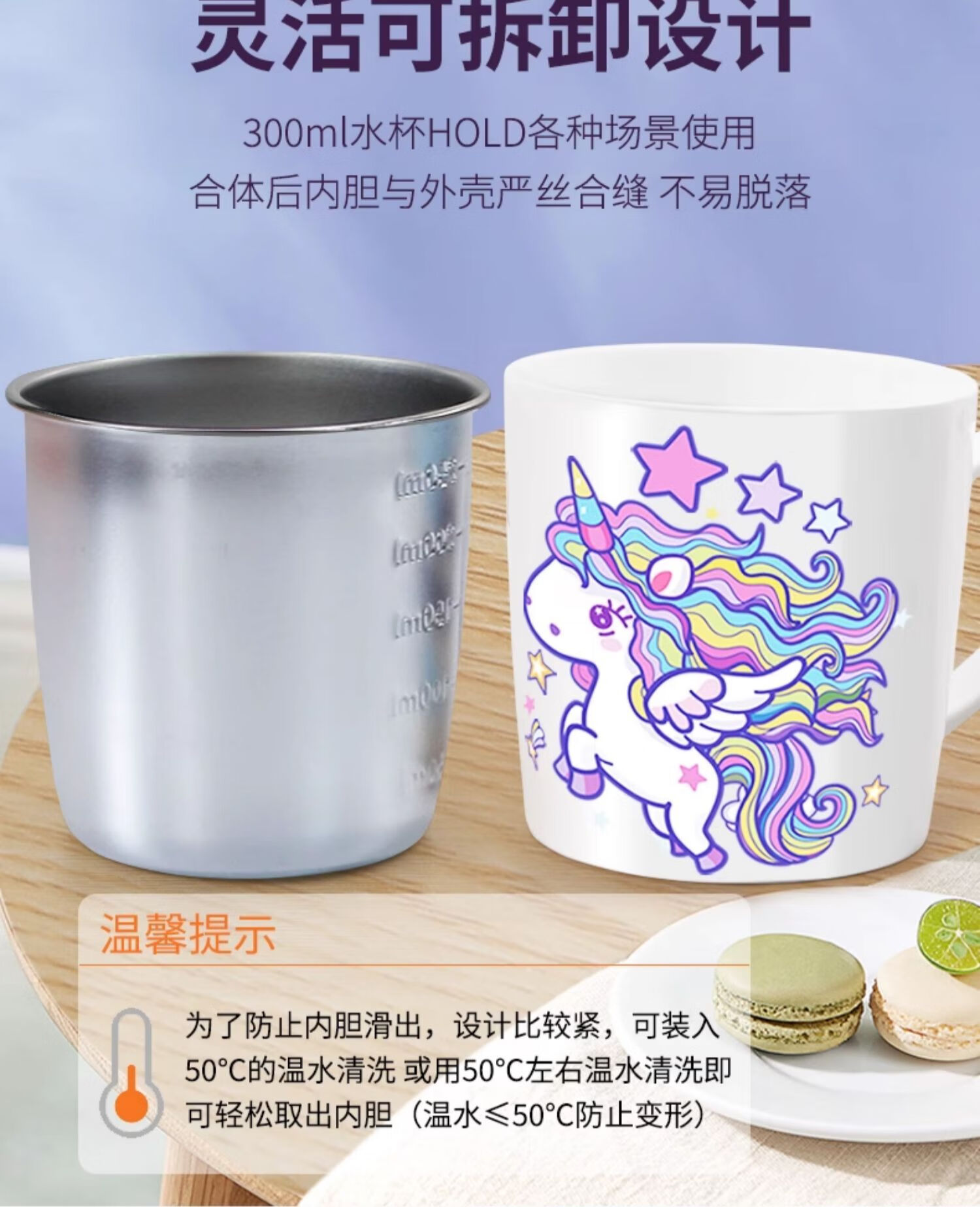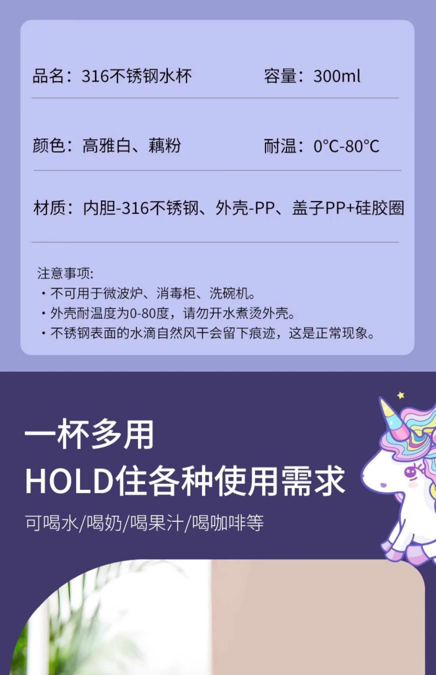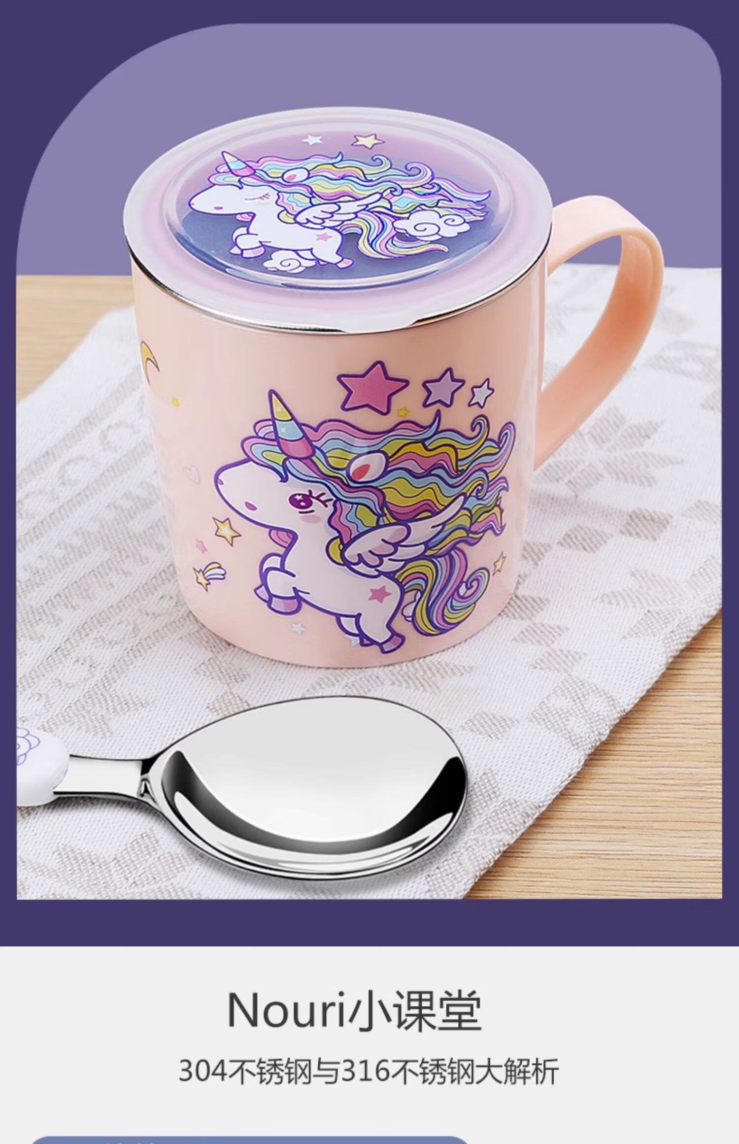 Children's water cup household 316 stainless steel cup with scale drinking cup kindergarten baby special open cup 316 white split unicorn 300ml