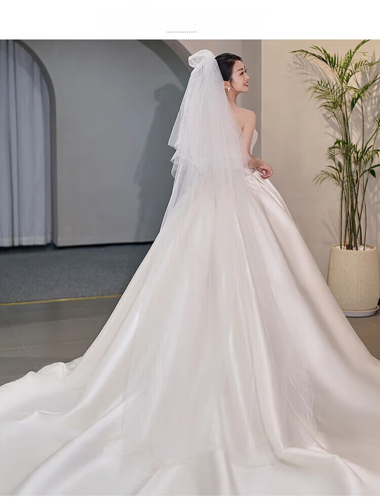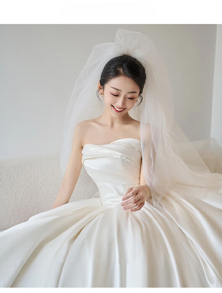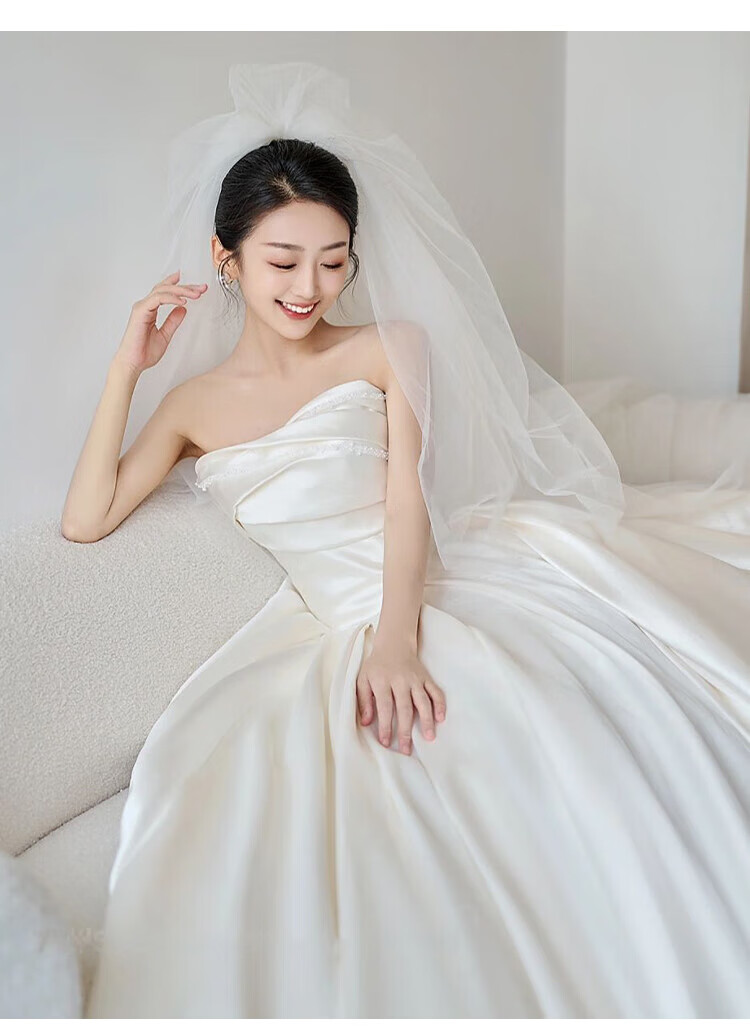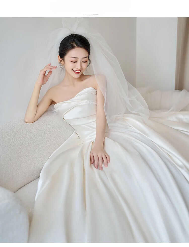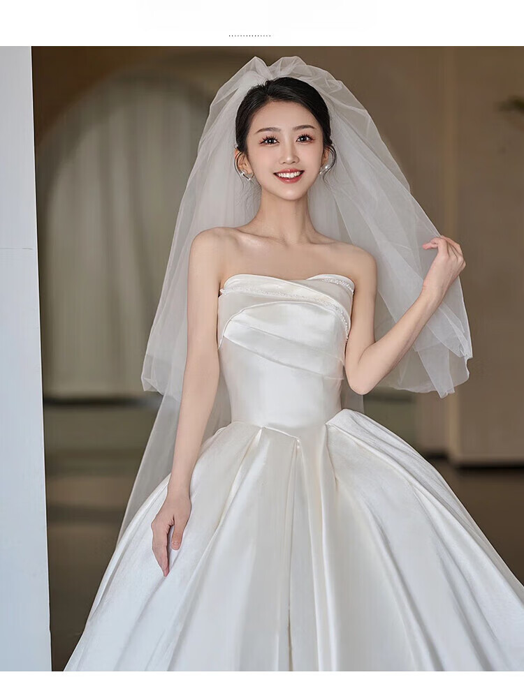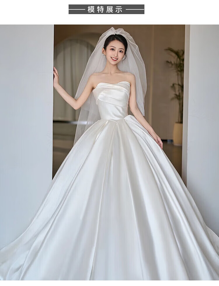 SHANDONGSHAONV strapless satin wedding dress 2025 bride petite main yarn French style going out yarn fugitive princess high quality white floor-length style (single wedding dress without accessories) XS weight about 80 pounds