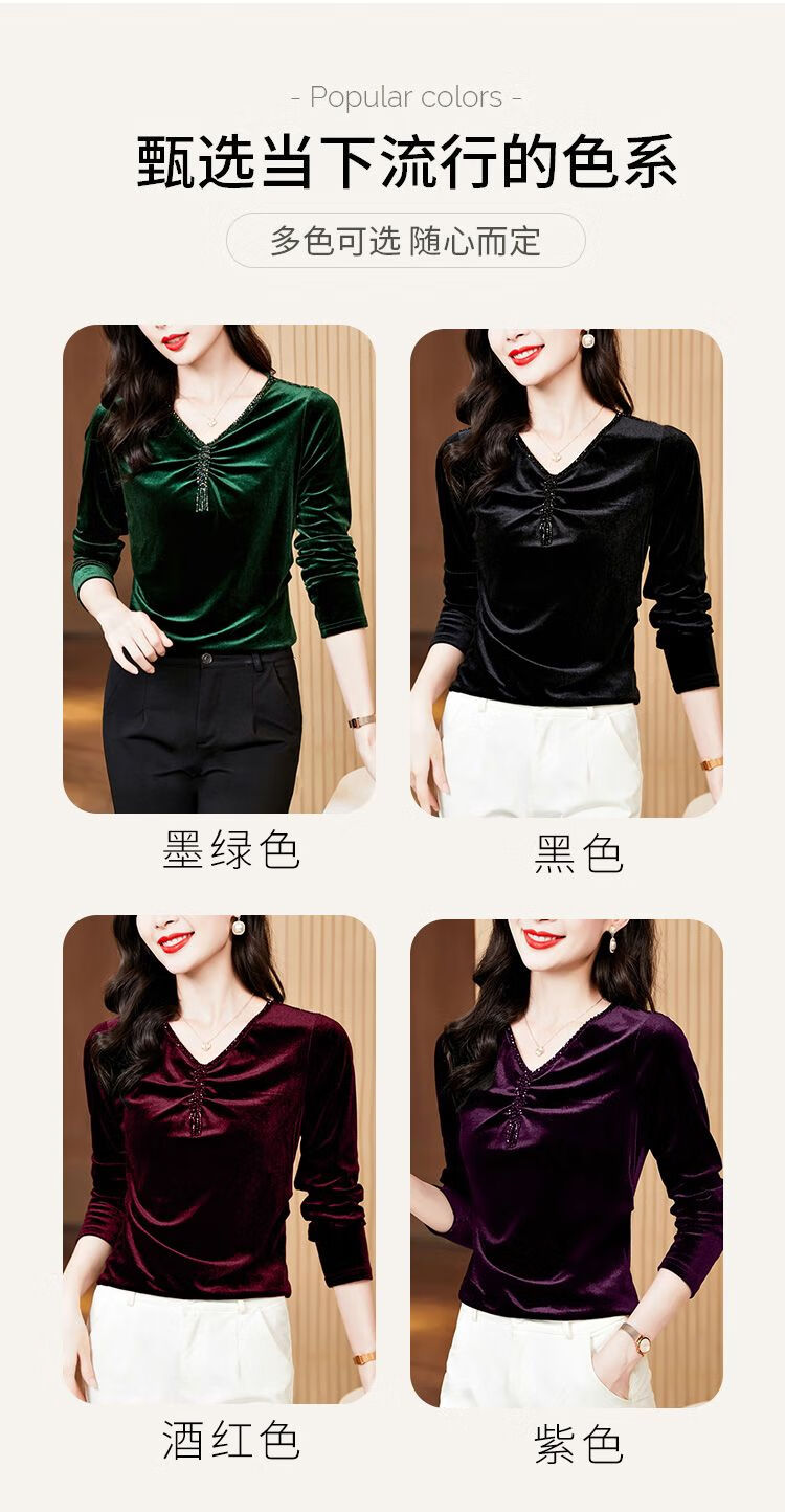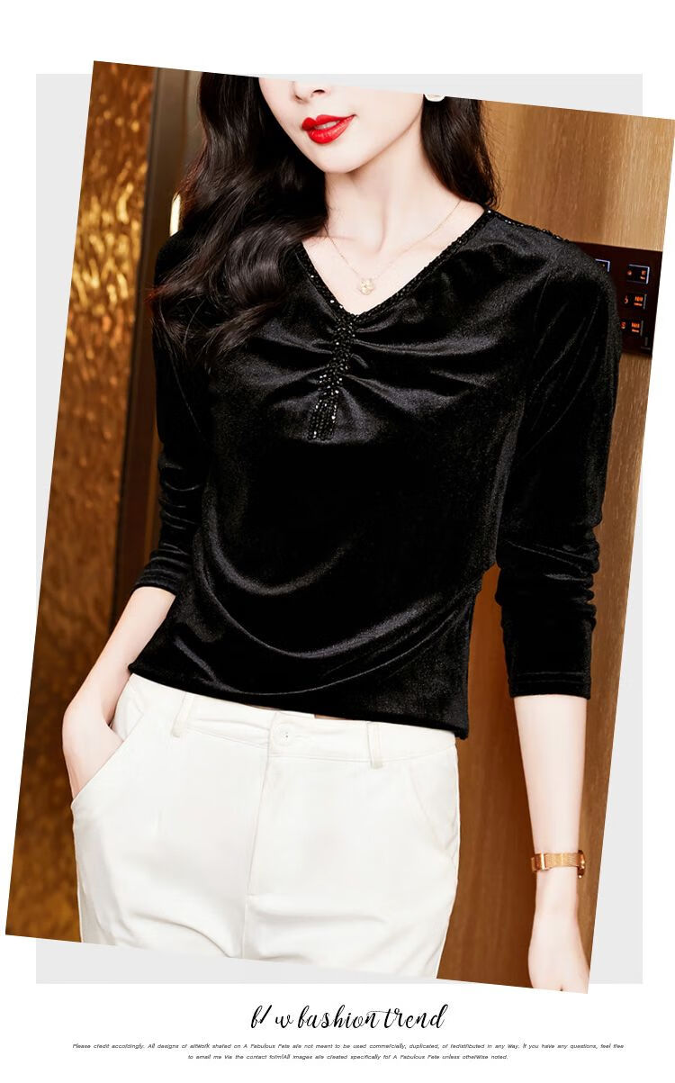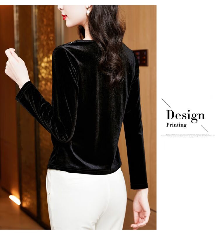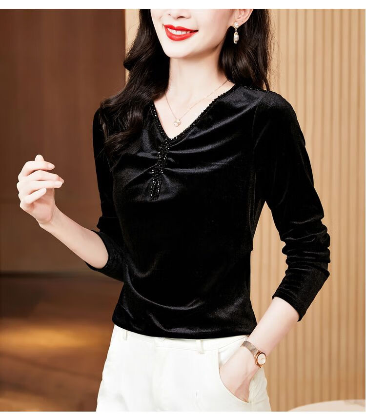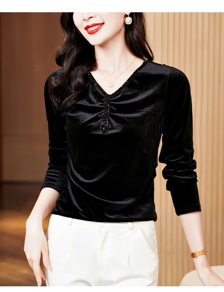 Pierre Cardin velvet women's top with bottoming shirt spring and autumn new high-end rich woman low-necked shirt fashionable long-sleeved top for women black regular M recommended 85-100 pounds