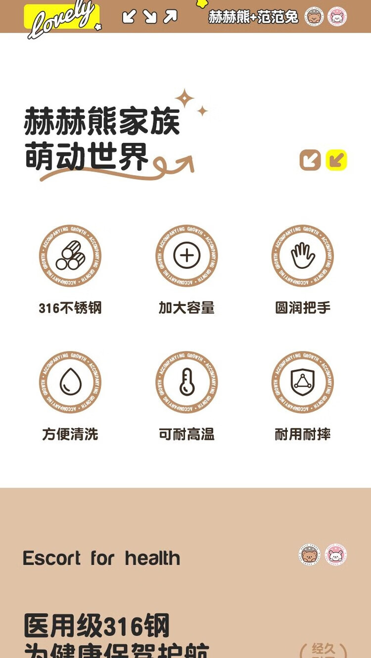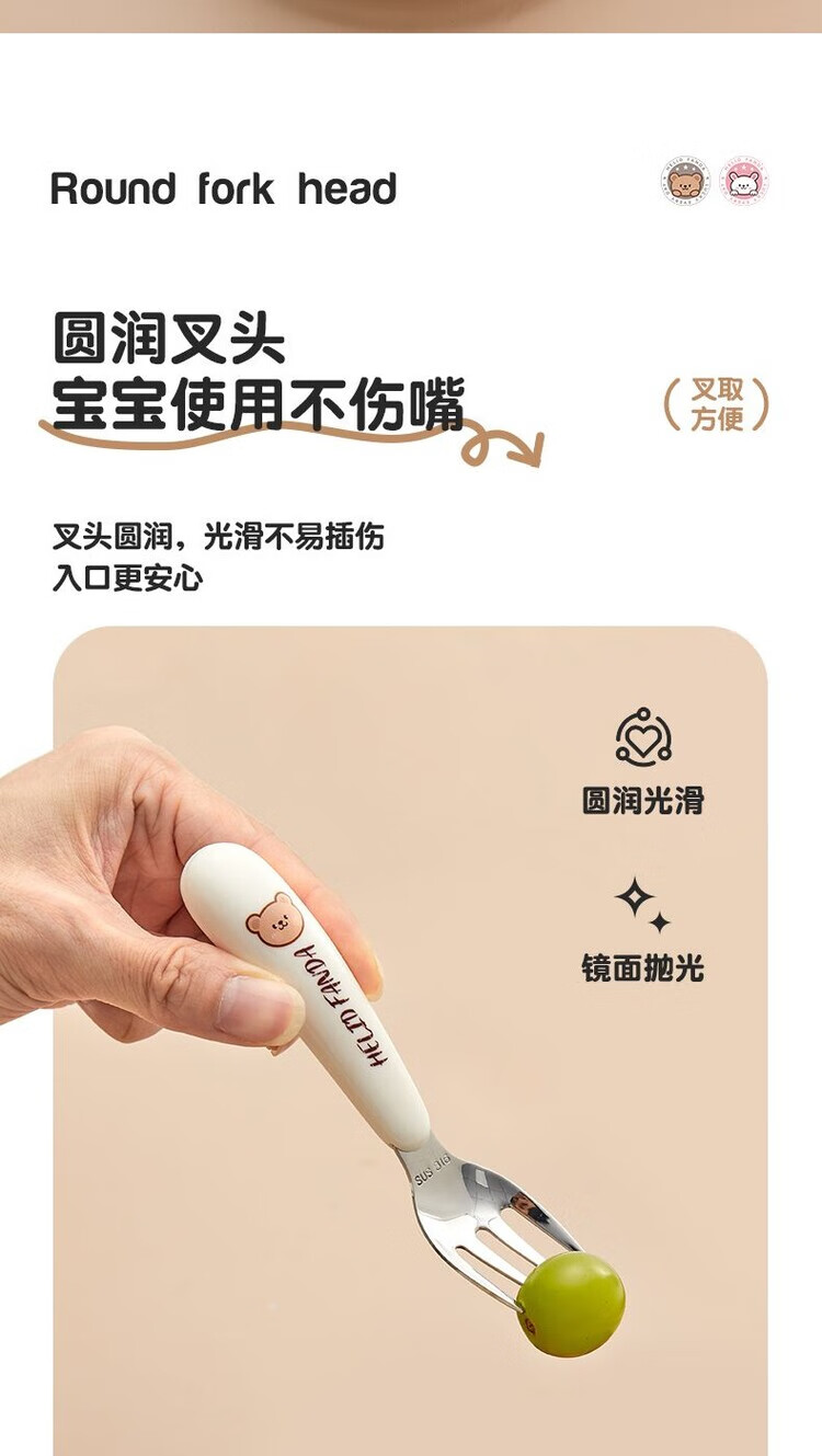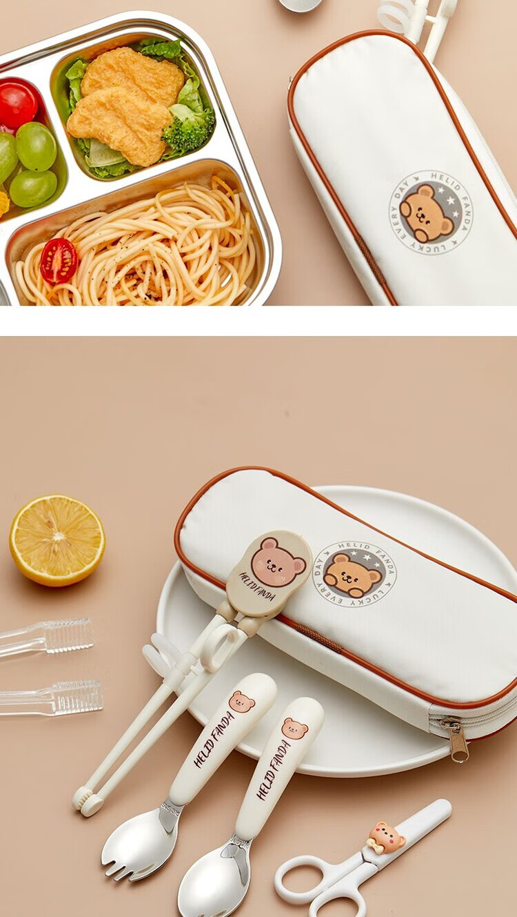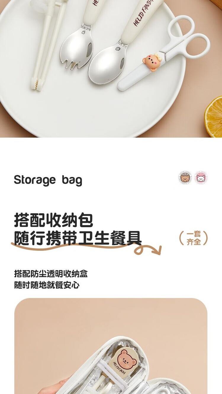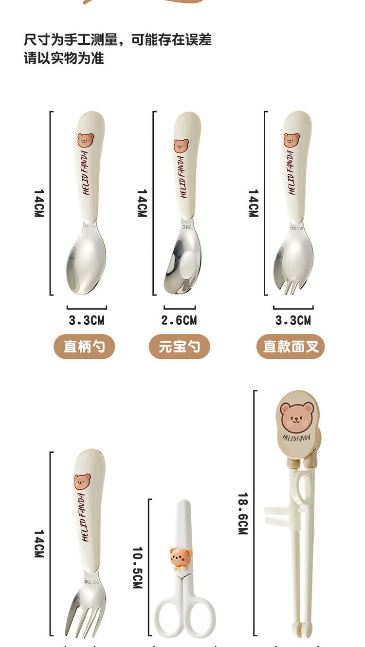 WORTHBUY 316 stainless steel cartoon tableware set for children, portable eating spoon, baby learning food supplement set, food grade He He Xiong - Yuanbao spoon and fork + chopsticks + scissors + food supplement clip + cutlery bag No specifications