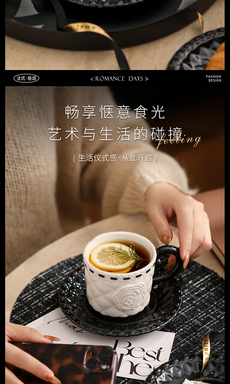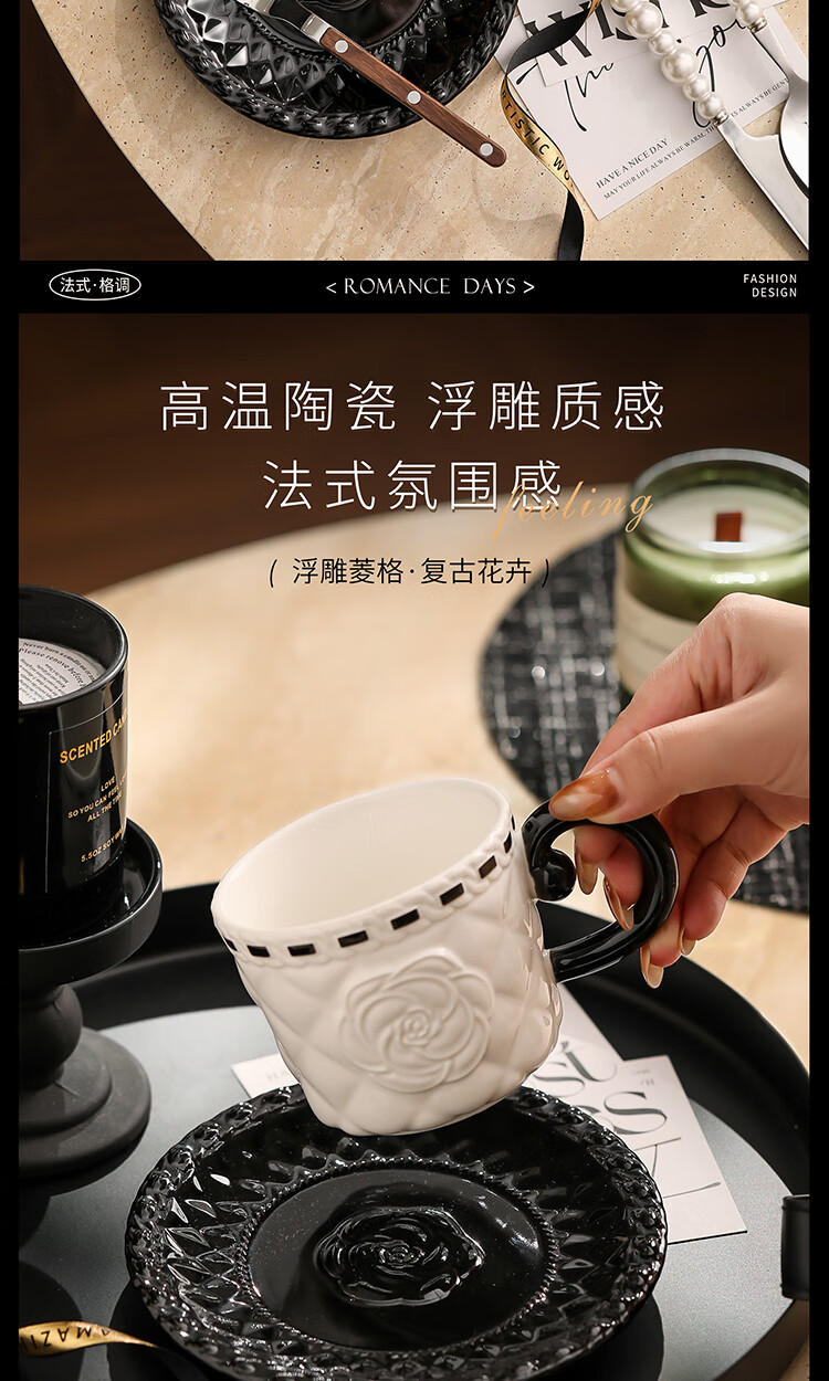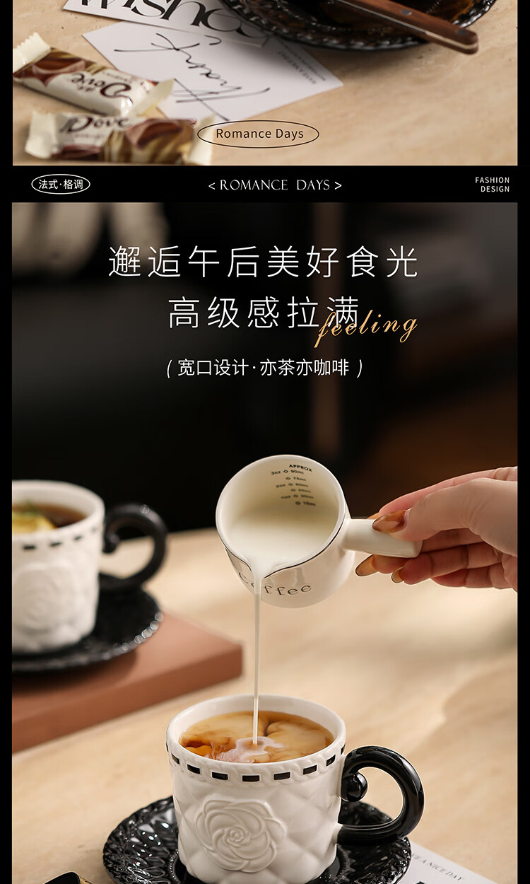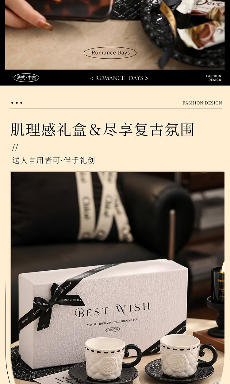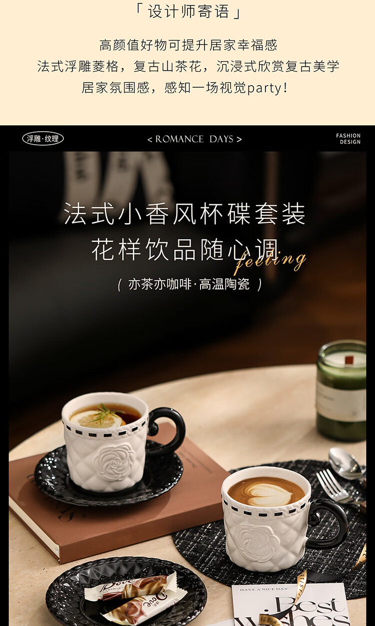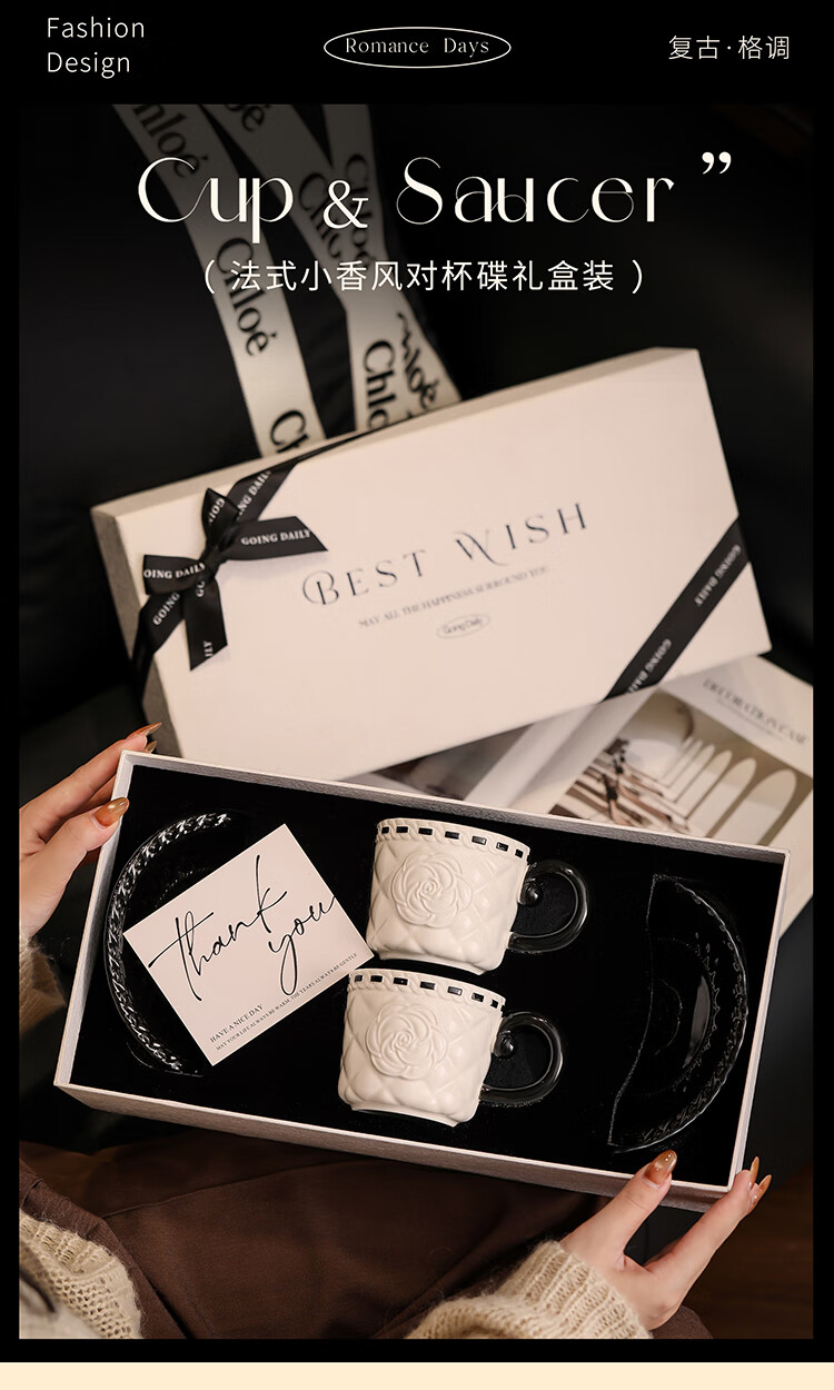 Romance Days small fragrant style coffee cup set, light luxury high-end ceramic cup and saucer gift box, wedding gift for best friend, gift for newlyweds, small fragrant style pair of cup and saucer set, textured white gift box, gift bag
