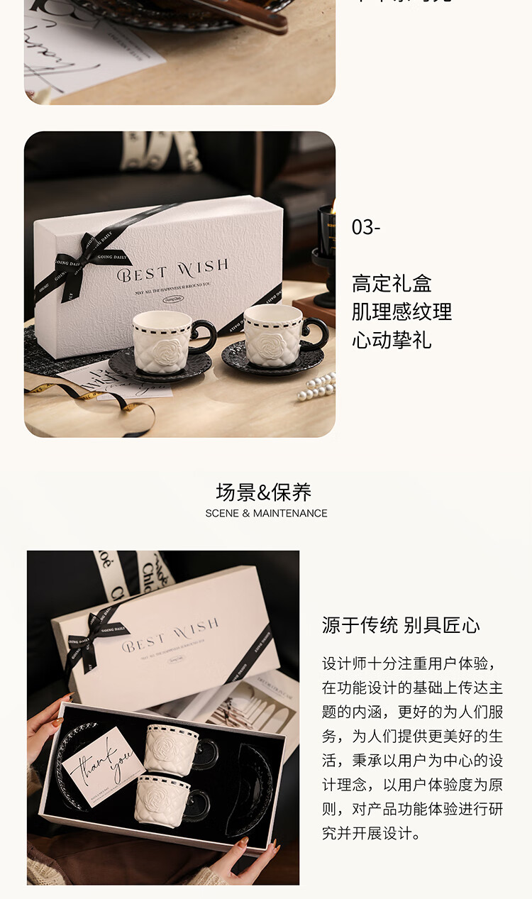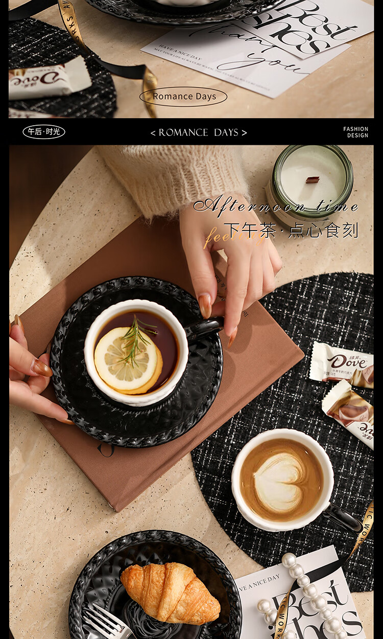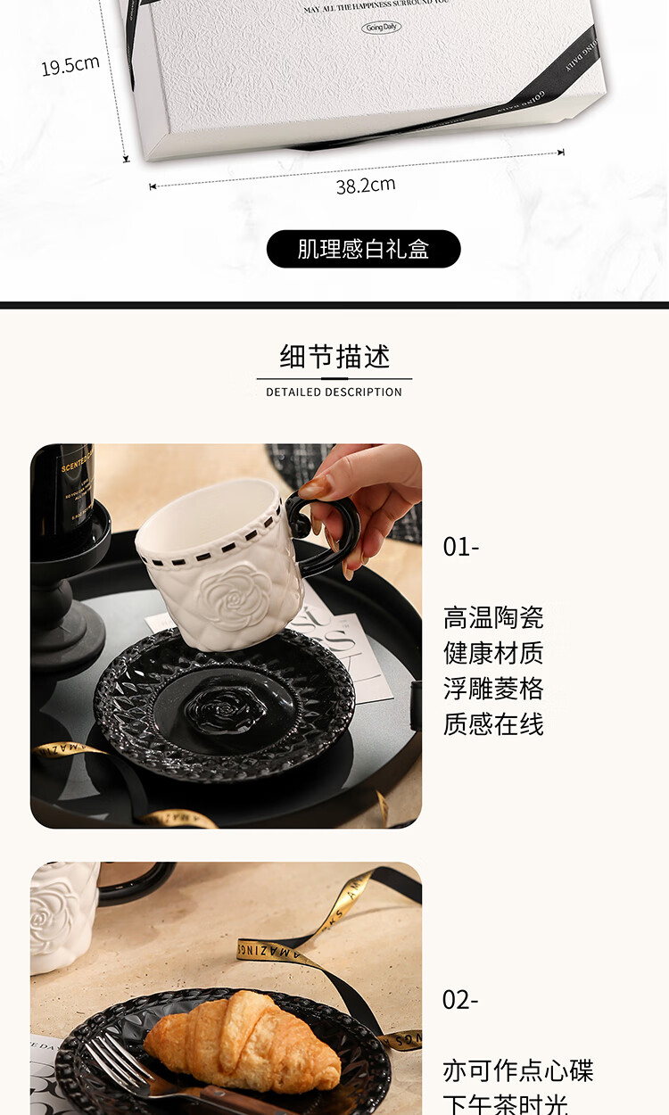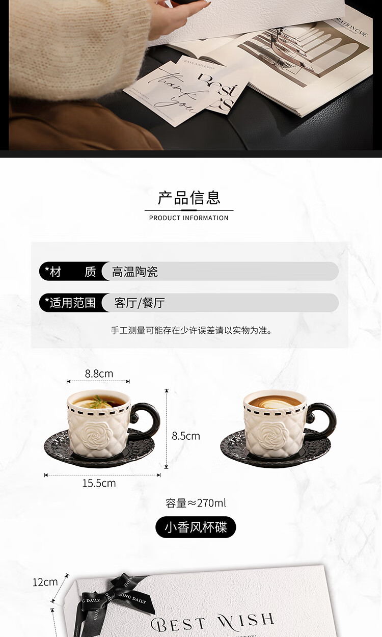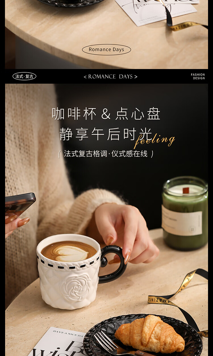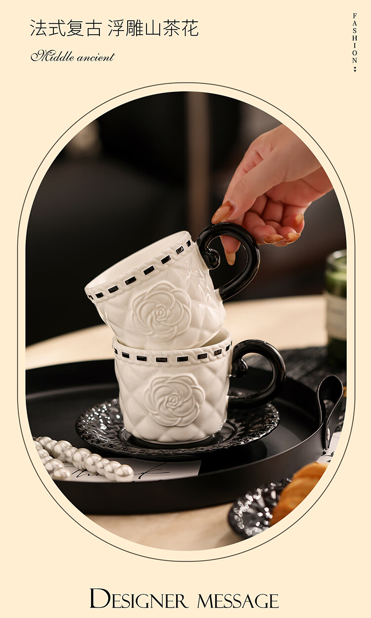 Romance Days small fragrant style coffee cup set, light luxury high-end ceramic cup and saucer gift box, wedding gift for best friend, gift for newlyweds, small fragrant style pair of cup and saucer set, textured white gift box, gift bag