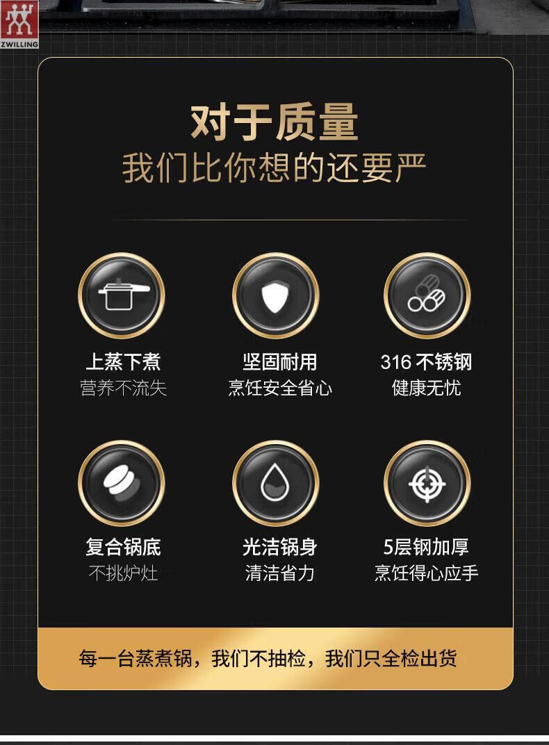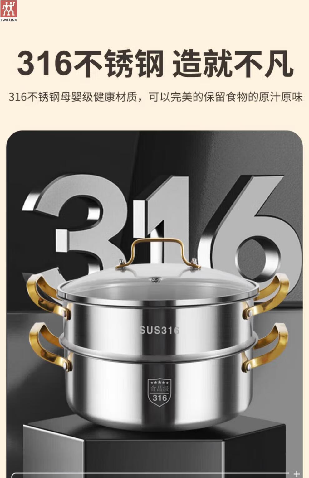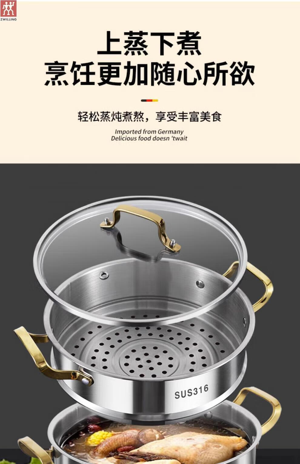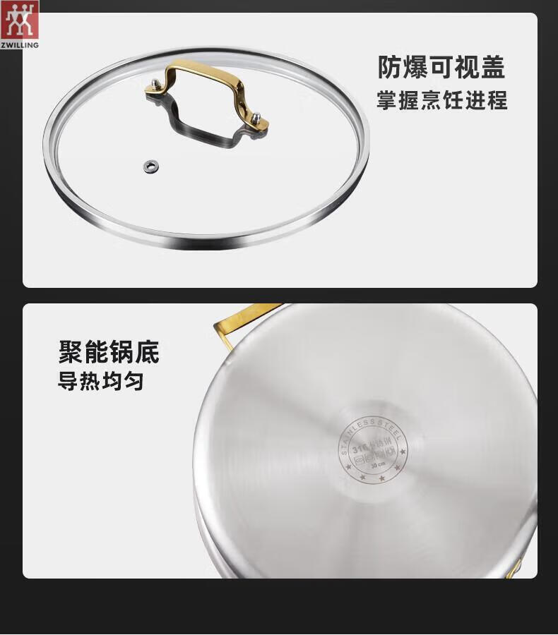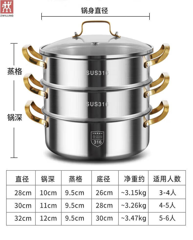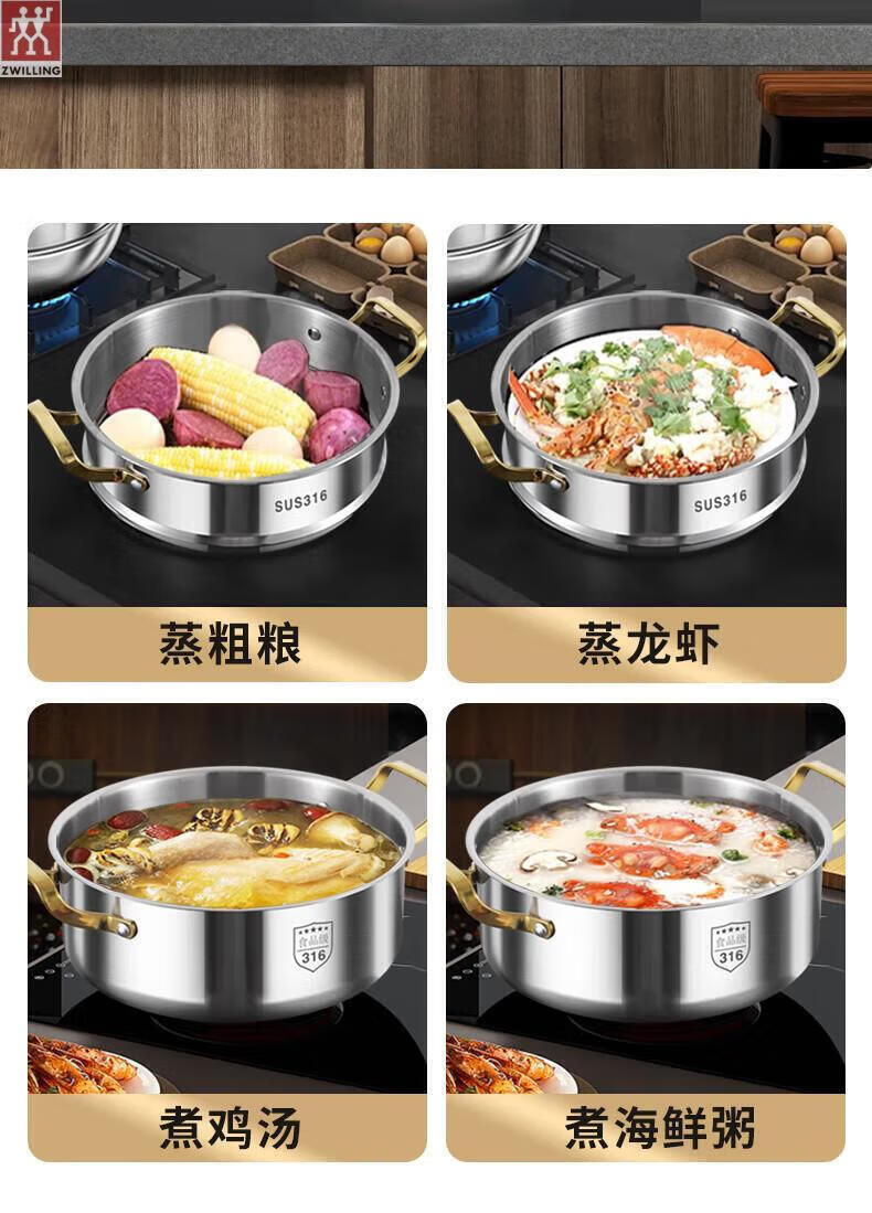 ZWILLING German stainless steel steamer 316 food grade thickened household multi-layer cooking pot hot pot induction cooker universal soup pot double layer extra thick 316 steel one-piece molding 28cm