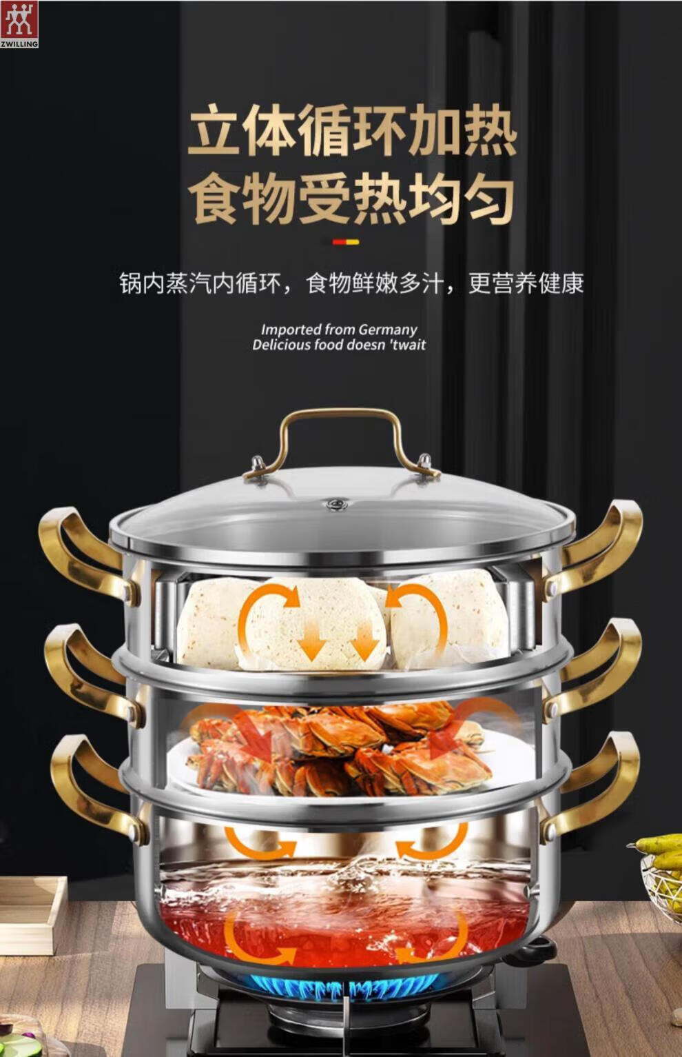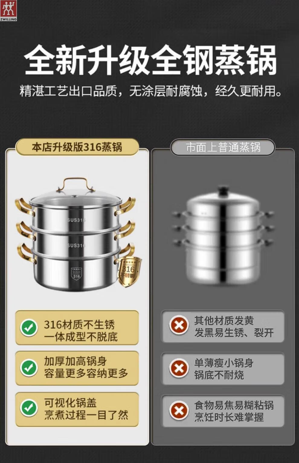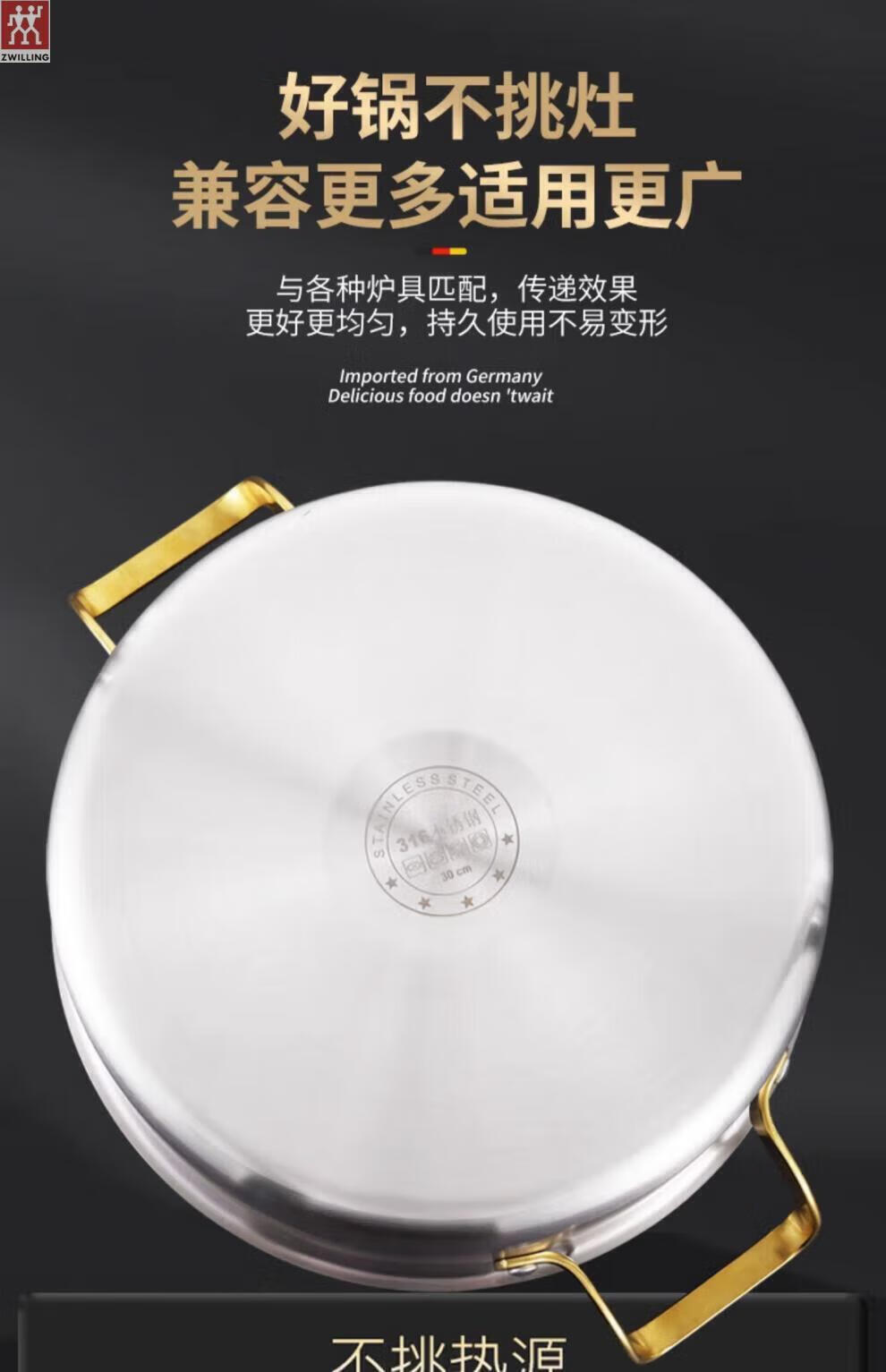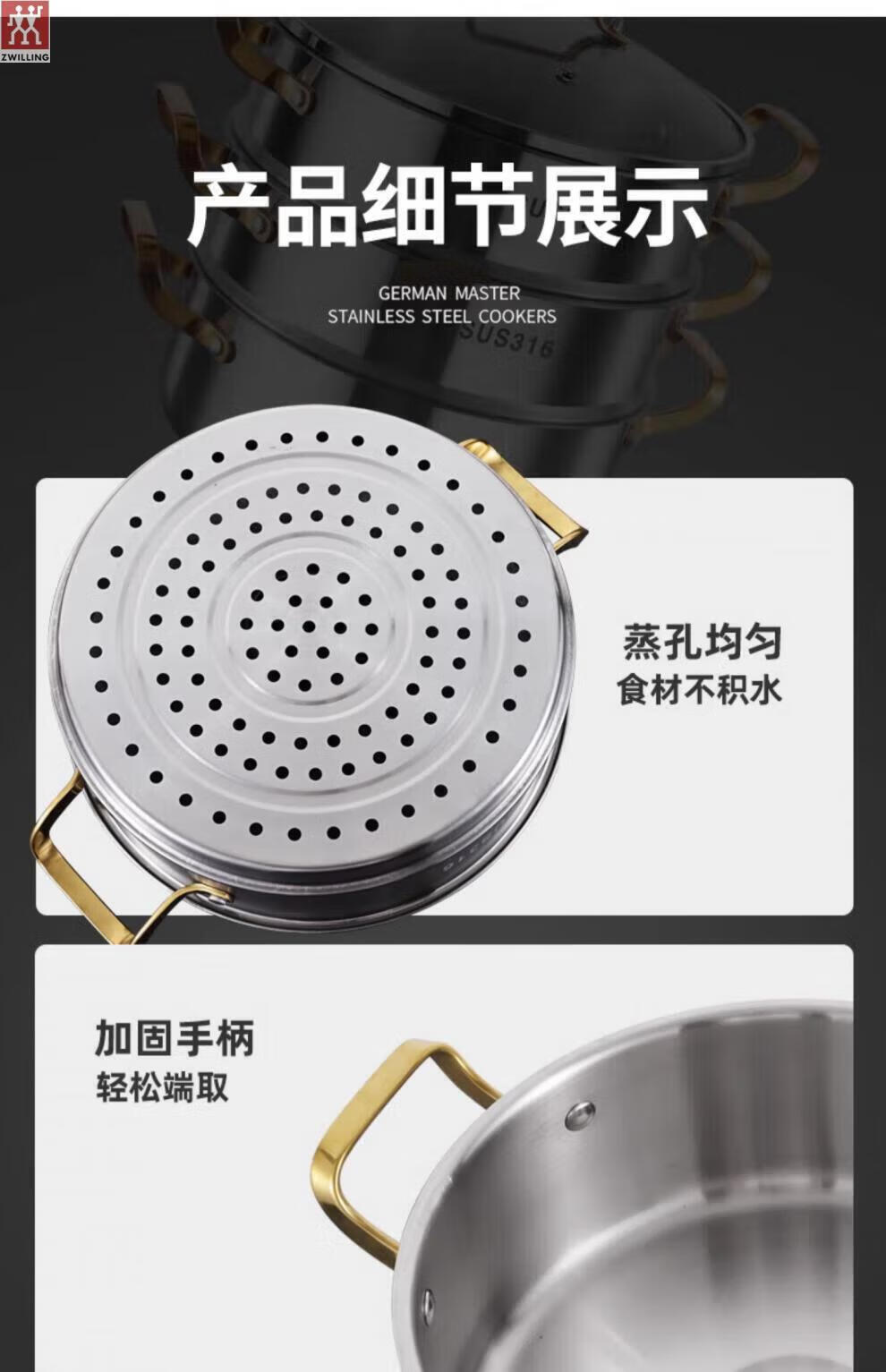 ZWILLING German stainless steel steamer 316 food grade thickened household multi-layer cooking pot hot pot induction cooker universal soup pot double layer extra thick 316 steel one-piece molding 28cm