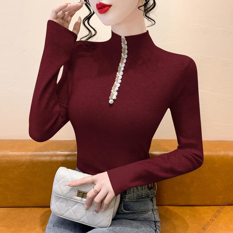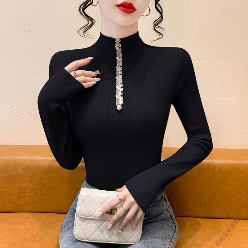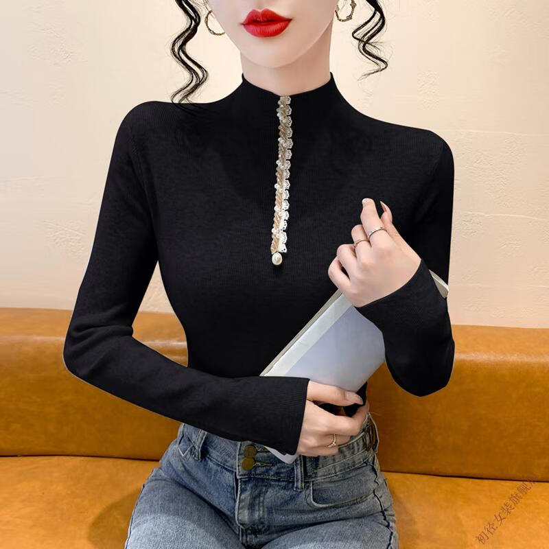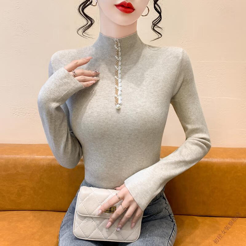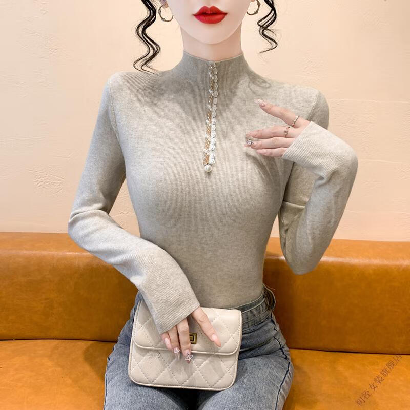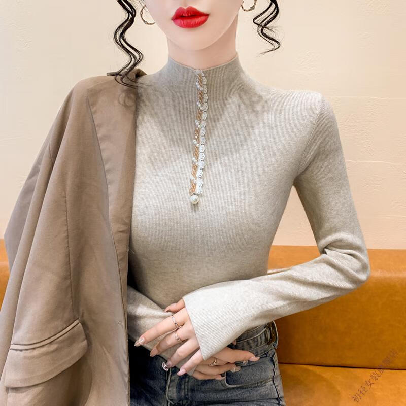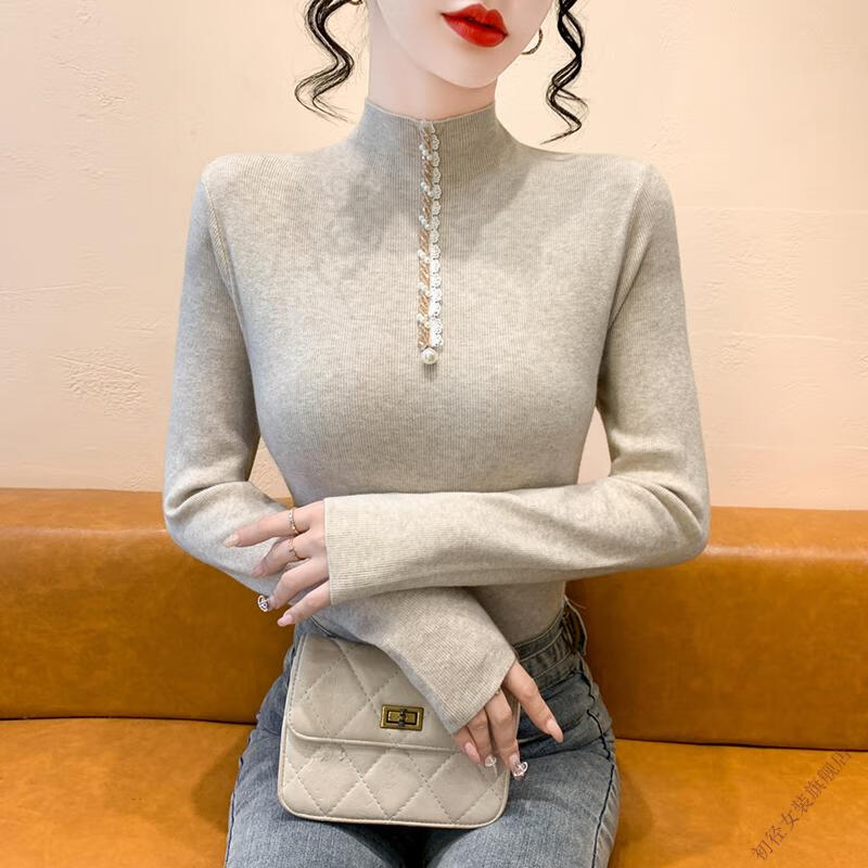 Early diameter studded semi-turtle collar long-sleeved knitted bottoming shirt for women, autumn and winter 2025 new style, slim-fitting inner top, fashionable oatmeal color S