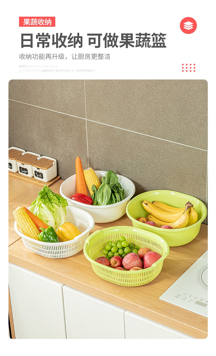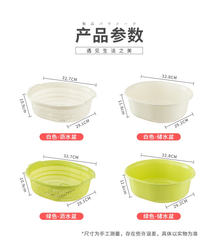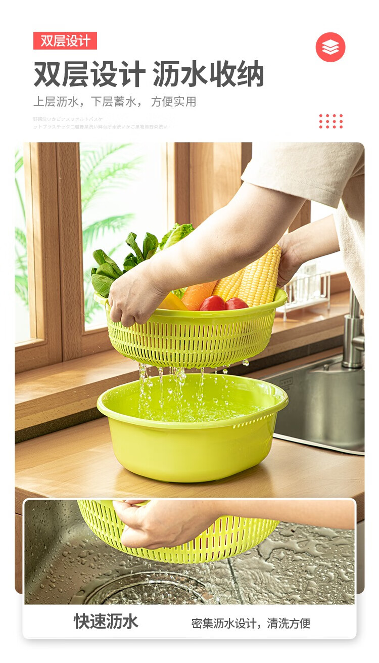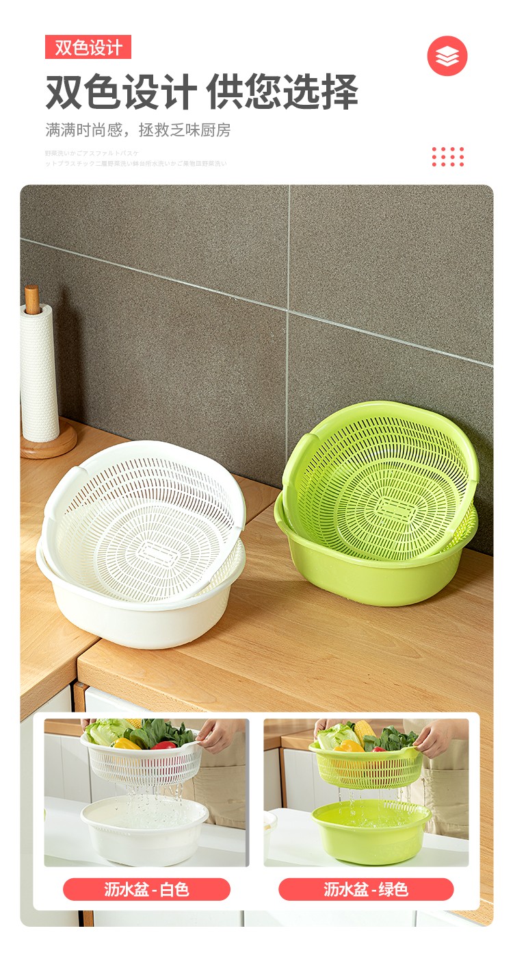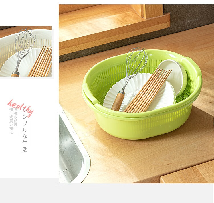 Sungsa Japan imported double-layer plastic sink large vegetable basket fruit basket kitchen hollow draining dish storage basket green set basin + draining basket