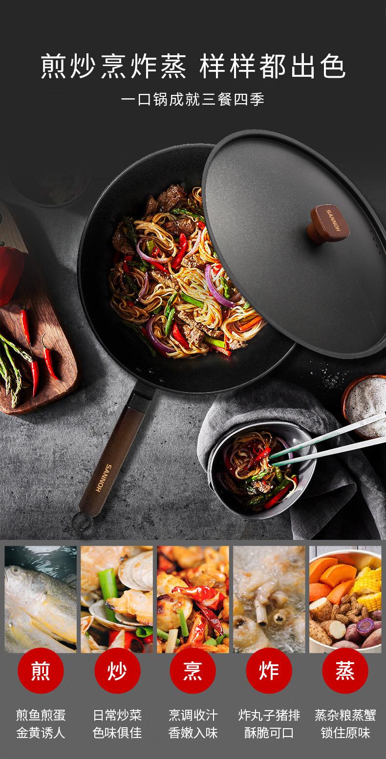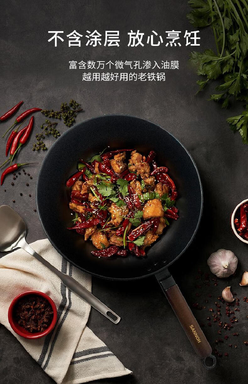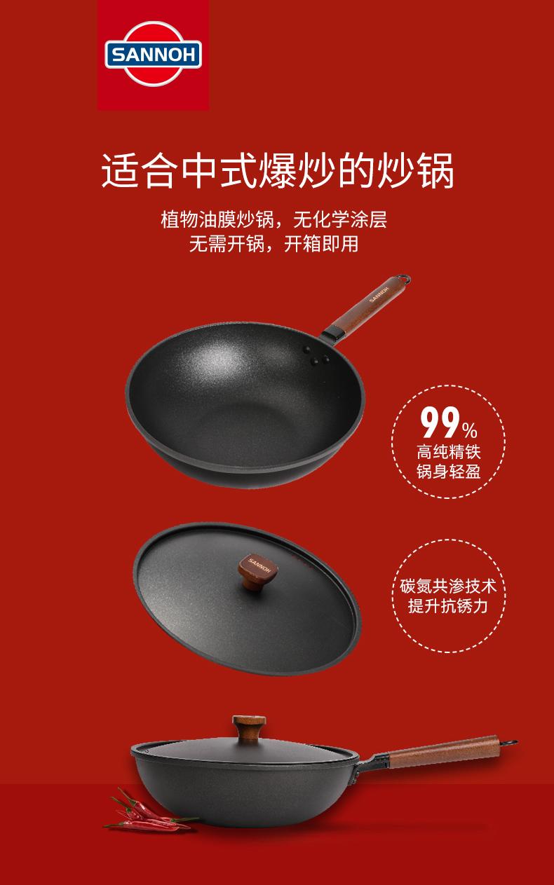 Sanno Industrial (SANNOH) no-opening Japanese uncoated household Japanese-style extremely iron pot 32cm stir-fry pot anti-scalding with lid original iron pot + iron lid + silicone spatula 32cm