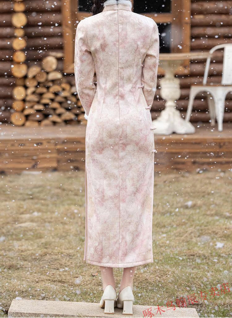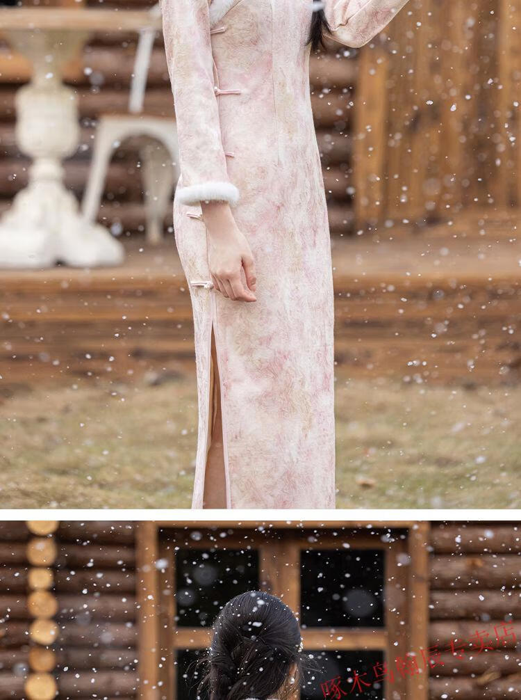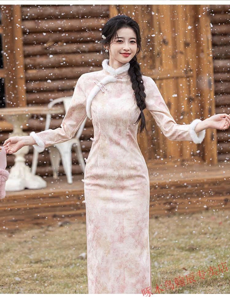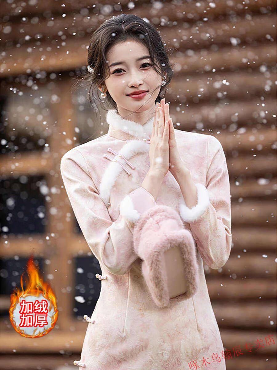 Woodpecker pink new Chinese style cheongsam 2025 new autumn and winter slim fit high-end temperament young girl fairy daily pink plus velvet thick L