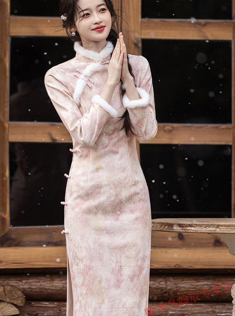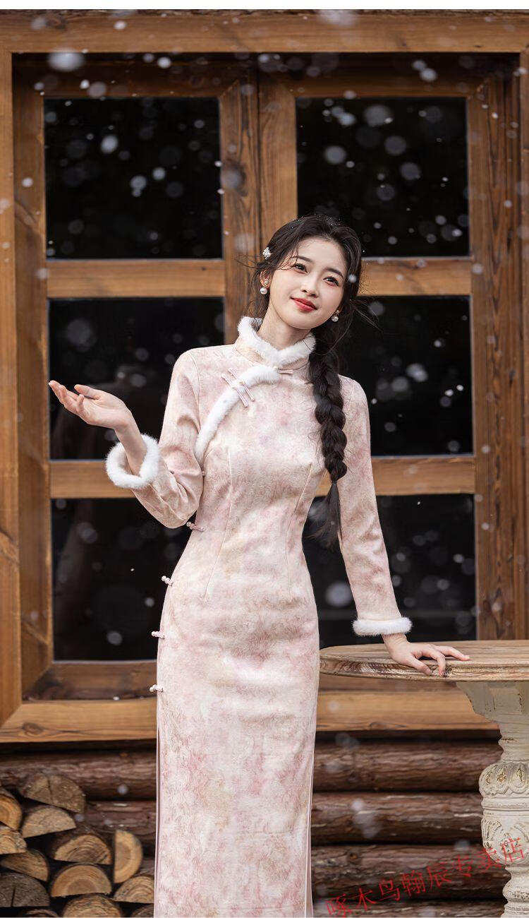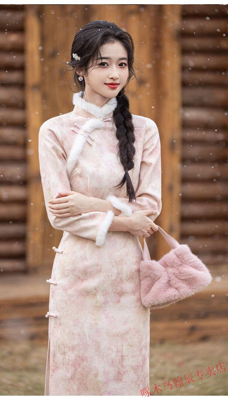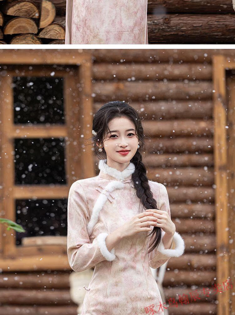 Woodpecker pink new Chinese style cheongsam 2025 new autumn and winter slim fit high-end temperament young girl fairy daily pink plus velvet thick L