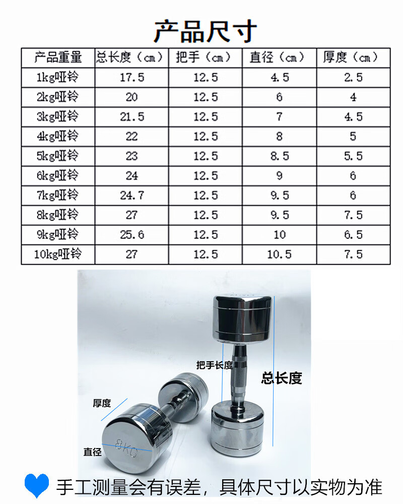 He Jiagong high quality pure steel electroplated small dumbbells women's personal training studio men's fitness 3kg 8kg 10kg fixed dumbbells 1kg pure steel dumbbells * 2 pieces total weight 2kg more