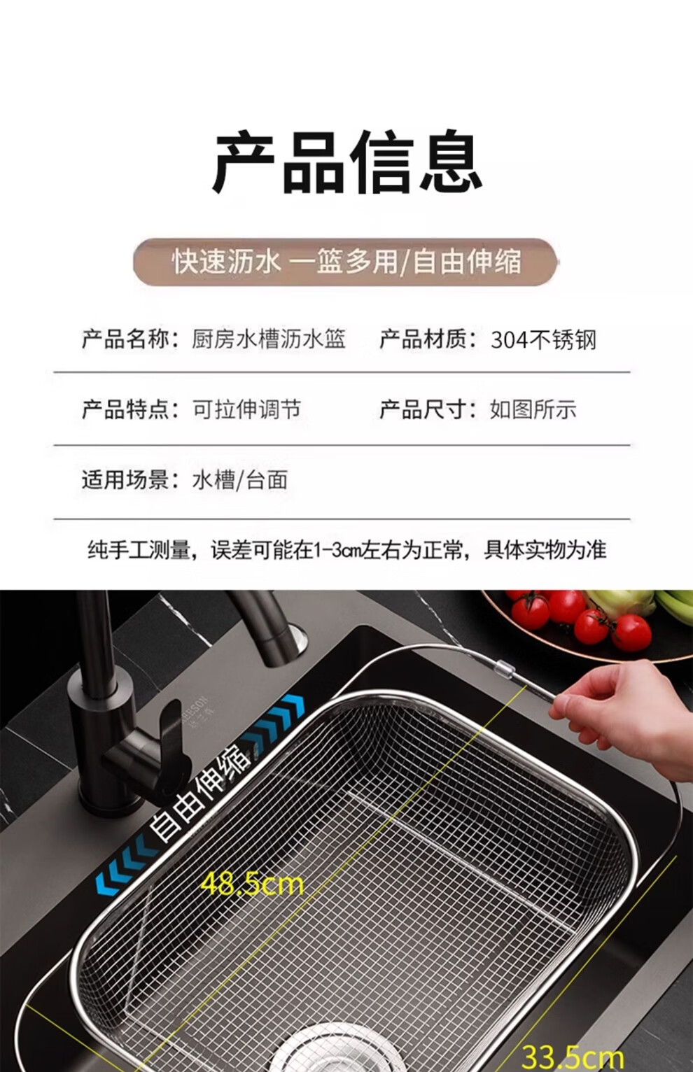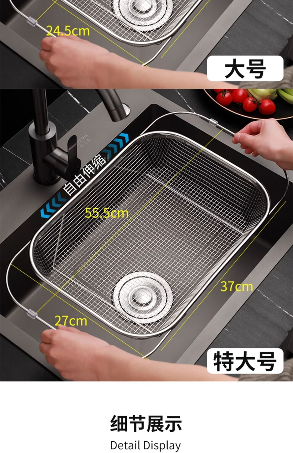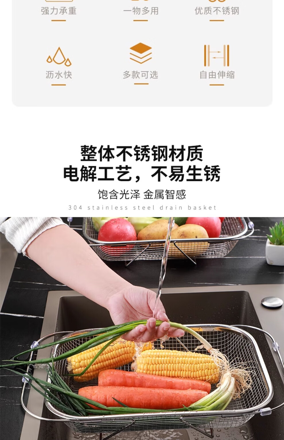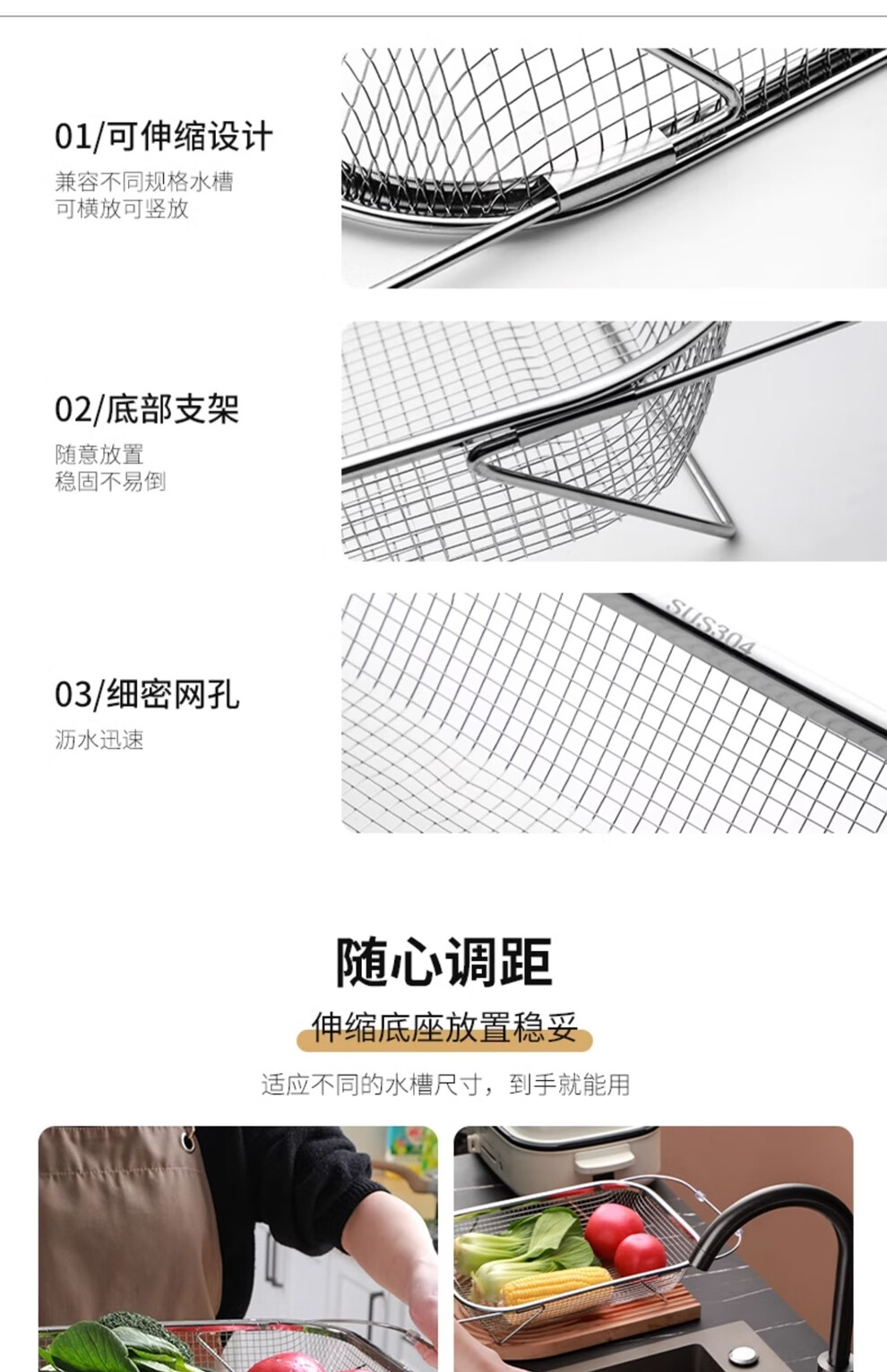 Riheshengtang stainless steel sink drain basket kitchen sink retractable washbasin drain rack multi-functional tableware and chopsticks drain rack large size 304 retractable drain basket