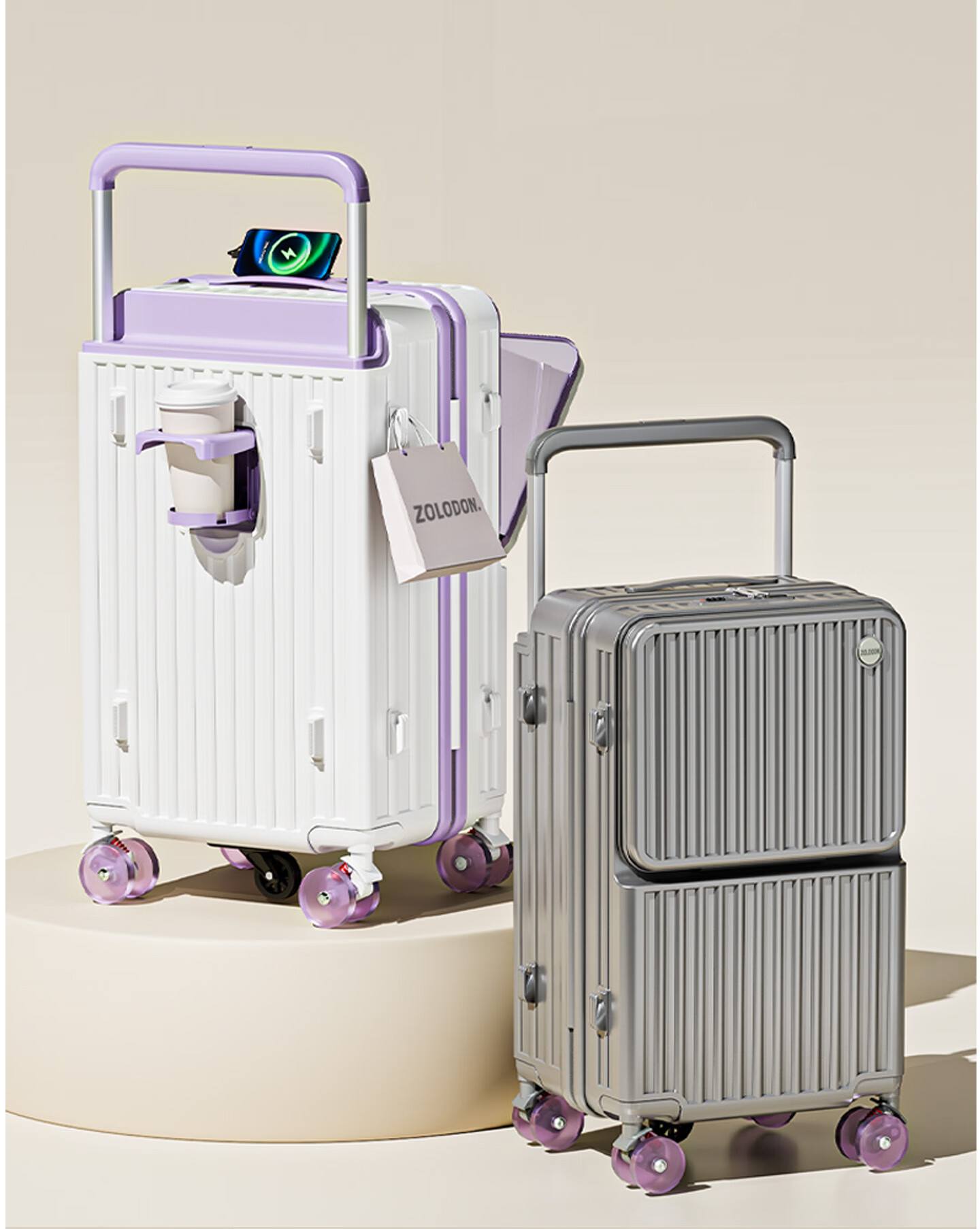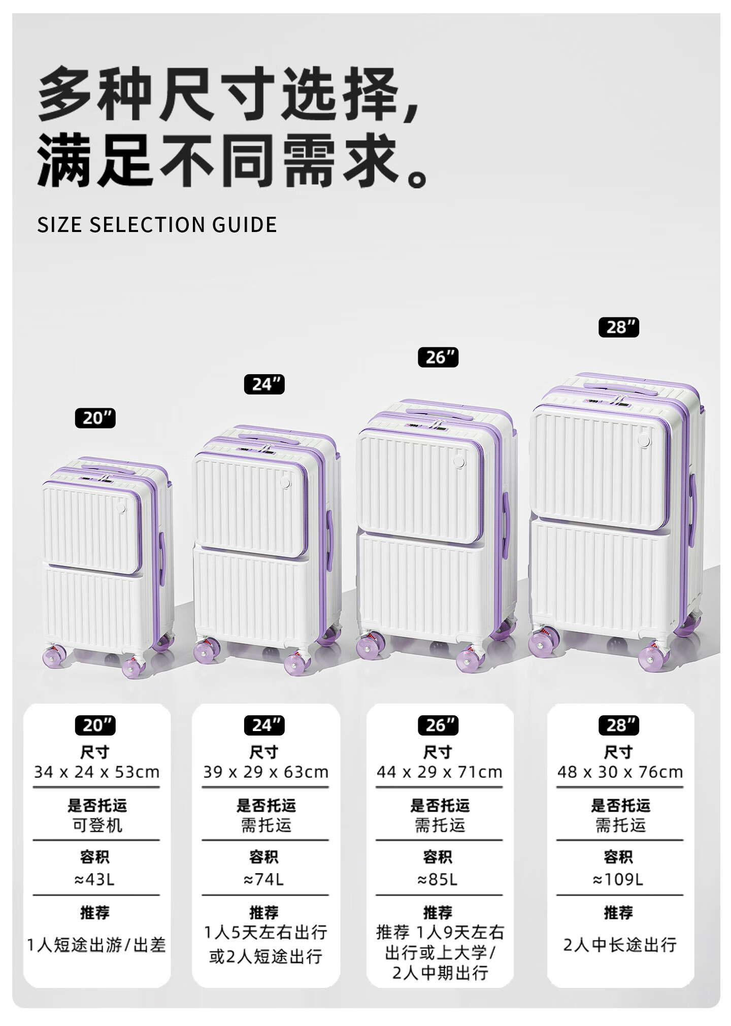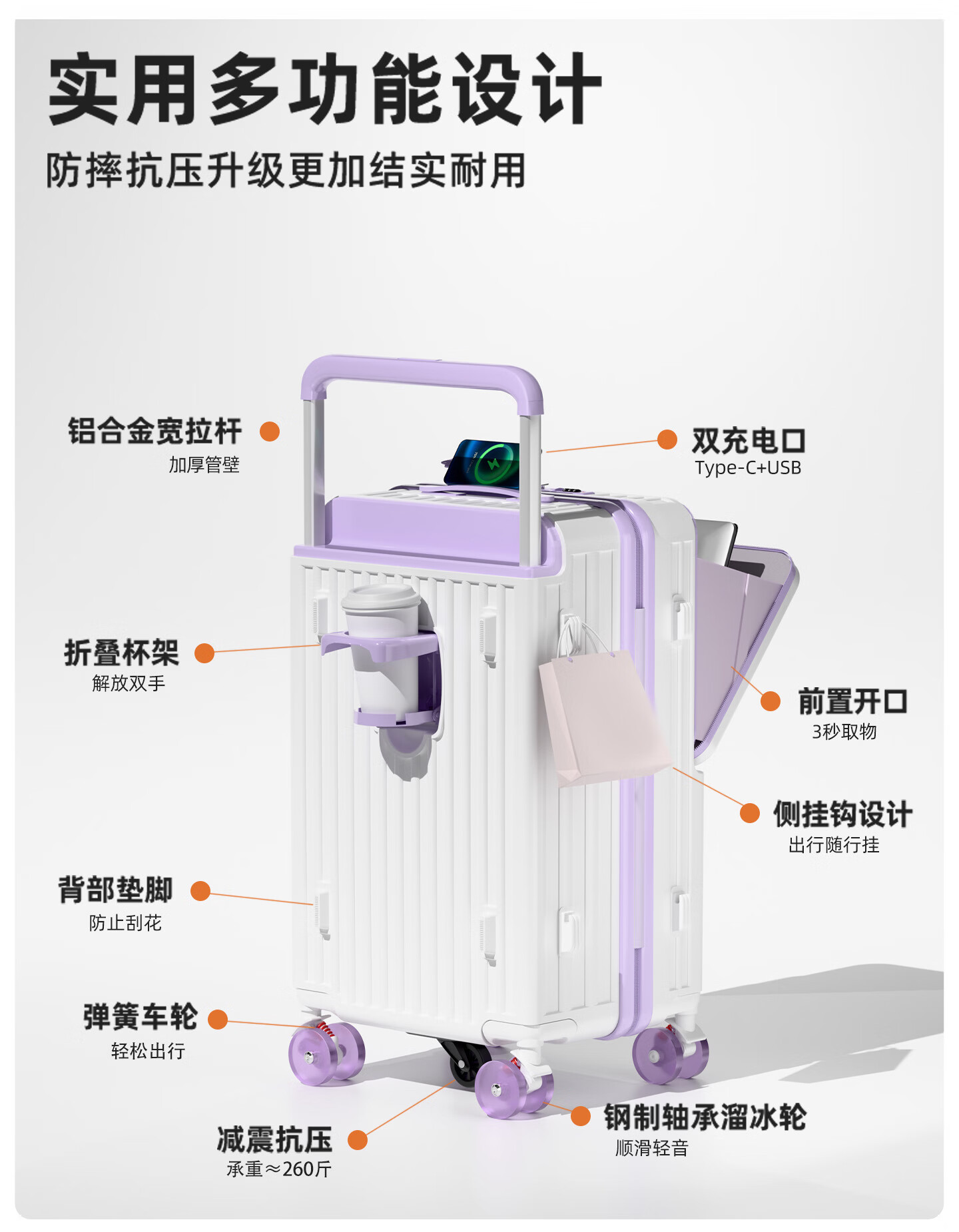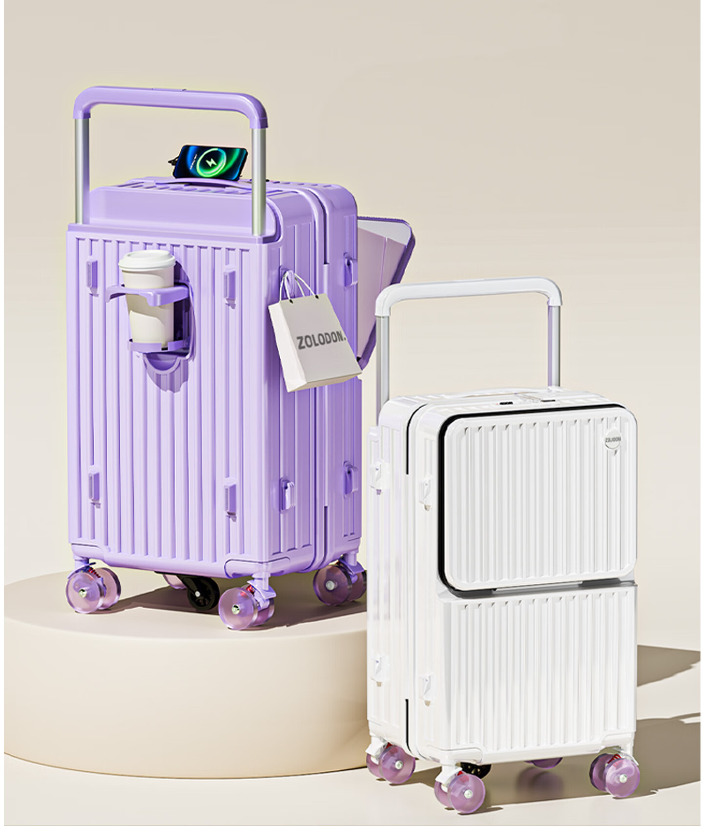 ZOLODON front-opening large-capacity skate wheel suitcase 2025 new 20-inch boarding case password box suitcase trolley case foggy purple white silent skate wheel + thickened PC material + computer can be placed 20 inches wide trolley + explosion-proof zipper + shock-absorbing four-wheel universal wheel