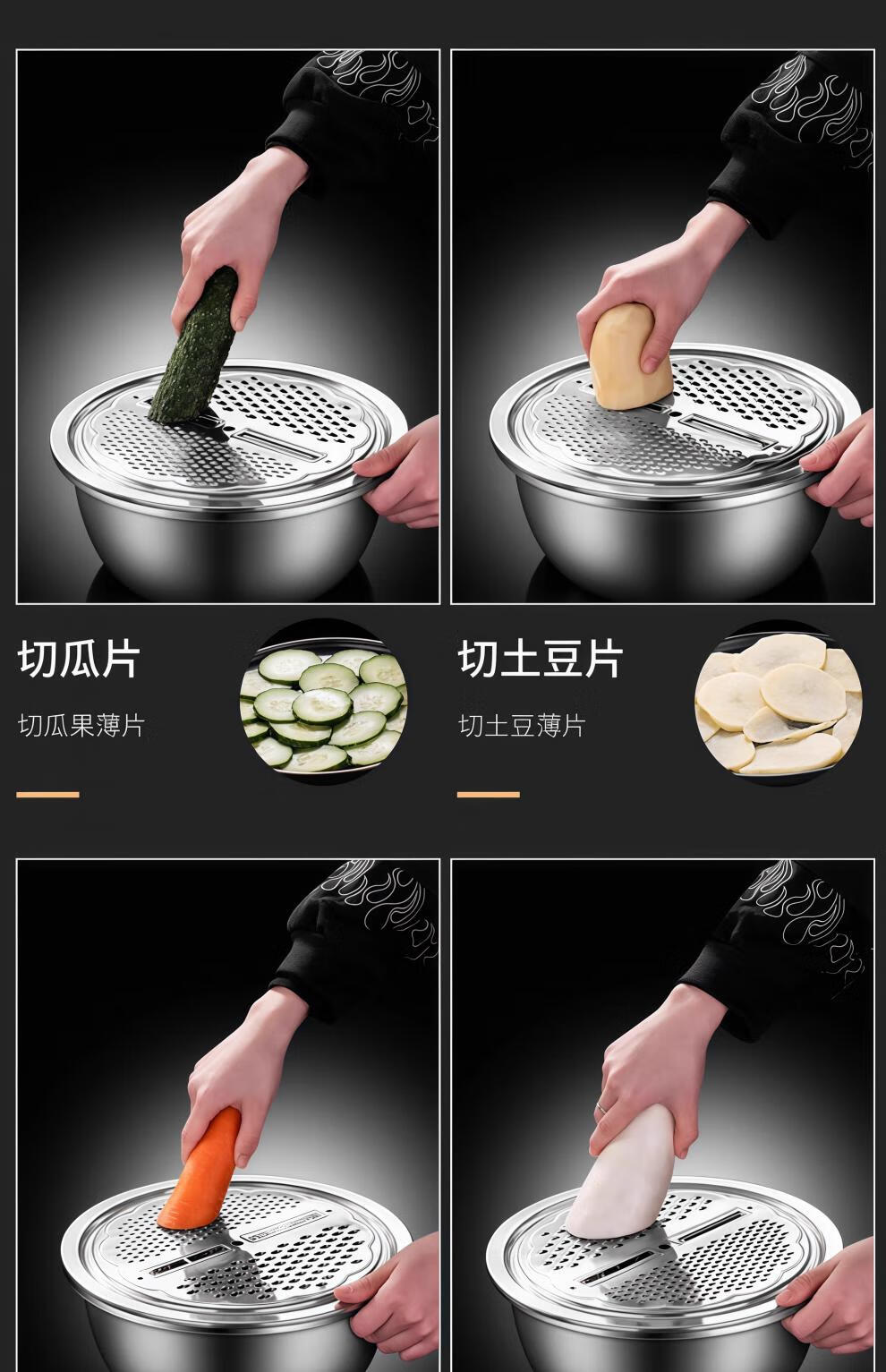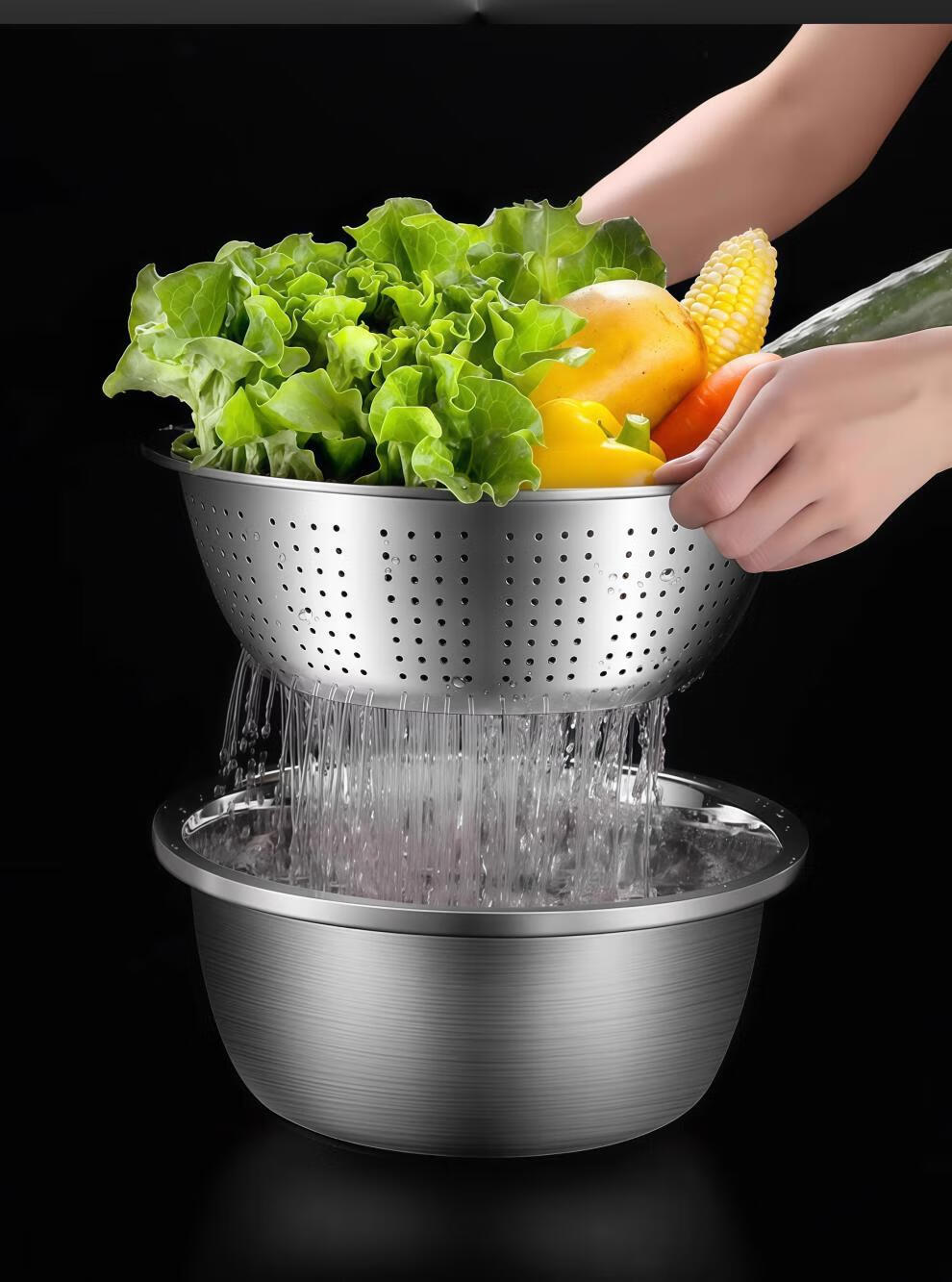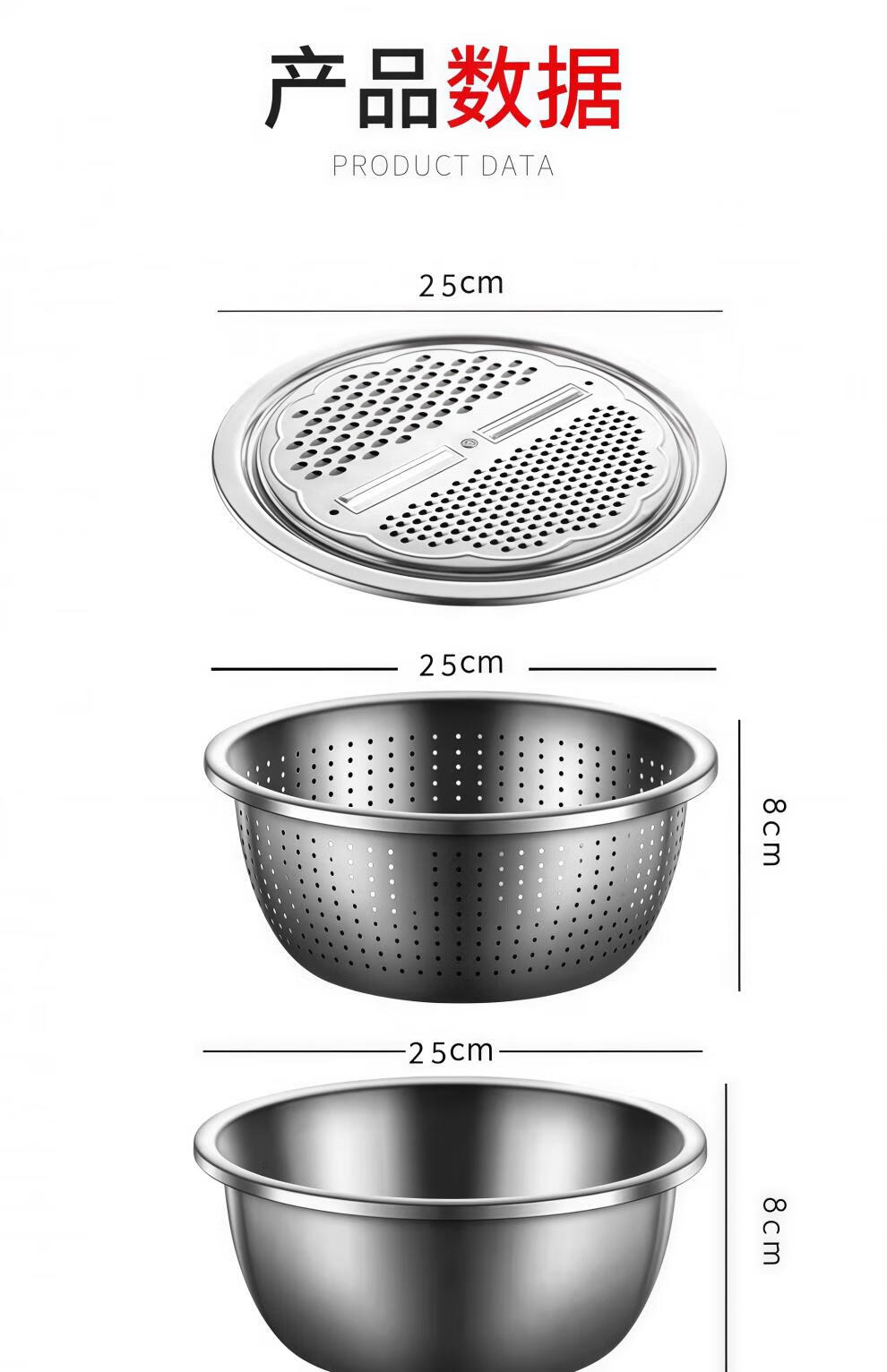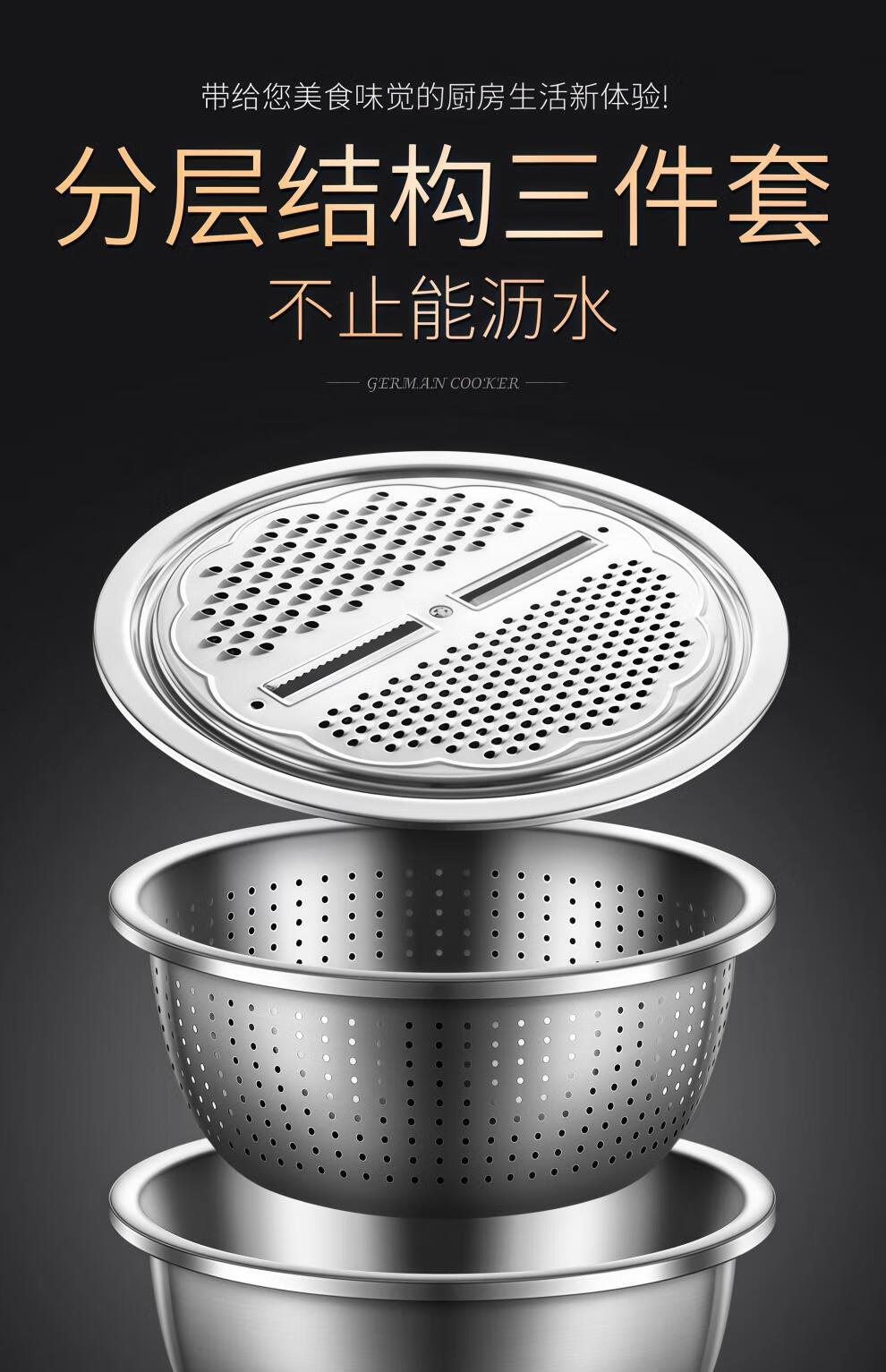 Stainless steel grater of the same style as Fat Donglai, vegetable cutting basin, multi-functional stainless steel food-grade grating plate, potato slices, vegetable radish, food-grade stainless steel three-piece set, basin + drain basin + grating plate