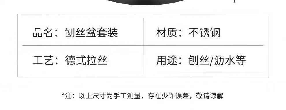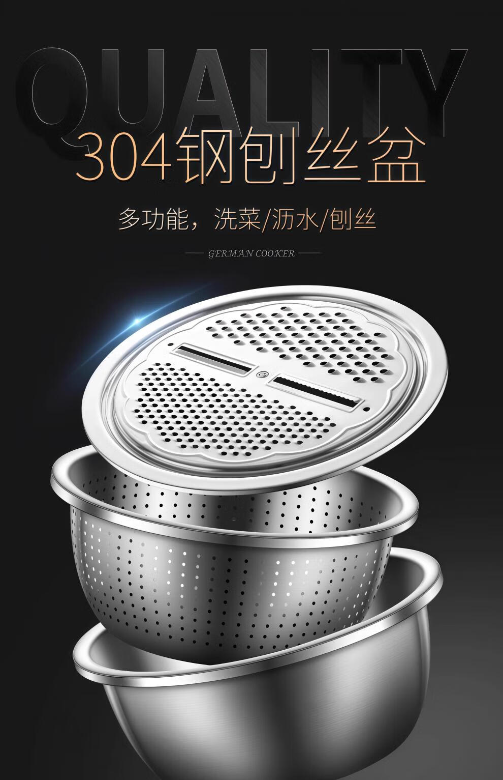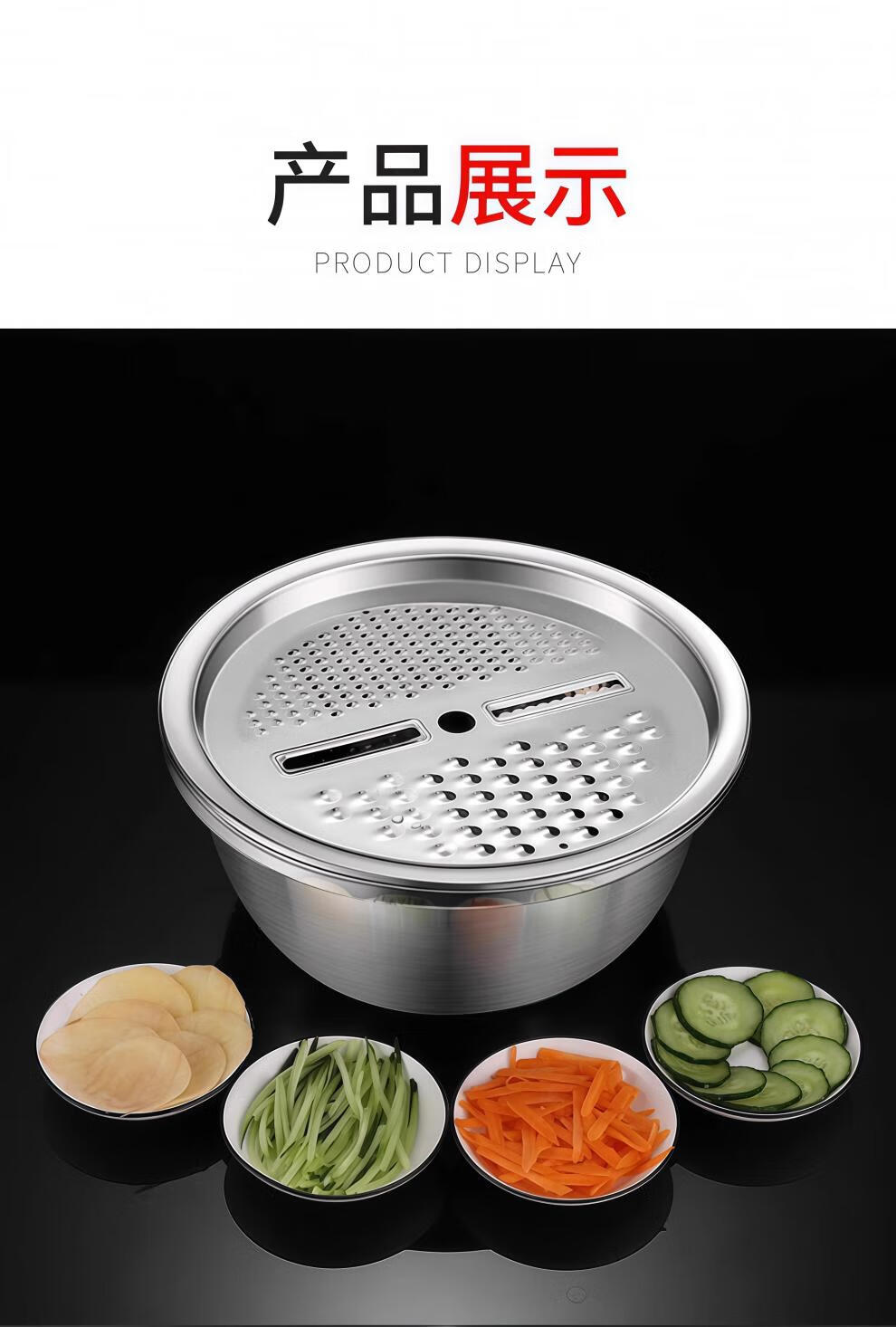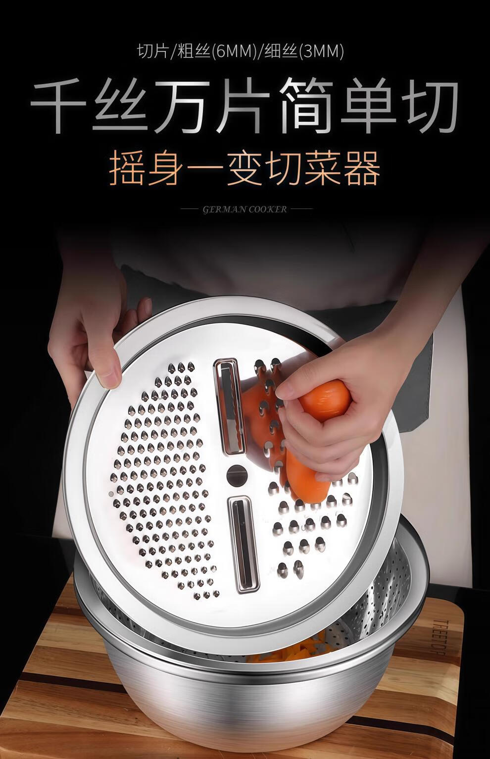 Stainless steel grater of the same style as Fat Donglai, vegetable cutting basin, multi-functional stainless steel food-grade grating plate, potato slices, vegetable radish, food-grade stainless steel three-piece set, basin + drain basin + grating plate