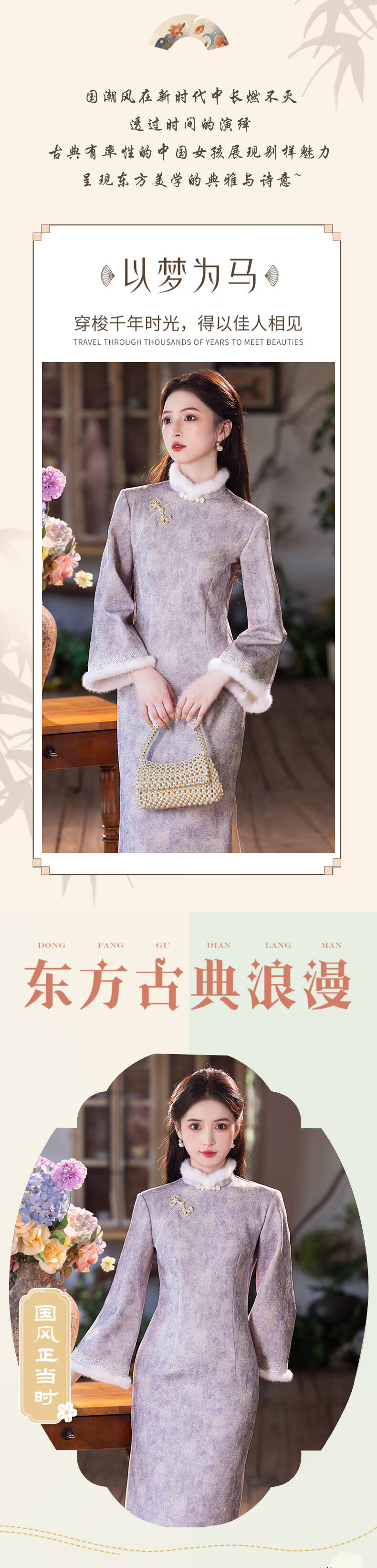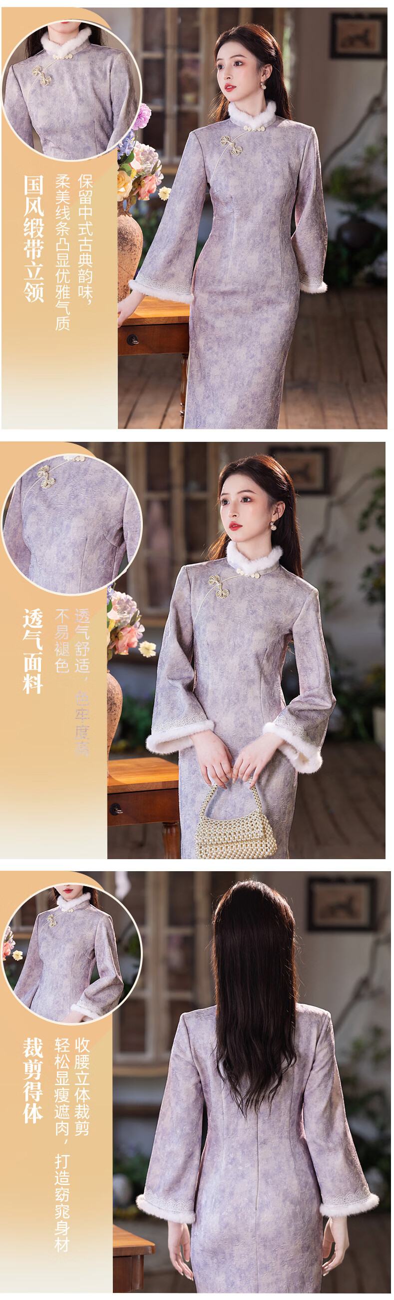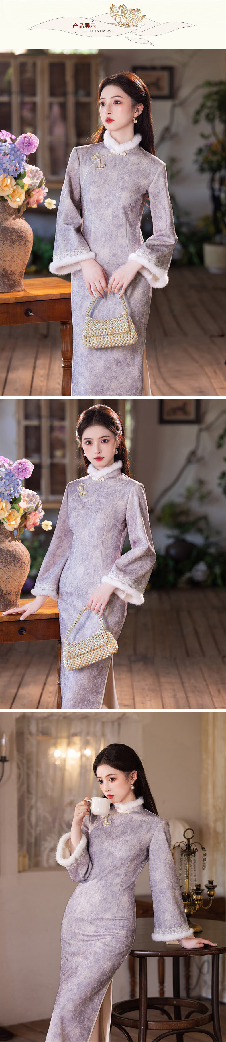 Du Yanzhi 2025 winter new style jacquard composite super soft plus velvet thickened long cheongsam light purple noble and elegant temperament cheongsam light purple plus velvet L 100-110 catties (height standard of 1.6 meters)