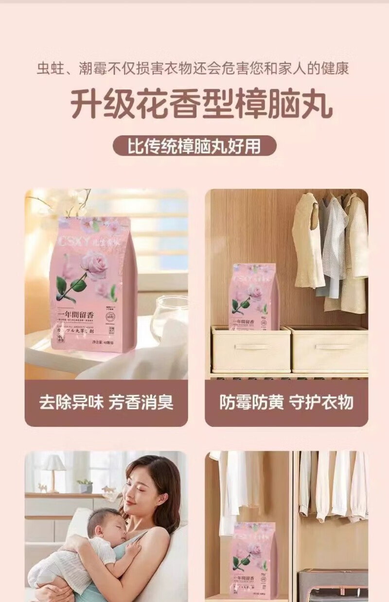 Floral scented mothballs, wardrobe deodorizing and fragrant clothes, insect repellent and mildew proof package, anti-cockroach ball, anti-moth tablets and mite removal tablets, upgraded rose scent 1 bag/48 packs