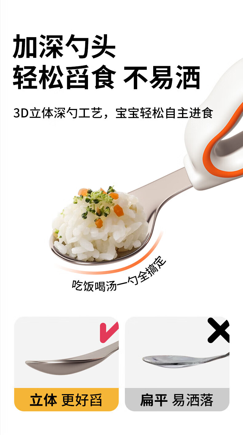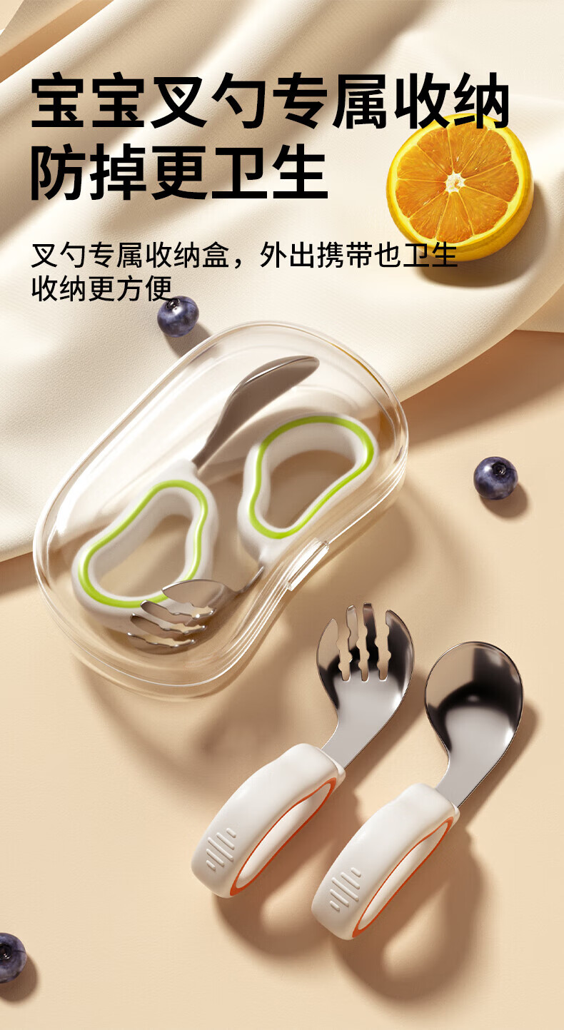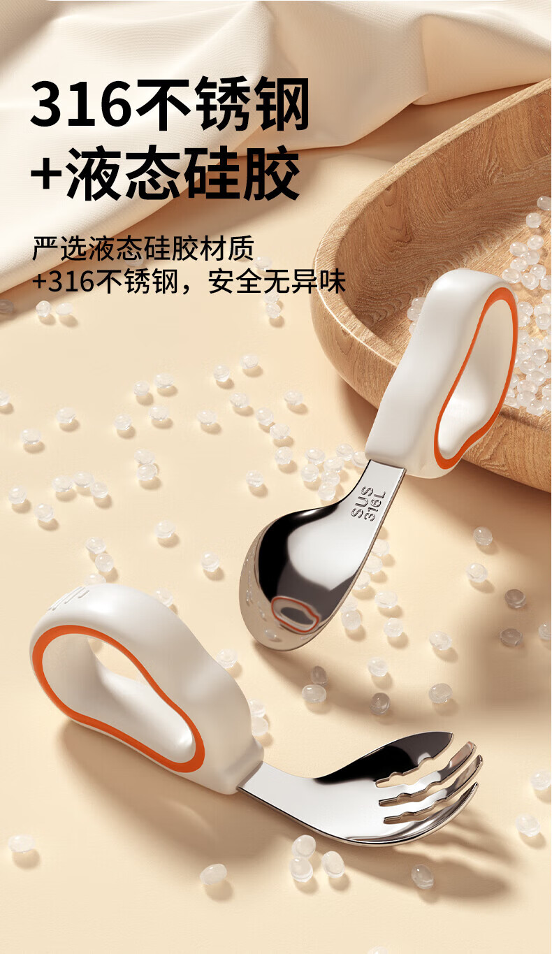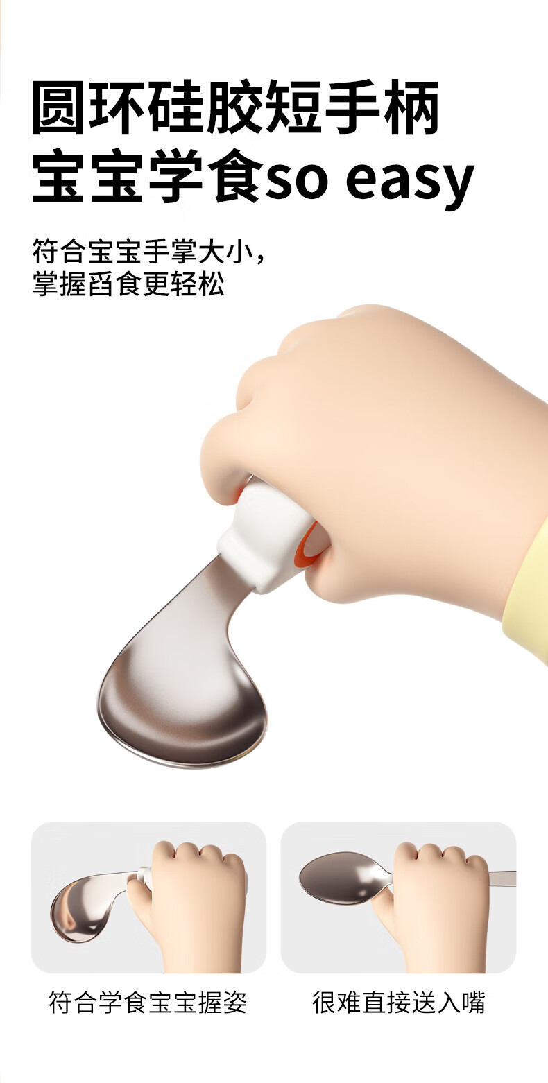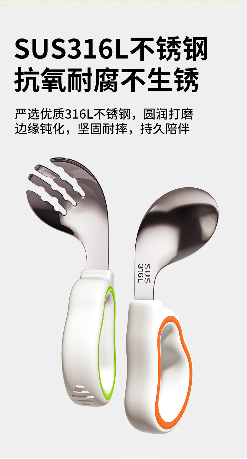 He Jiangong German baby independent eating spoon learning to eat training one-year-old baby learning to eat children's stainless steel tableware food supplement 1 316L material_curved handle design spoon and fork set