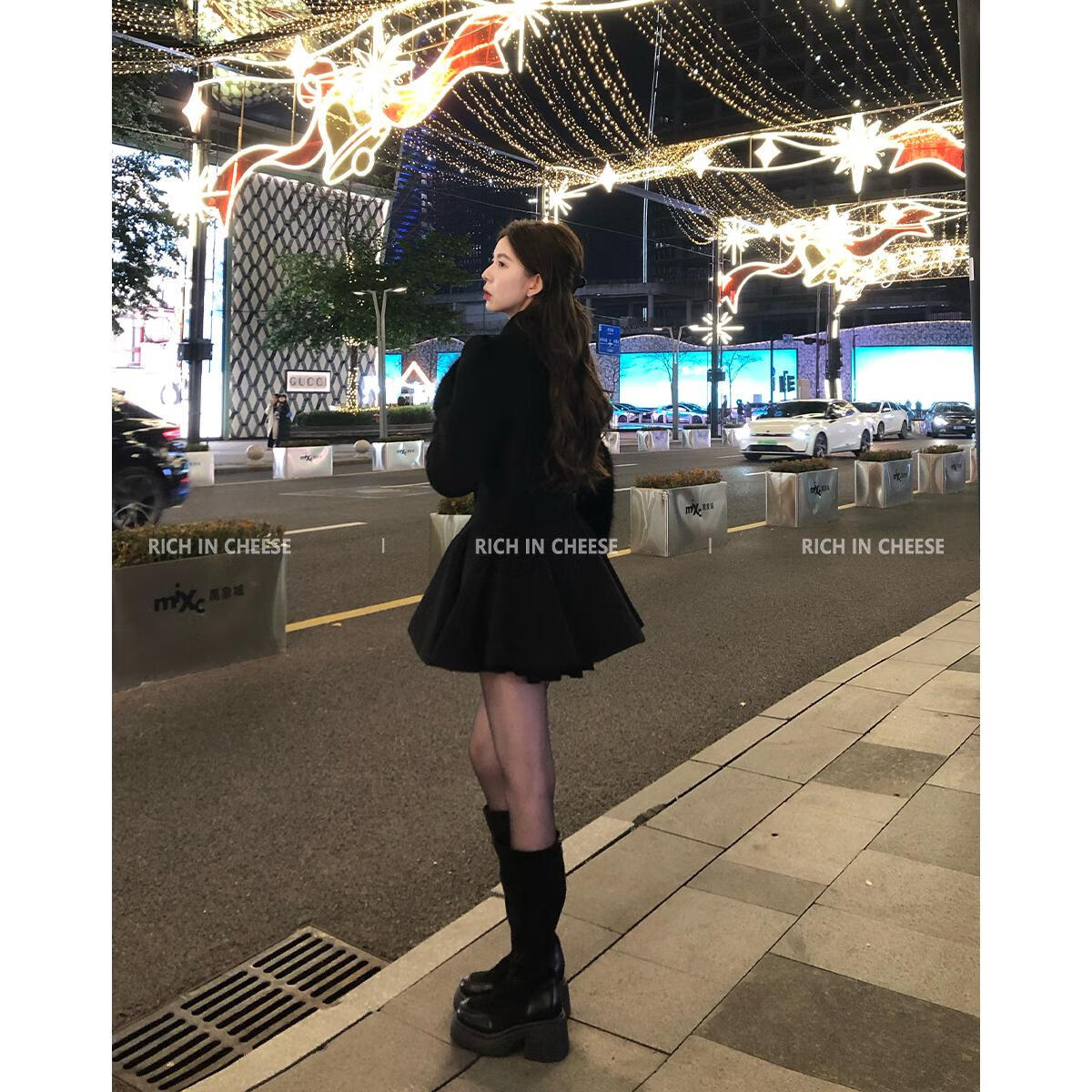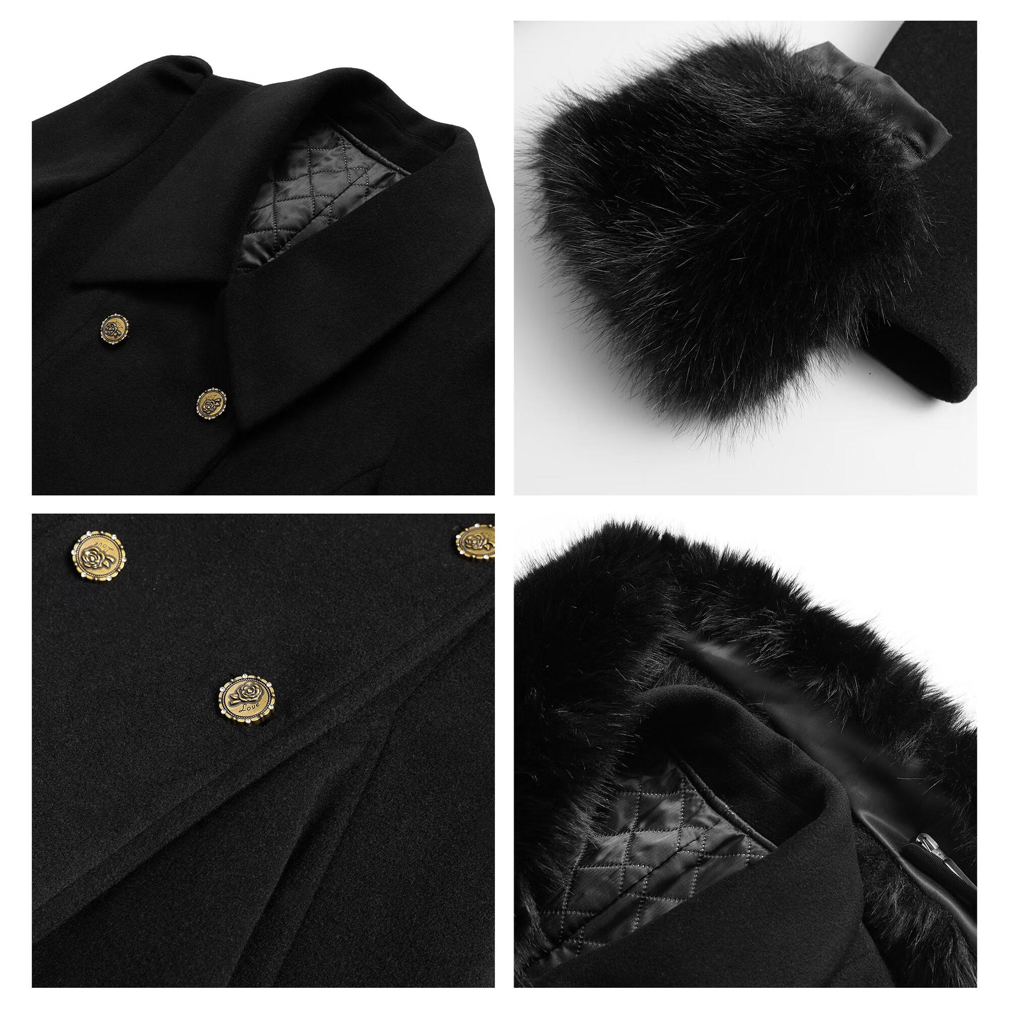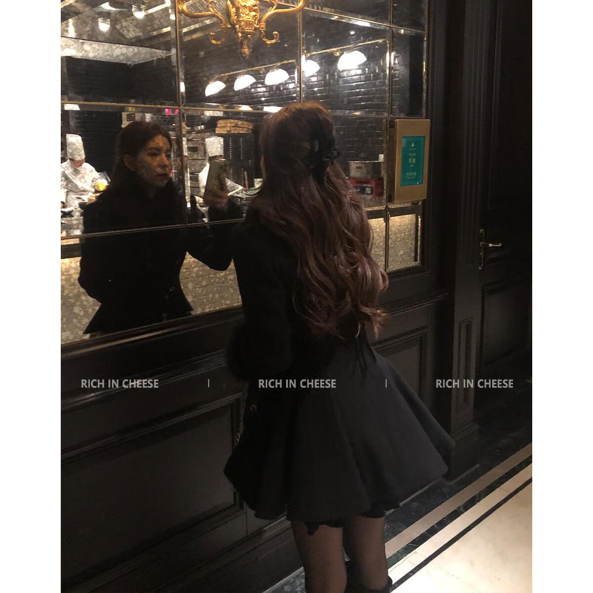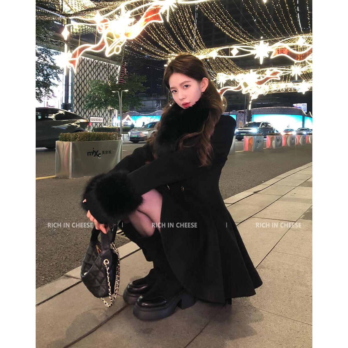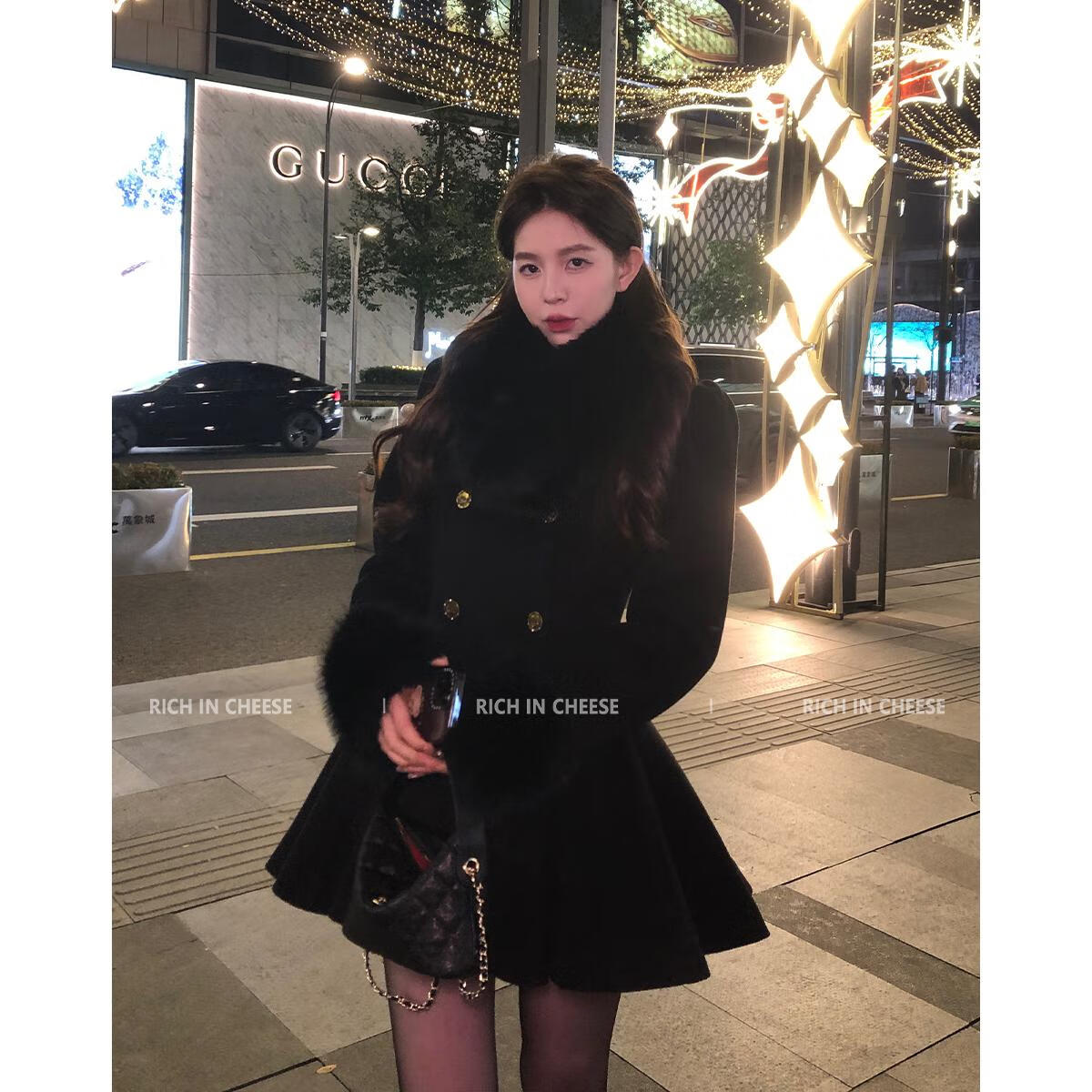 RICH IN CHEESE Shu Hulei, a well-known daughter, fur collar double-breasted quilted woolen coat for women, winter waist slimming fashionable coat, black (fur collar and cuffs are detachable) S (within 100 pounds)