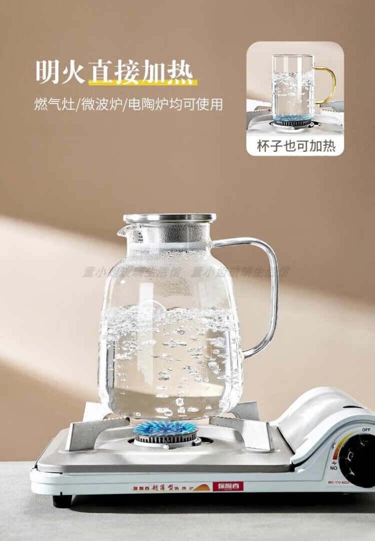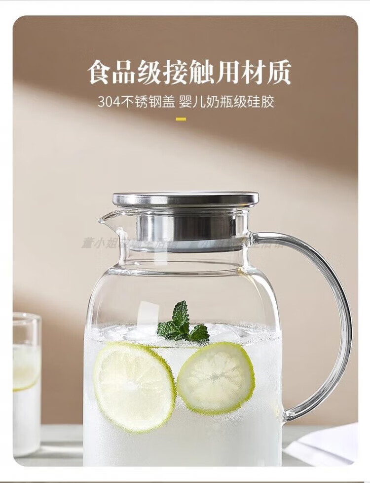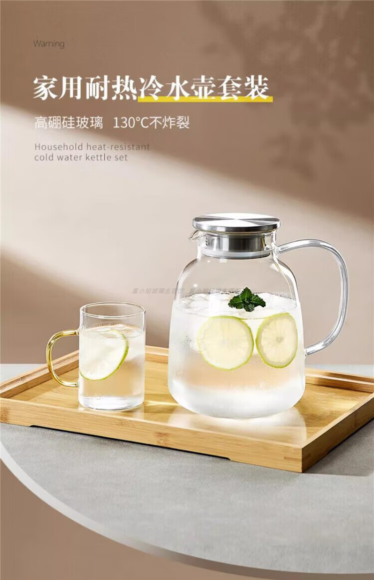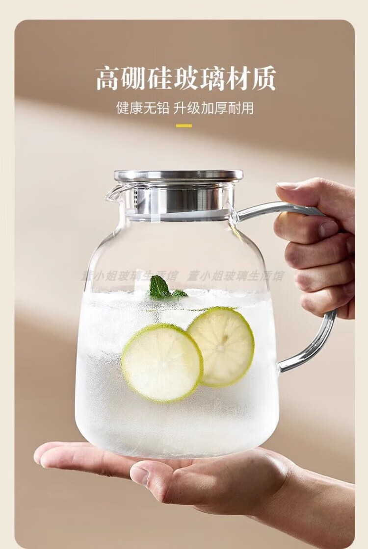 He Jiangong German brand glass cold water kettle, high temperature resistant cold water kettle, summer household large-capacity cold water cup set, anti-explosion, fat pot + stainless steel lid, boiling water directly into 1800ml