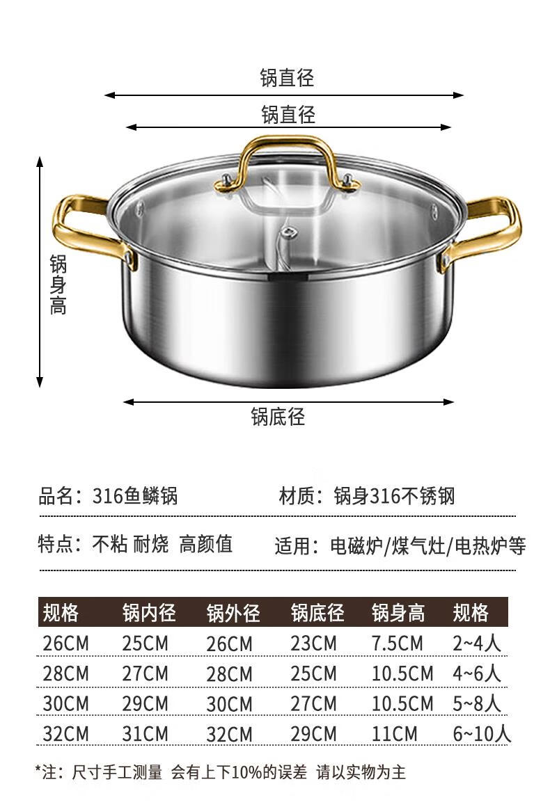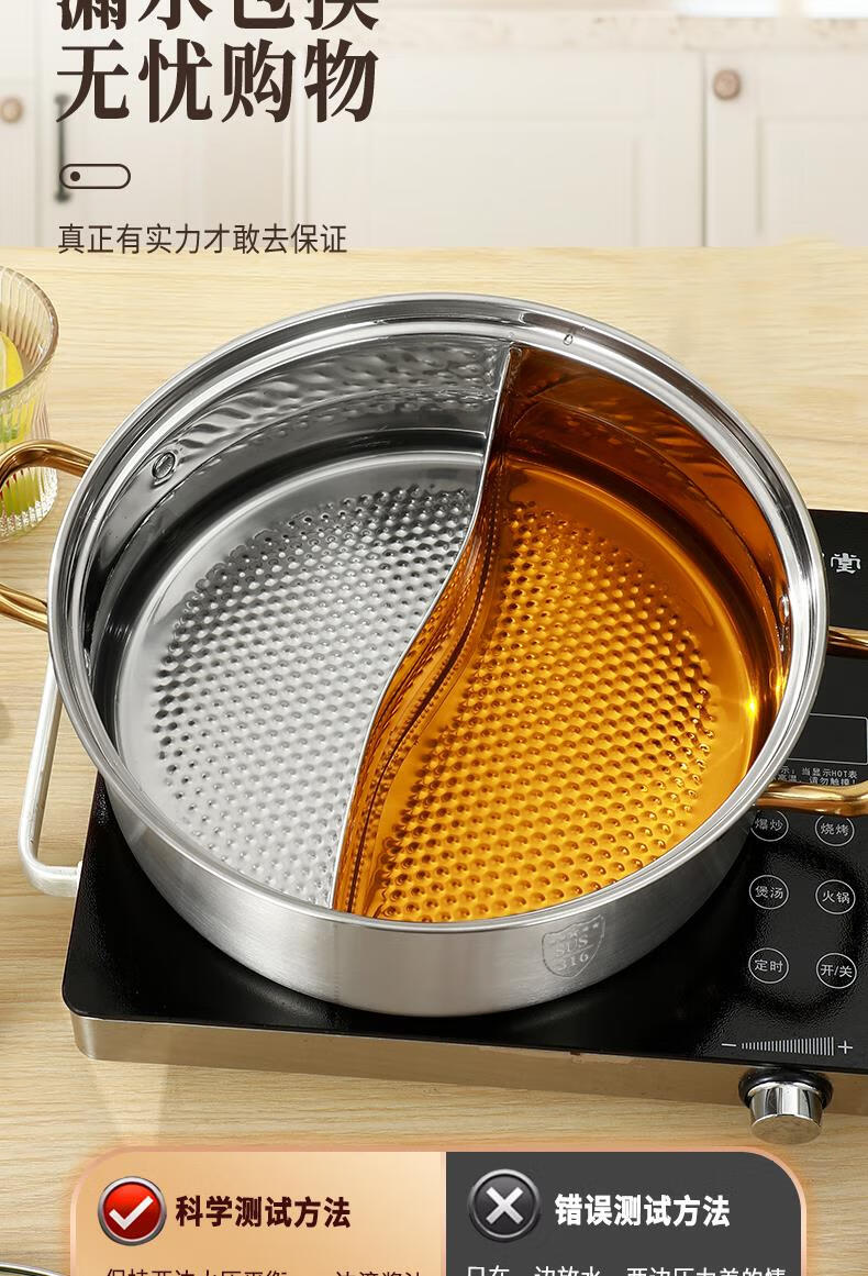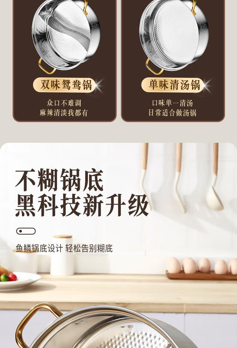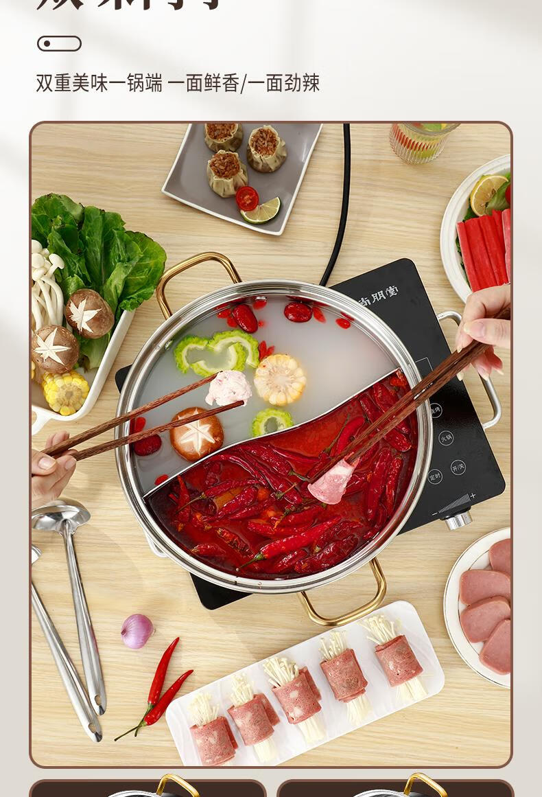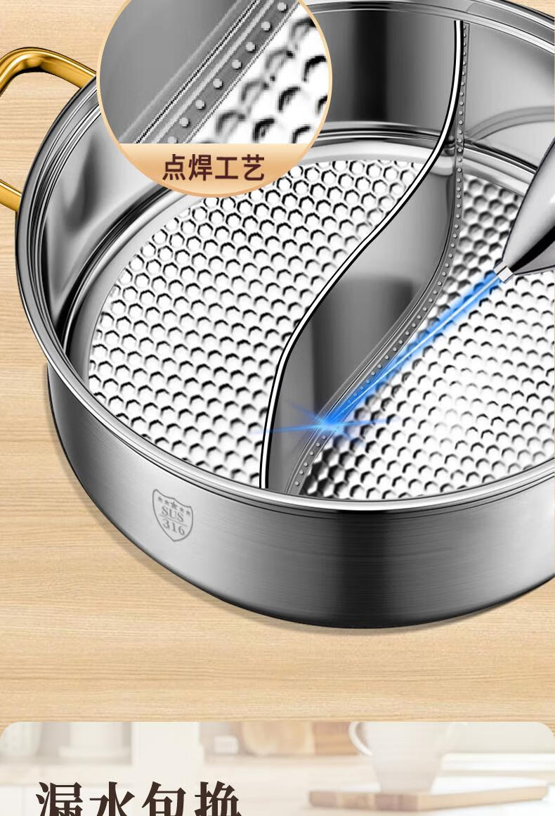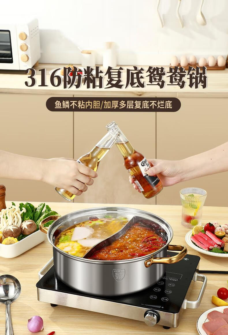 Fat Donglai's same style 316 stainless steel mandarin duck pot hot pot household induction cooker thickened special hot pot pot pot thickened 316 mandarin duck pot suitable for 6-10 people comes with a soup spoon and a colander 32cm