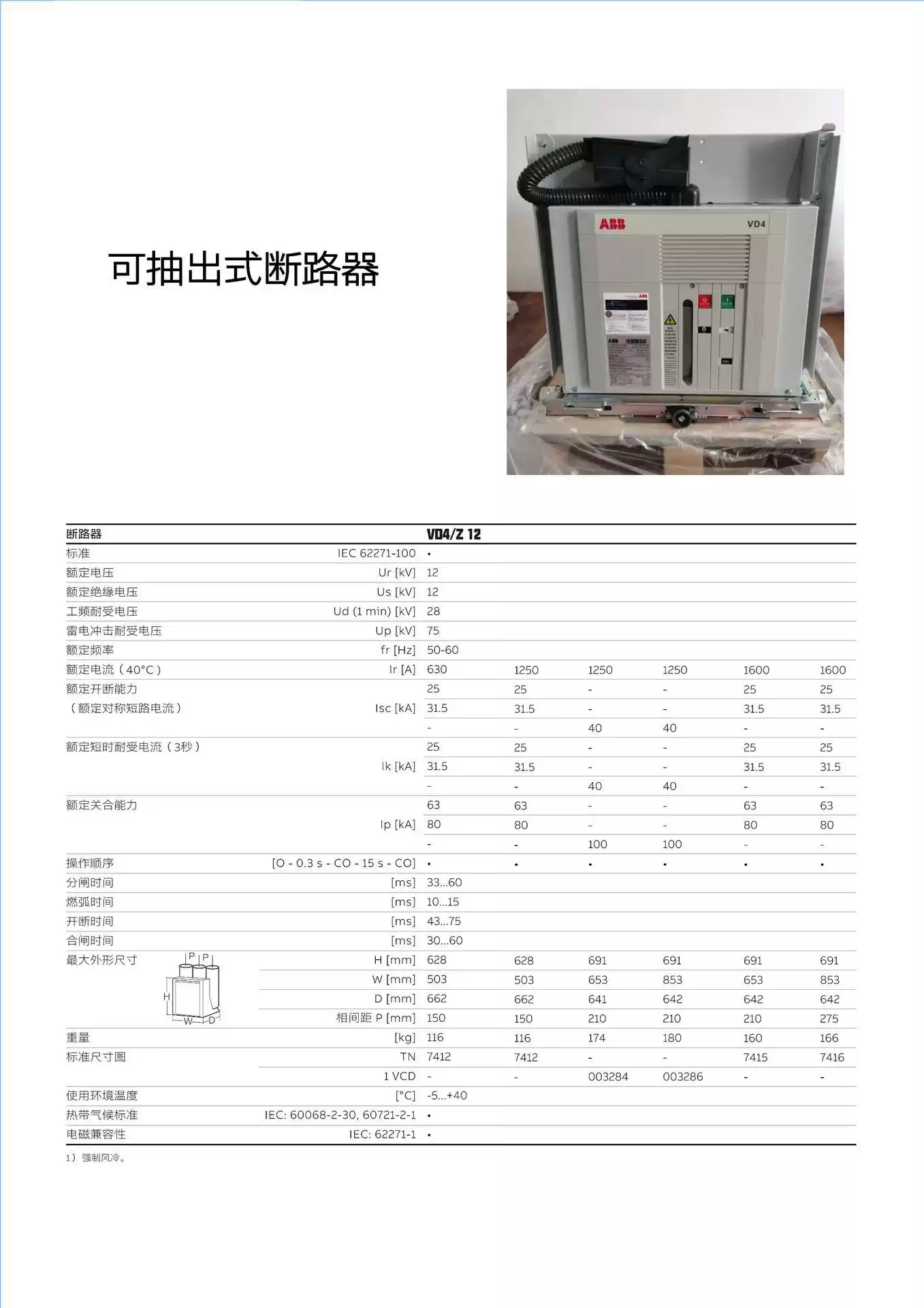 ABB medium voltage vacuum circuit breaker VD4/P12.12.4012.16.25P210P275PTNST VD4/P12.06.25P150PTNST
