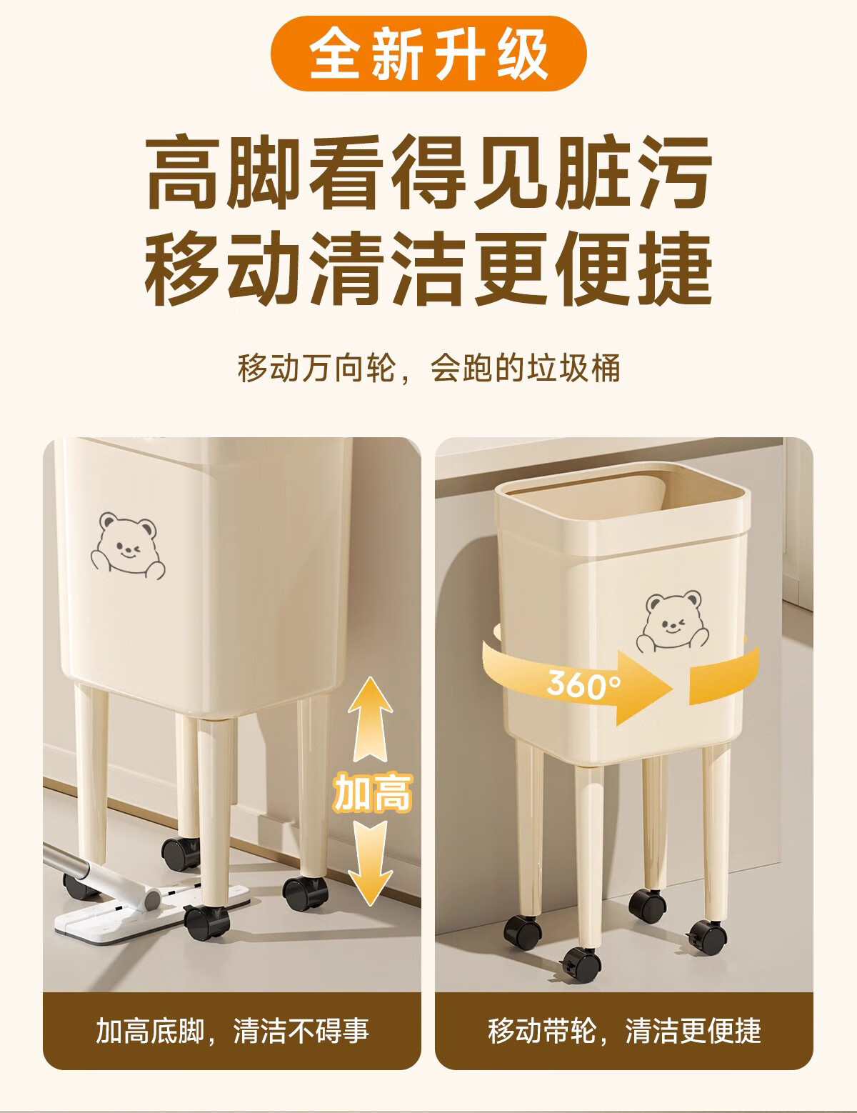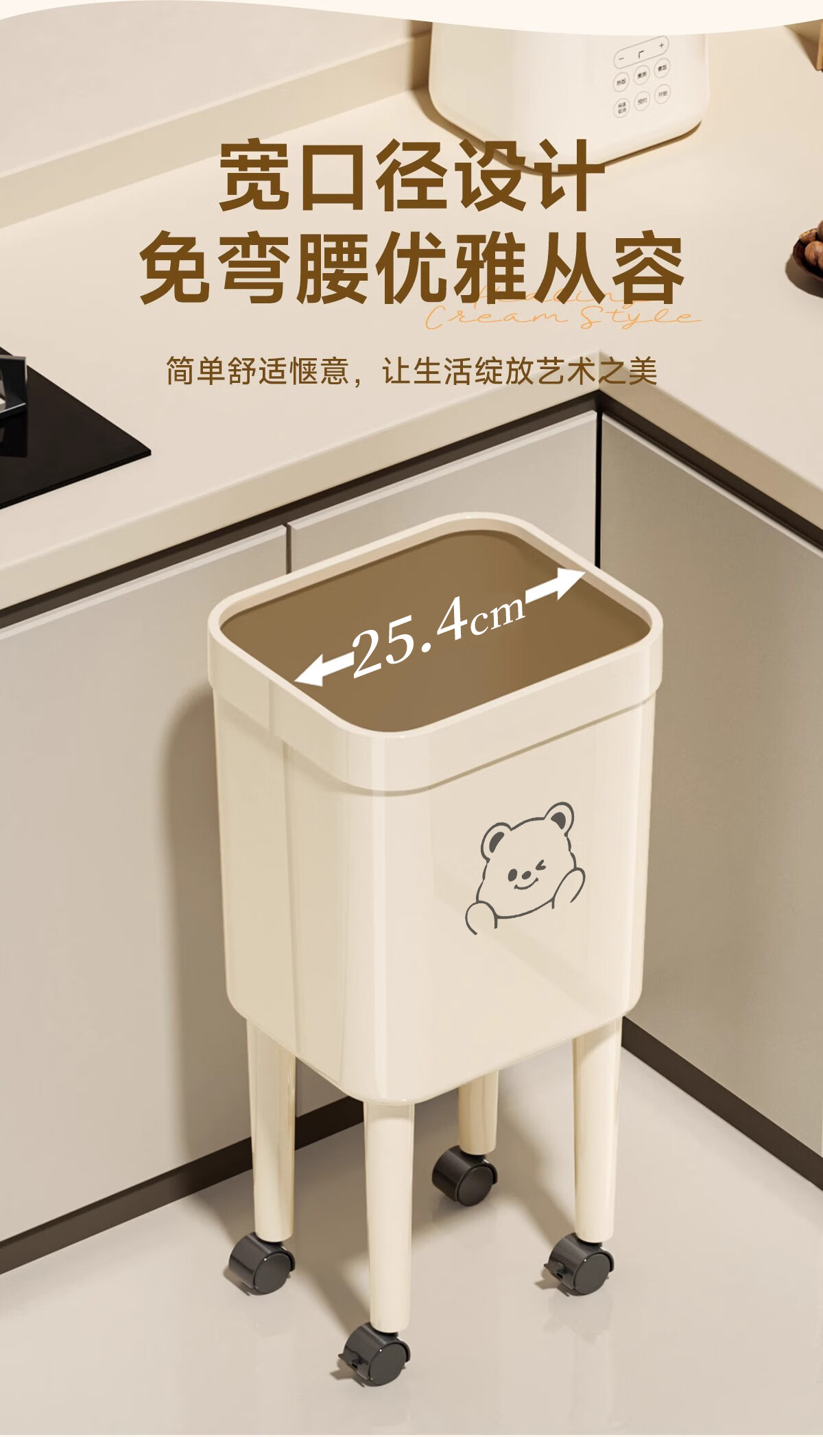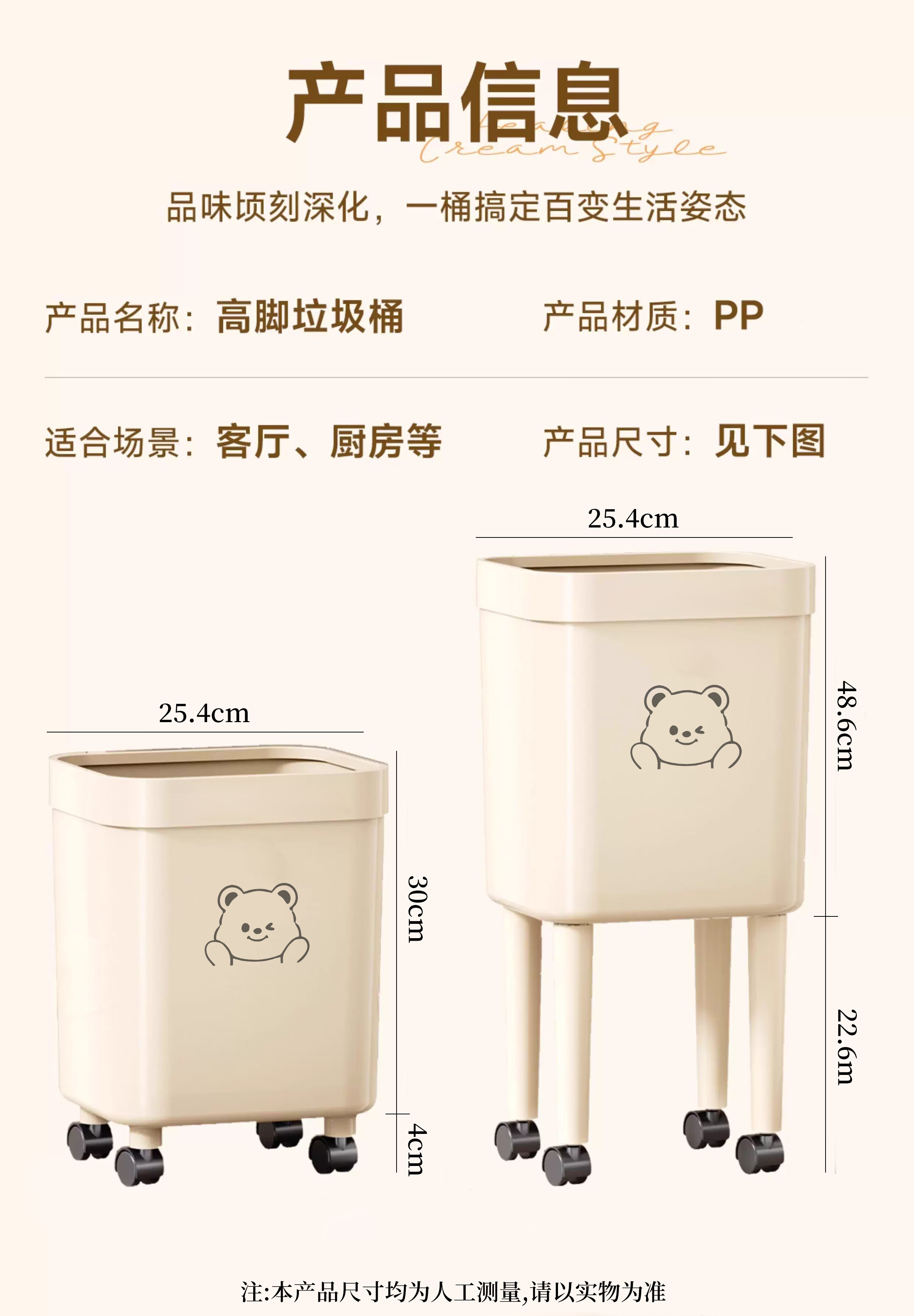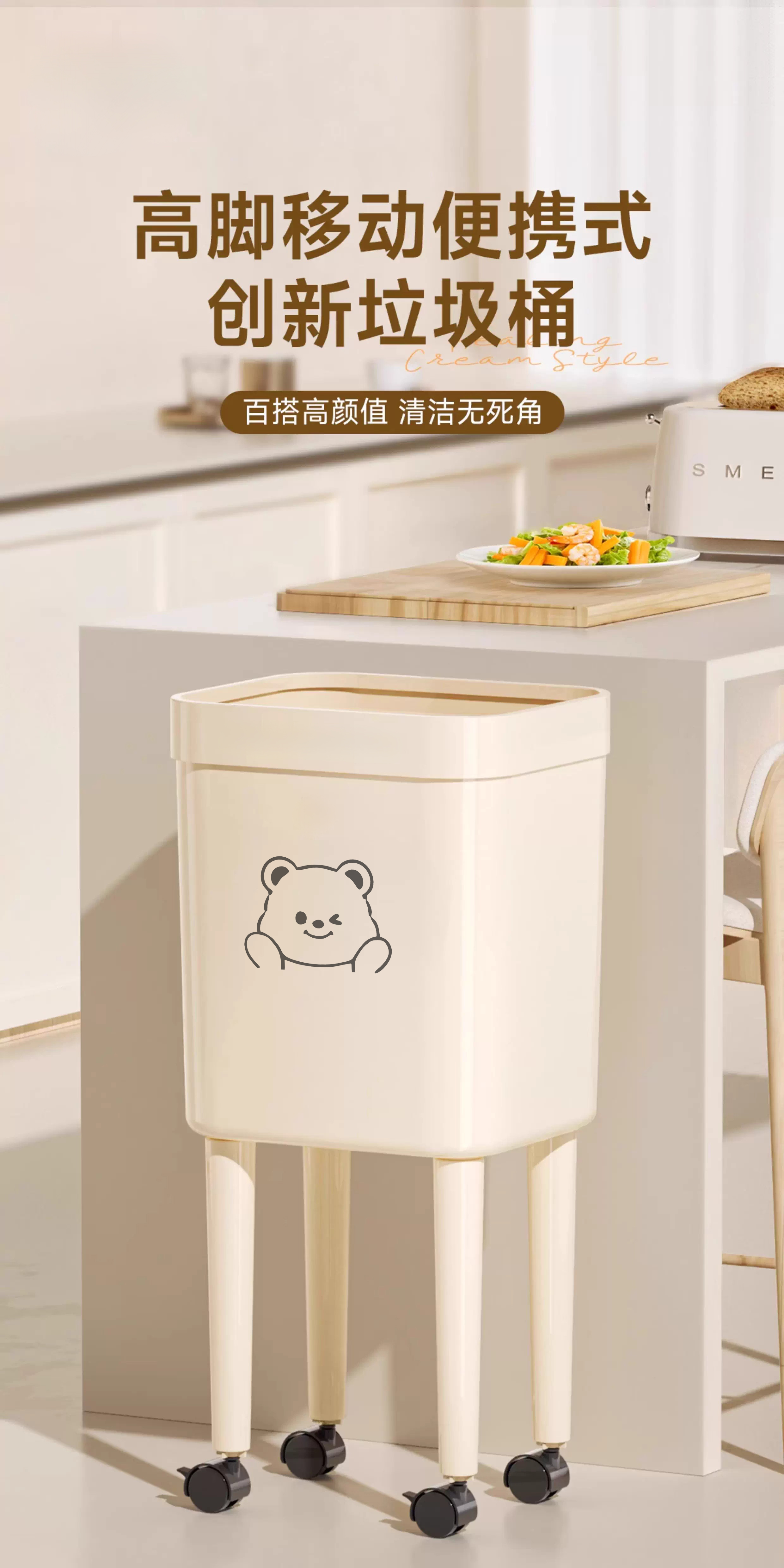 Kitchen trash can removable with silent wheels, large capacity, no bending, household living room, bedroom, toilet storage bucket, tall wheeled trash can, face bear - 1 pack