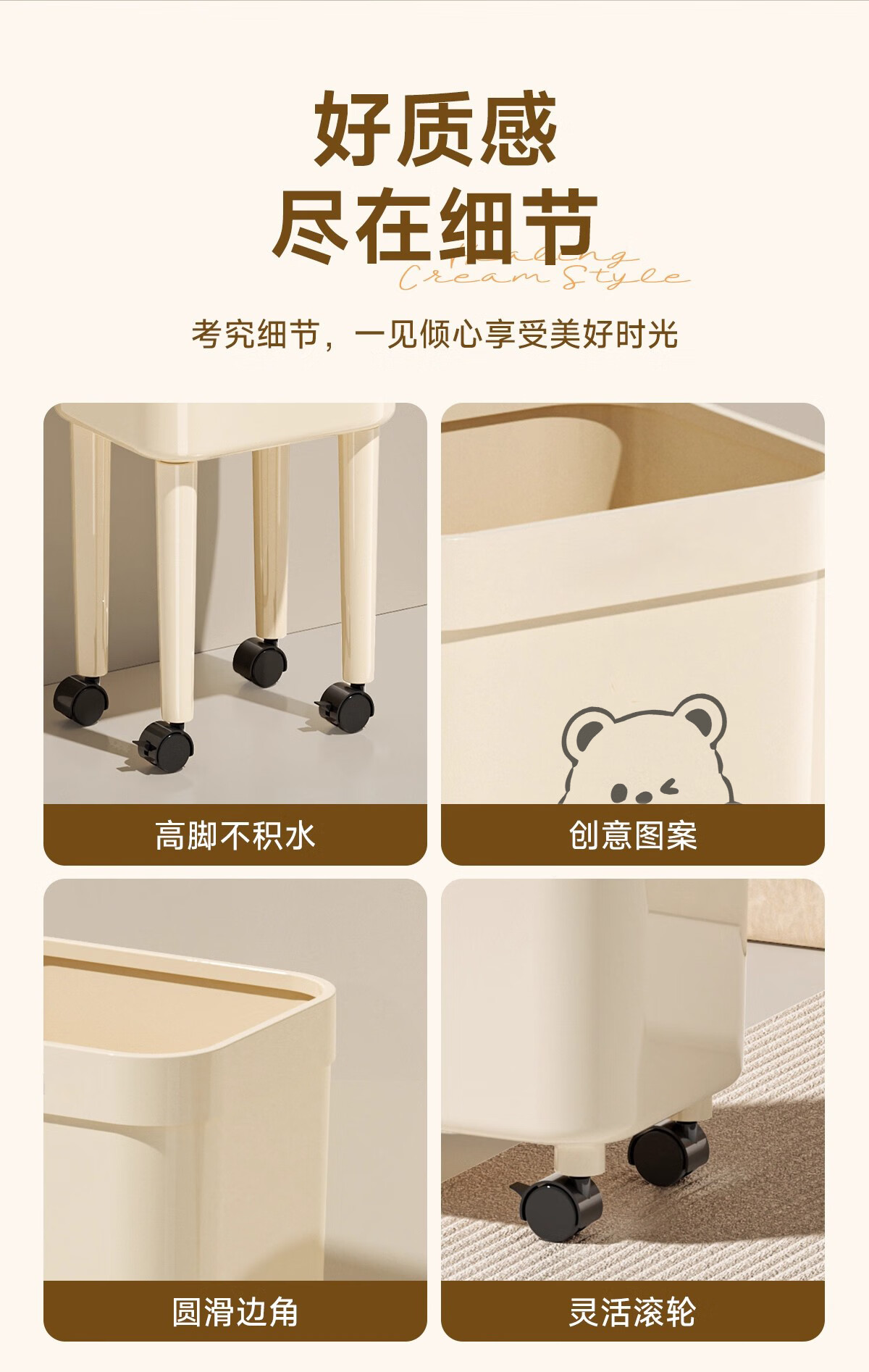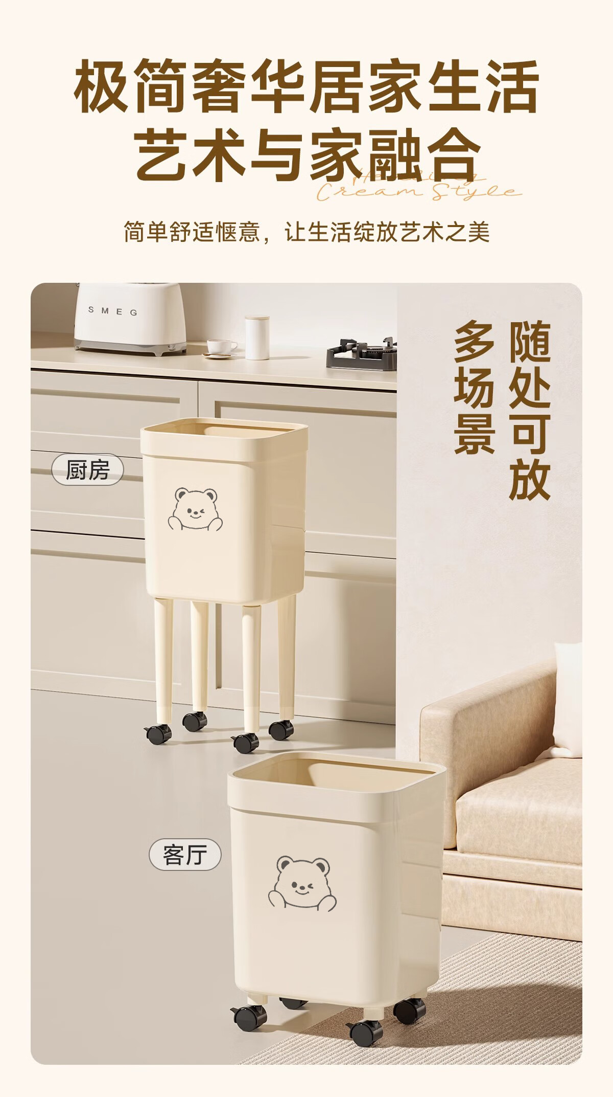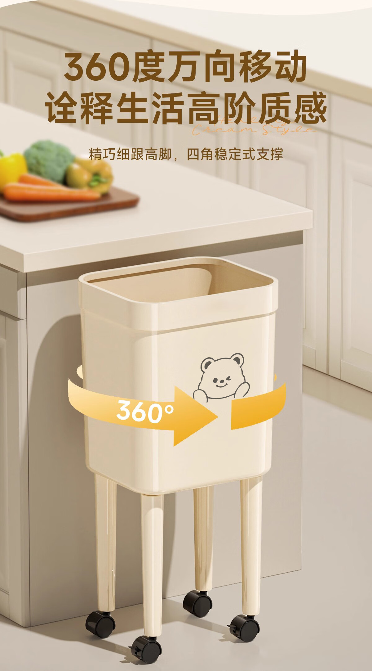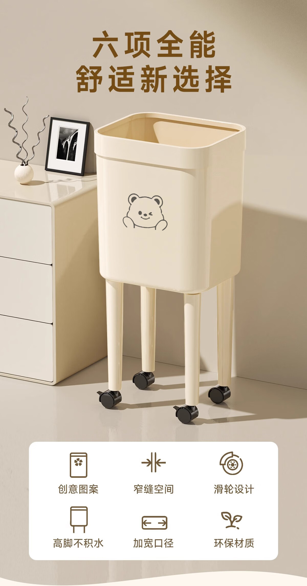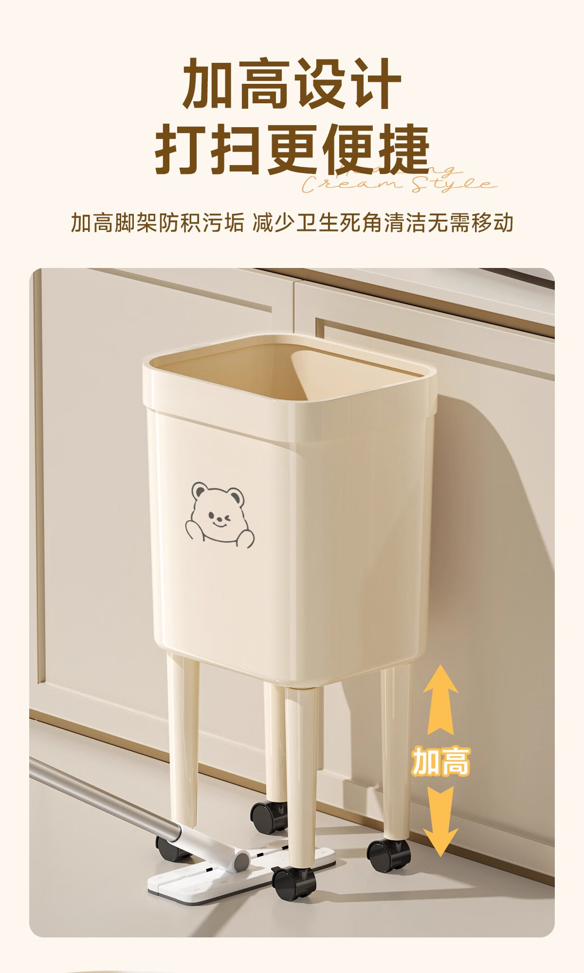 Kitchen trash can removable with silent wheels, large capacity, no bending, household living room, bedroom, toilet storage bucket, tall wheeled trash can, face bear - 1 pack
