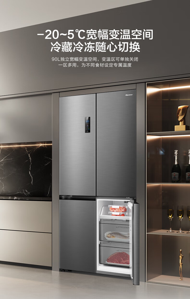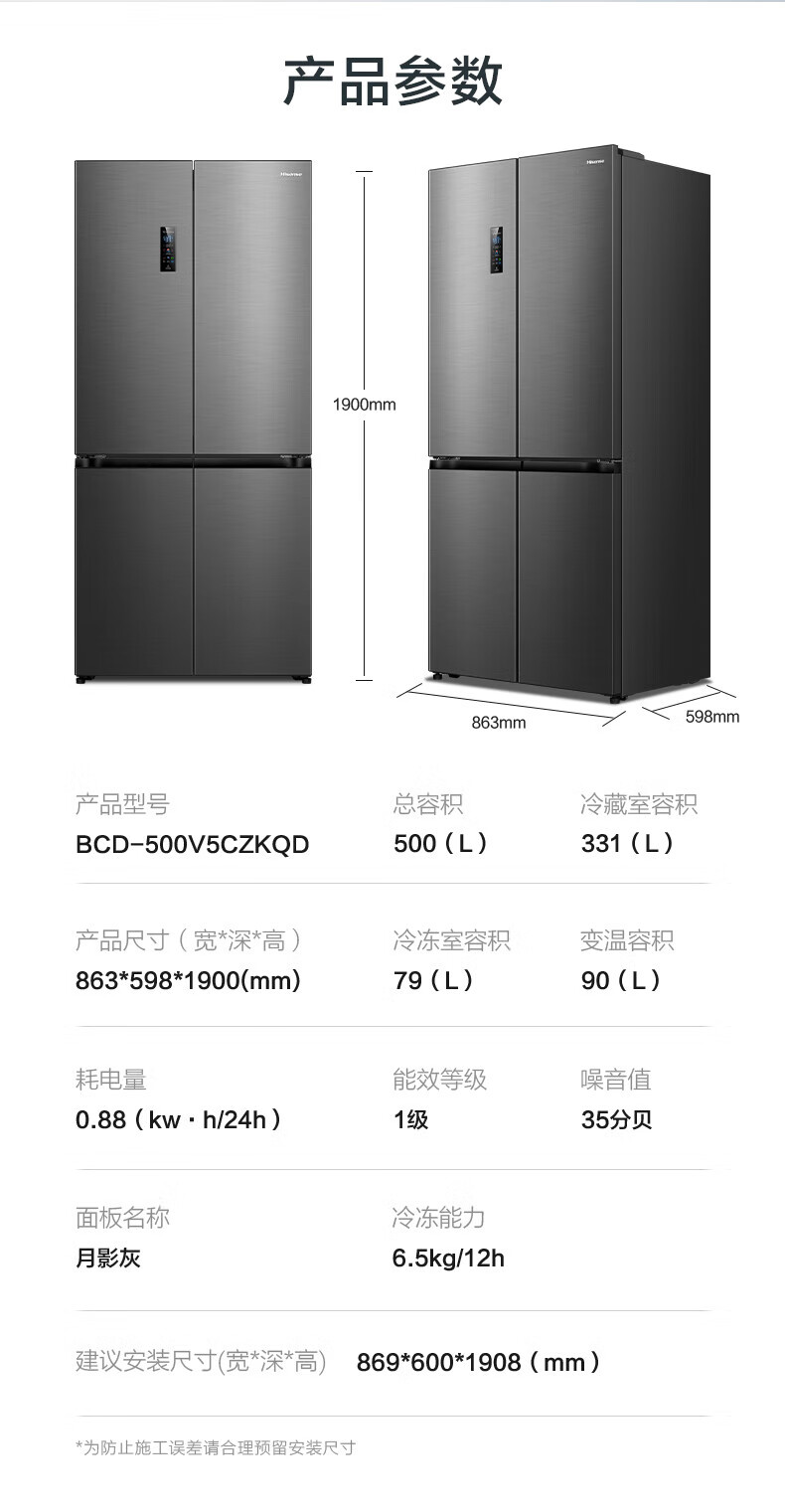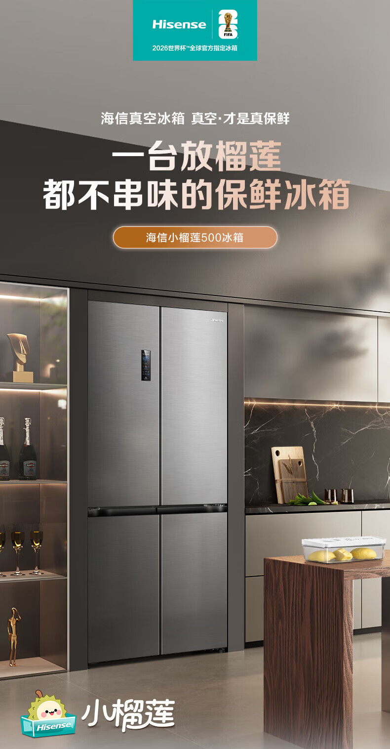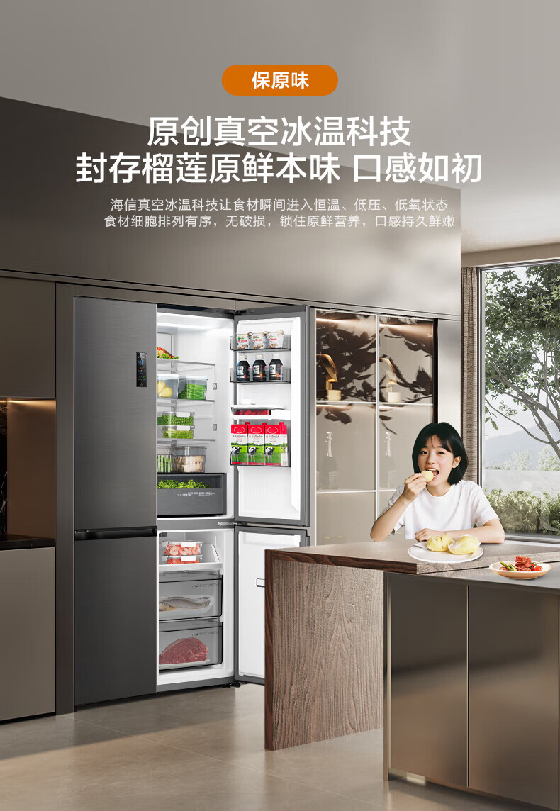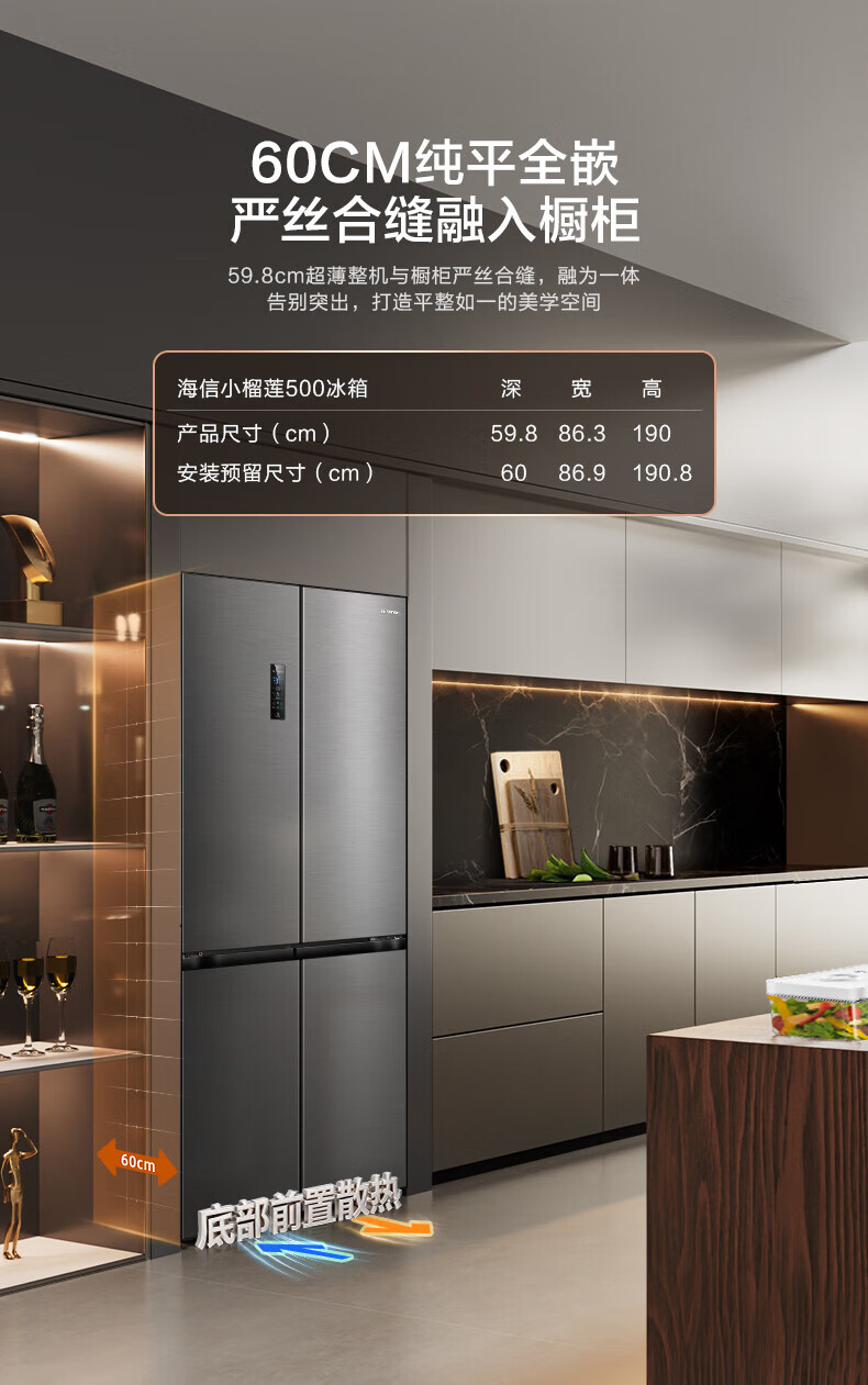 Hisense Small Durian 500 Refrigerator Vacuum Freshness Zero Embedded Refrigerator Cross Door Four Door Thin Dual System Level One Energy Efficiency Home Appliance Subsidy 20% BCD-500V5CZKQD Vacuum Ice Temperature Technology | Small Durian 500 Moon Shadow Gray
