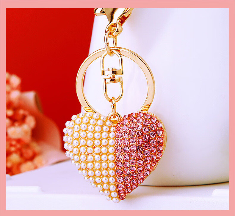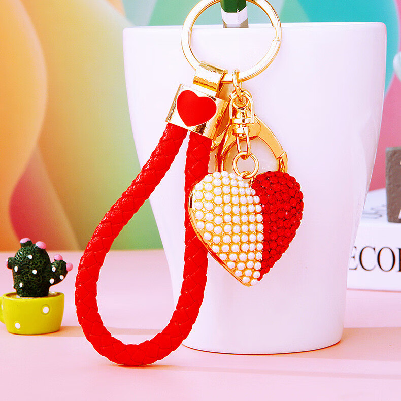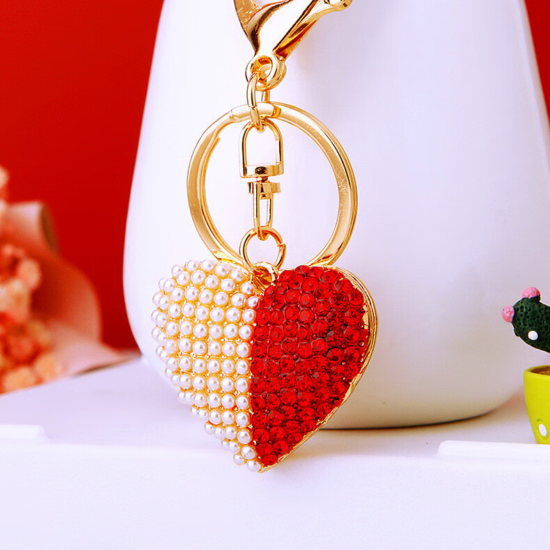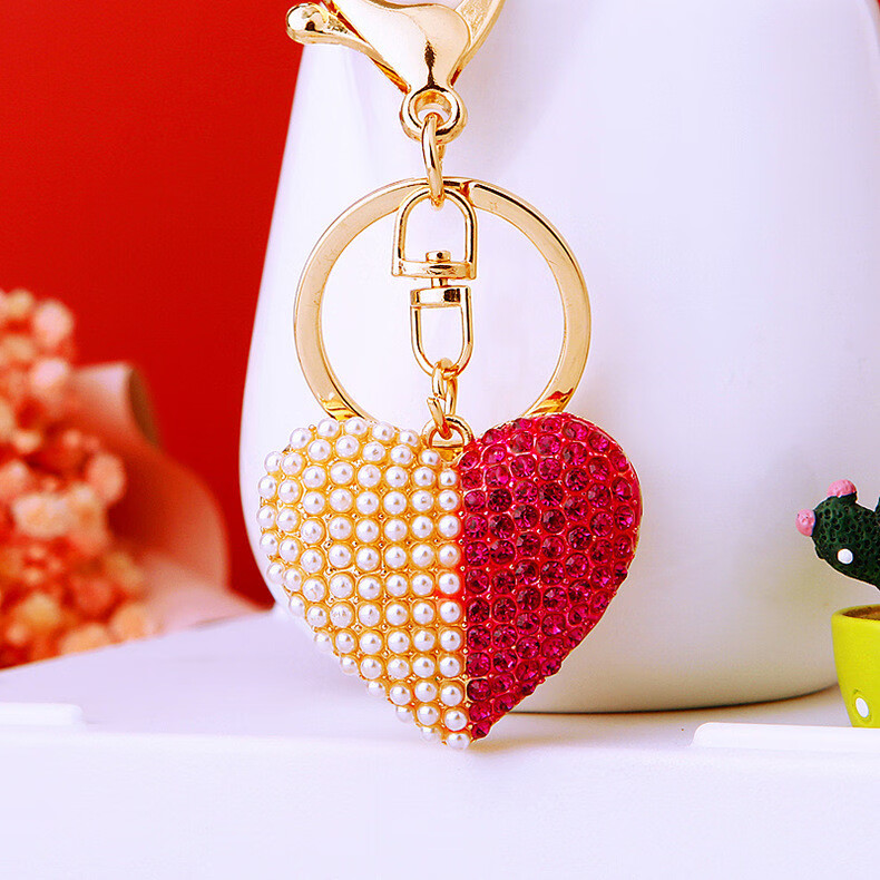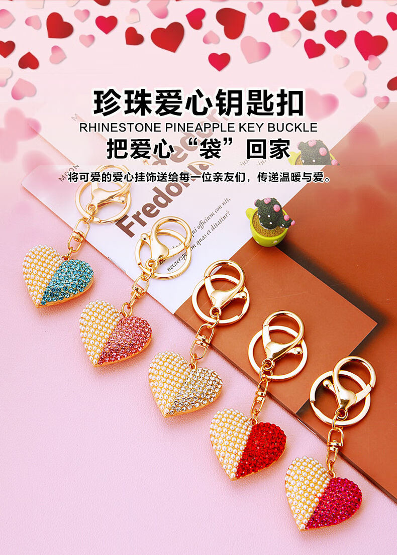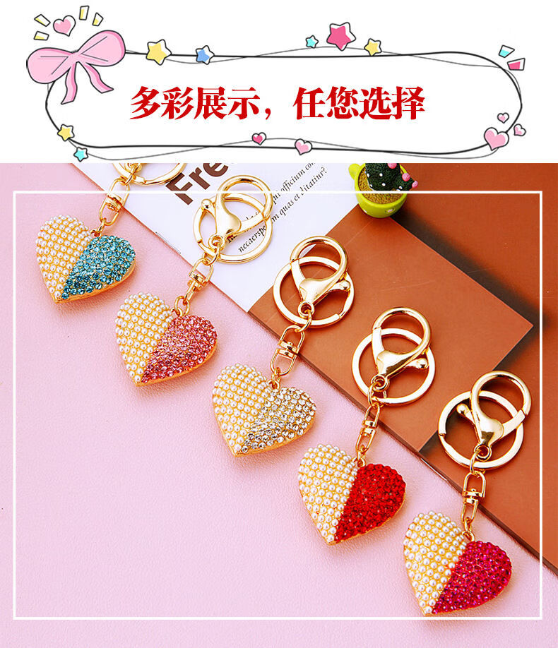 Pearl inlaid diamond double-sided love car keychain metal women's bag pendant key chain chain creative cross-border red rope + a525 double-sided pearl love red single opp bag 7