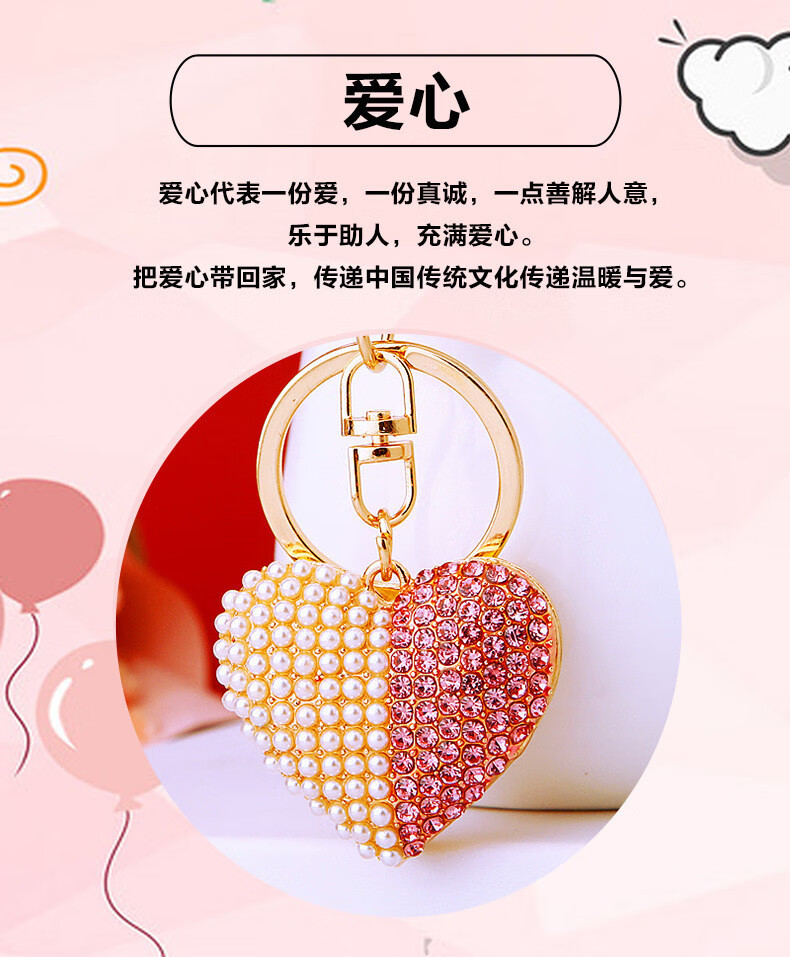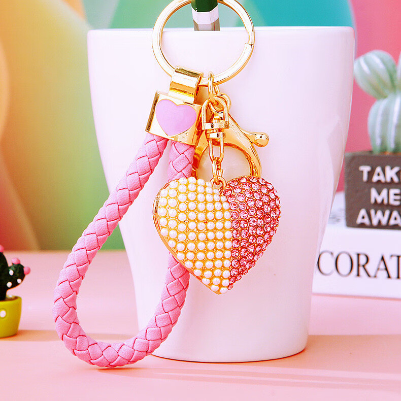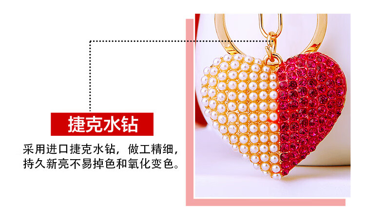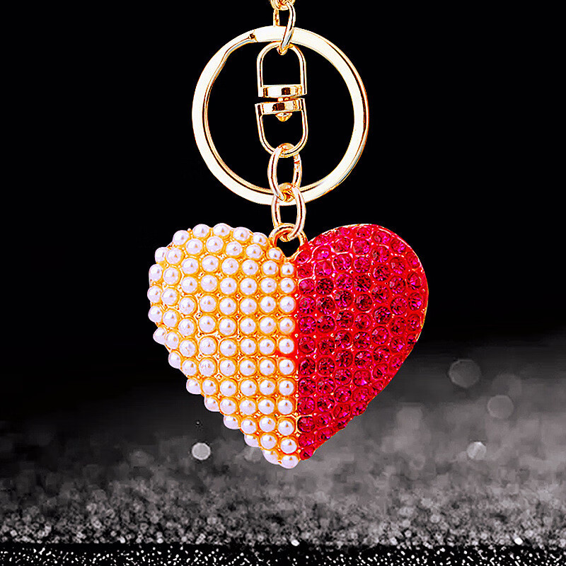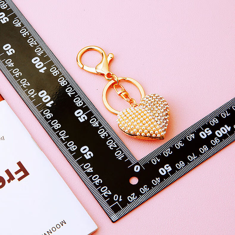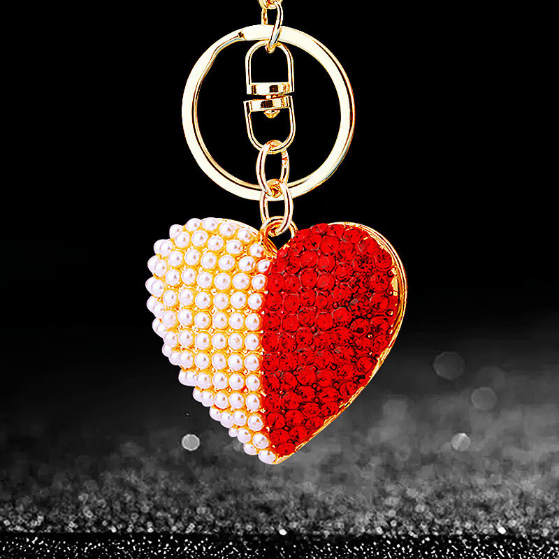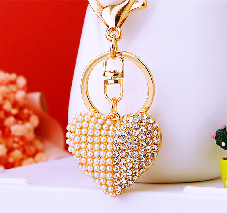 Pearl inlaid diamond double-sided love car keychain metal women's bag pendant key chain chain creative cross-border red rope + a525 double-sided pearl love red single opp bag 7