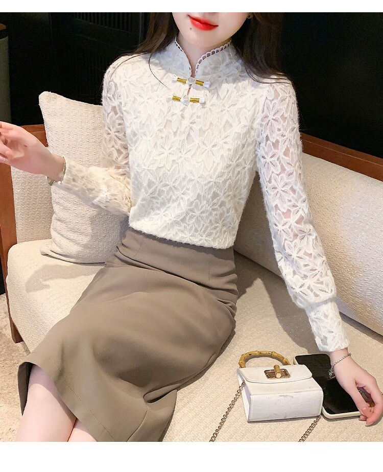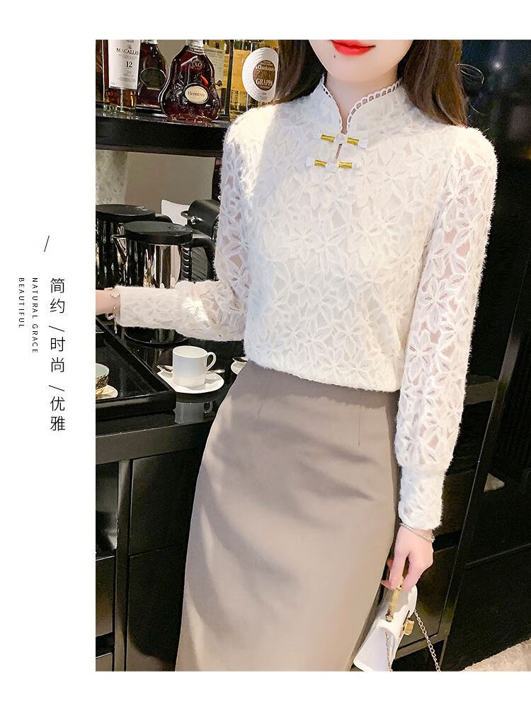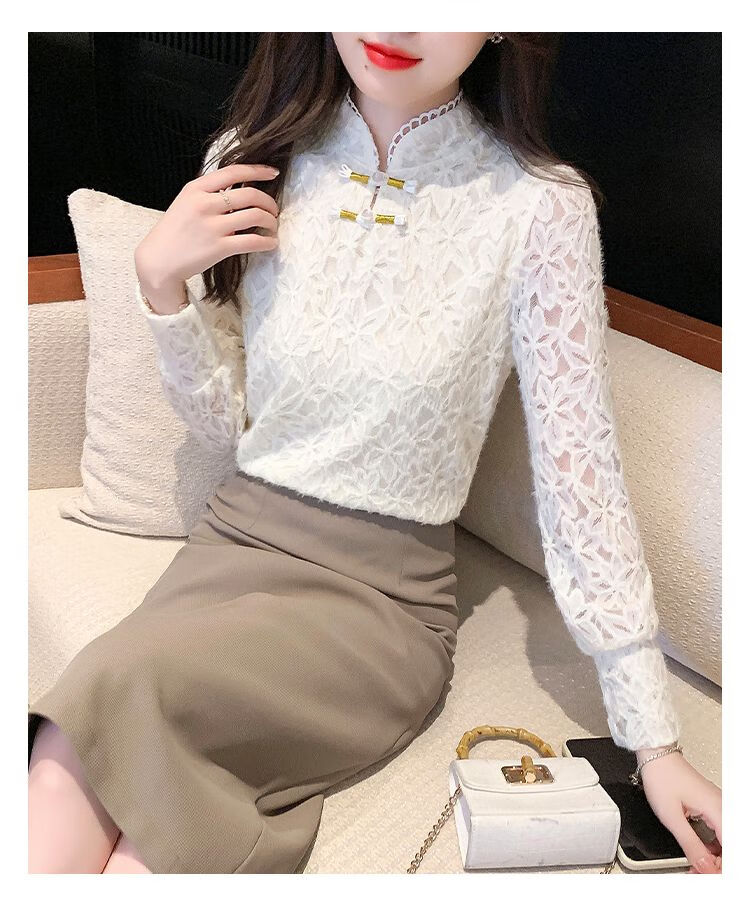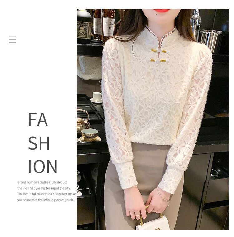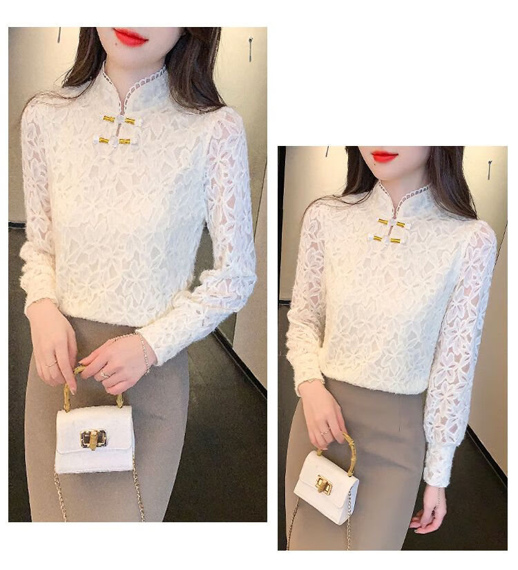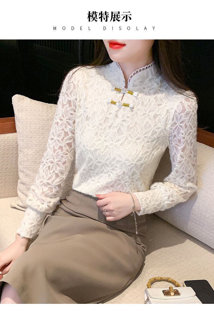Pierre Cardin lace bottoming shirt for women 2025 autumn and winter new style new Chinese style plus velvet thickened buckle western style inner top for women apricot full body plus velvet S recommended 80-90 pounds