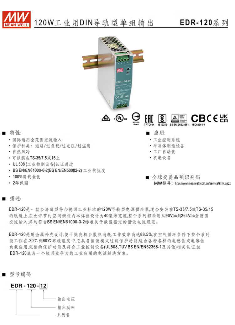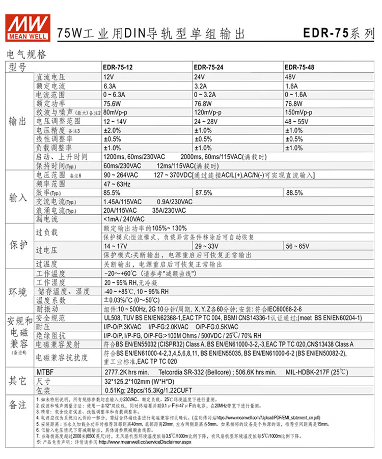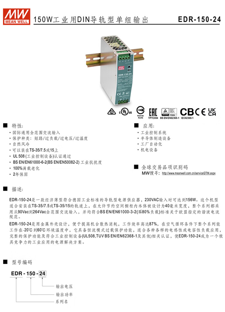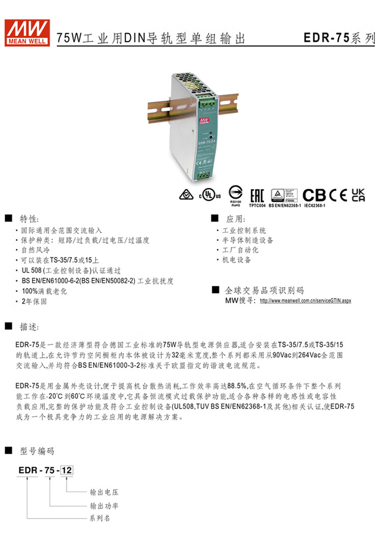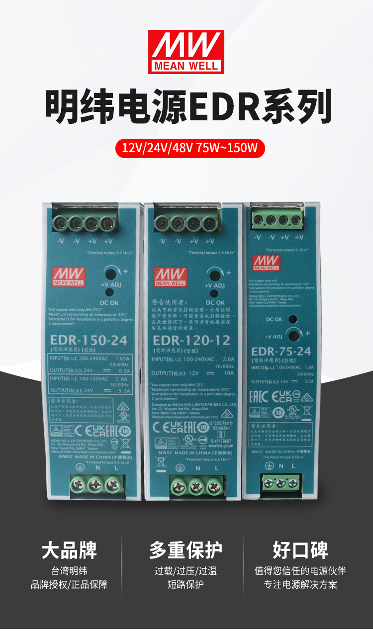 MEAN WELL switching power supply rail model EDR75W/120W/150W EDR-75-12 | 12V 6.3A