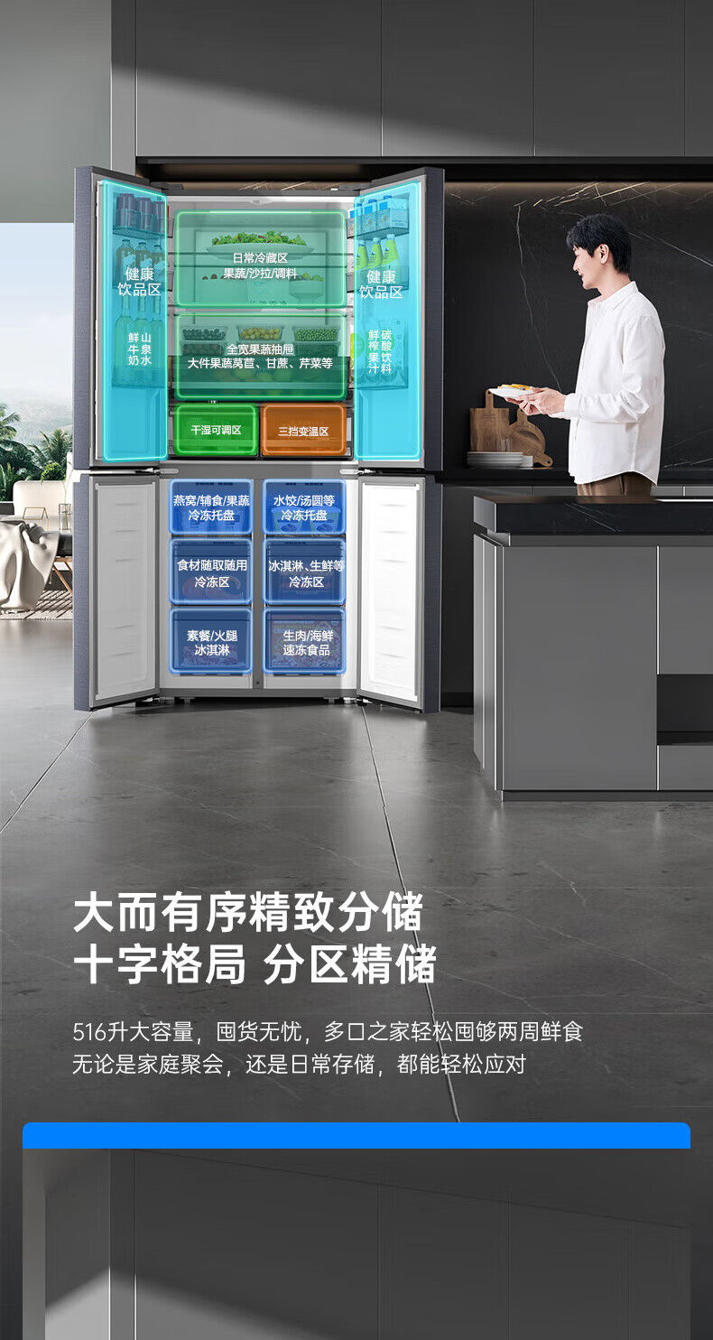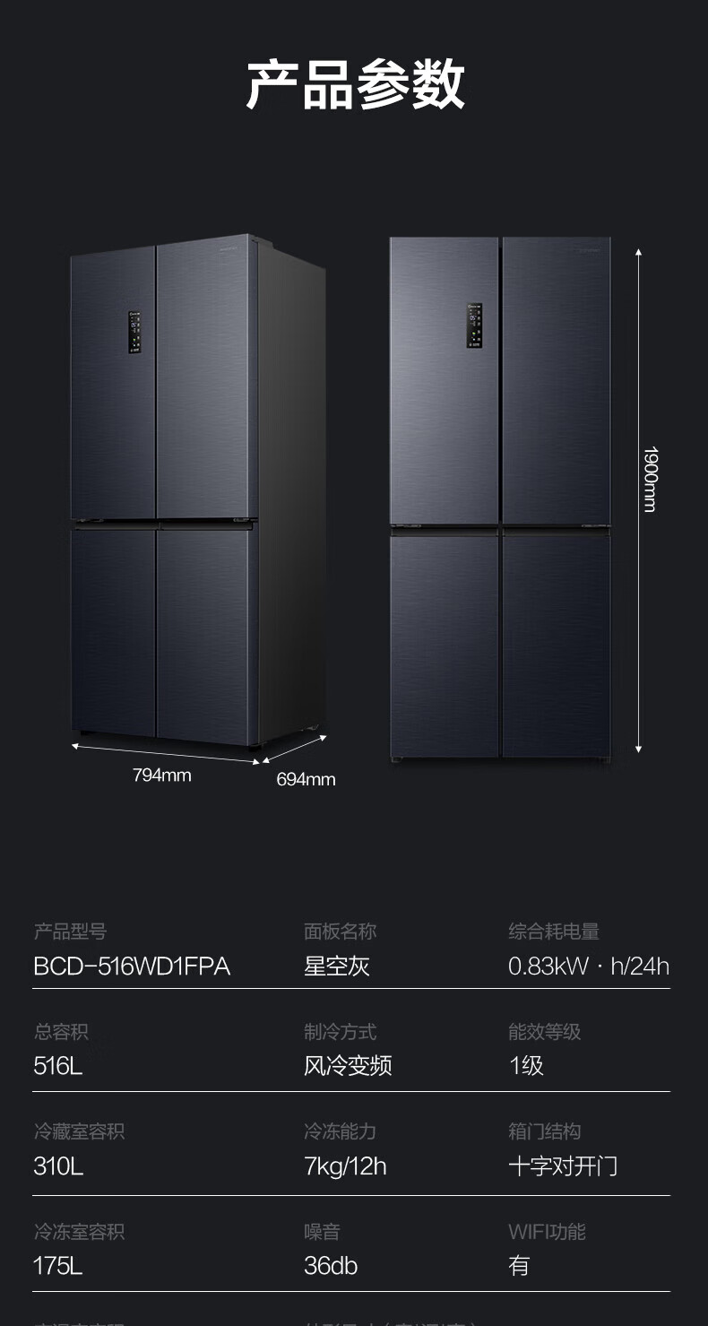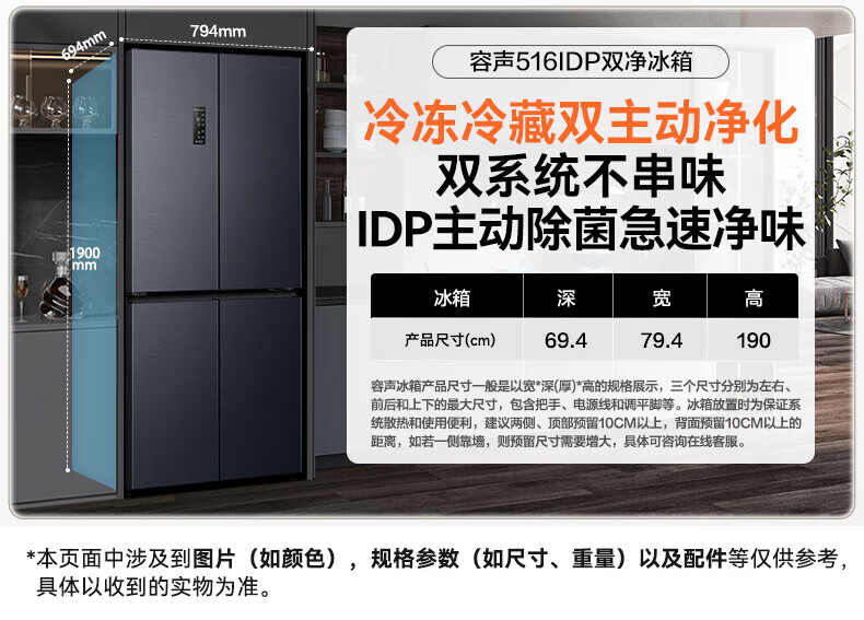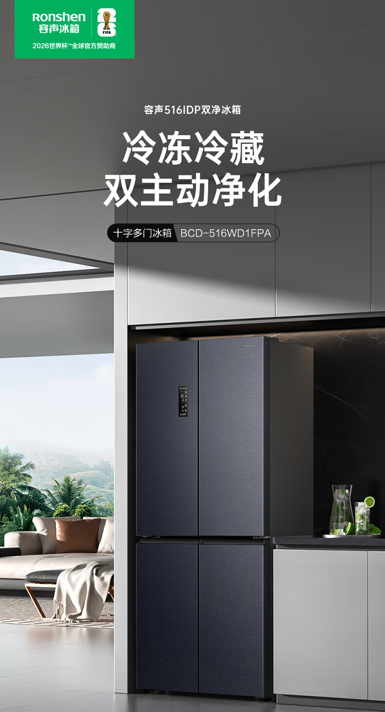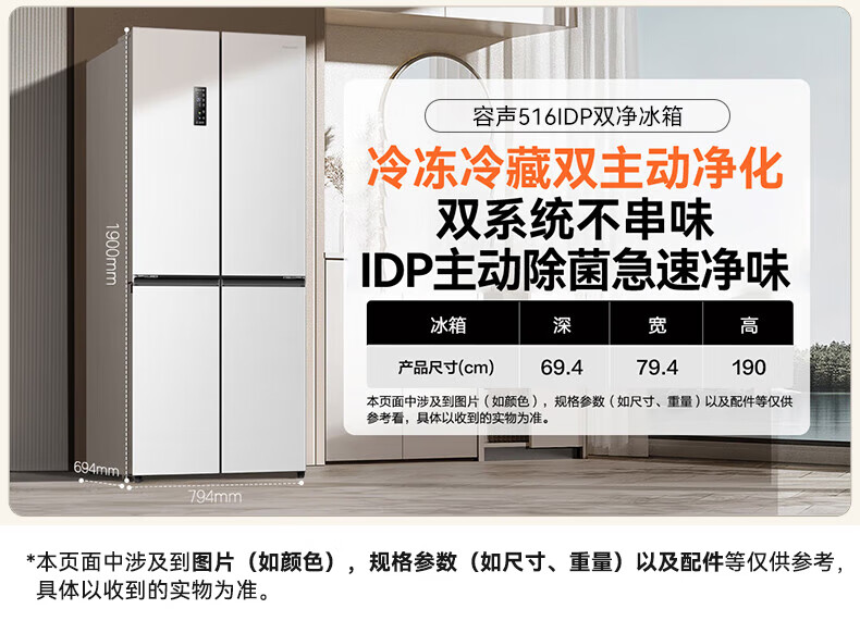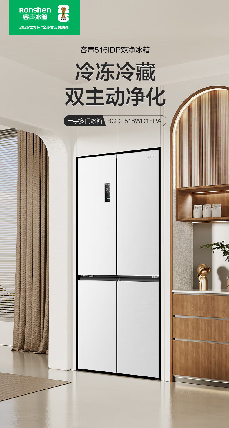 Rongsheng Refrigerator 516L Dual Purification Dual System Cross Four-Door Household First-Class Energy Efficiency Air-cooled Frost-free Large Capacity Refrigerator 526 Cross Model BCD-516WD1FPA IDP Active Sterilization 516L Dual Purification Dual System Cross White