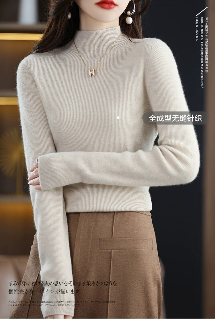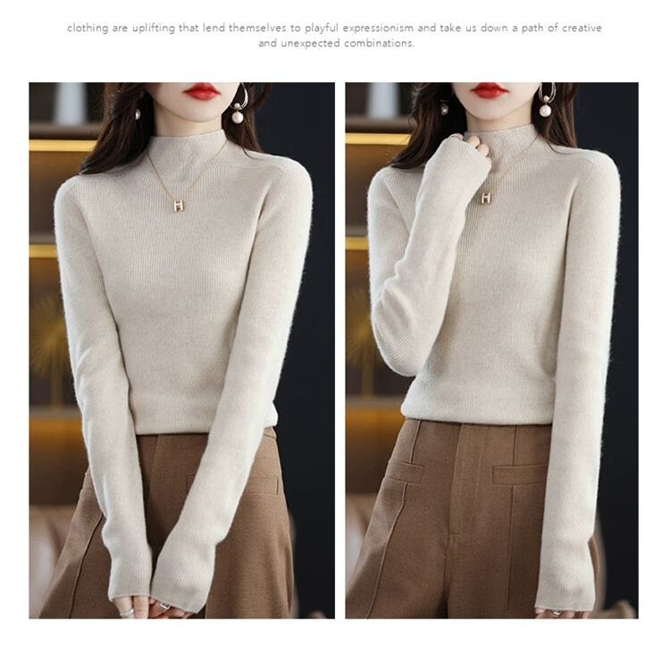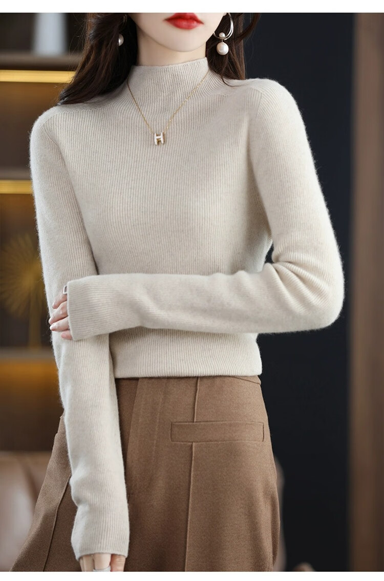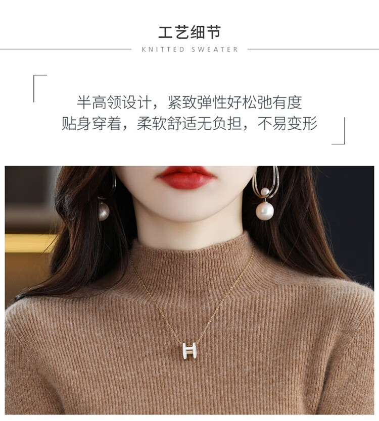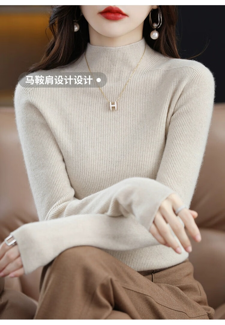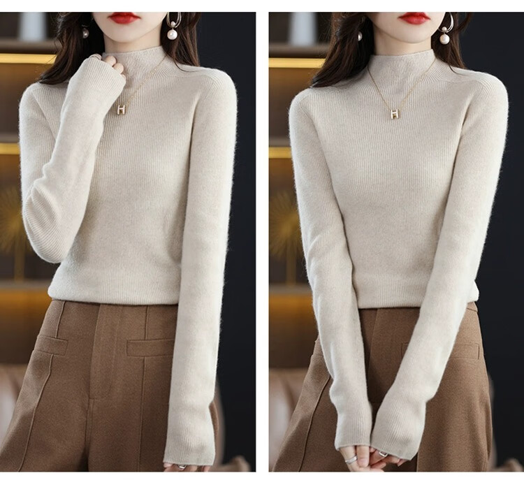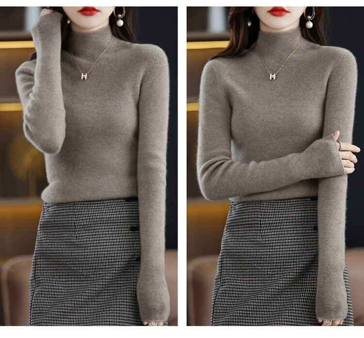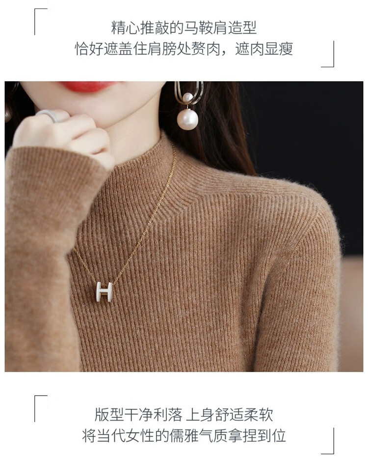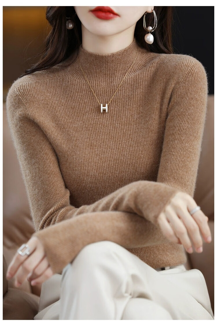 LangSha 100% pure wool sweater for women half turtleneck autumn and winter thickened tight warm sweater with knitted base layer camel XL
