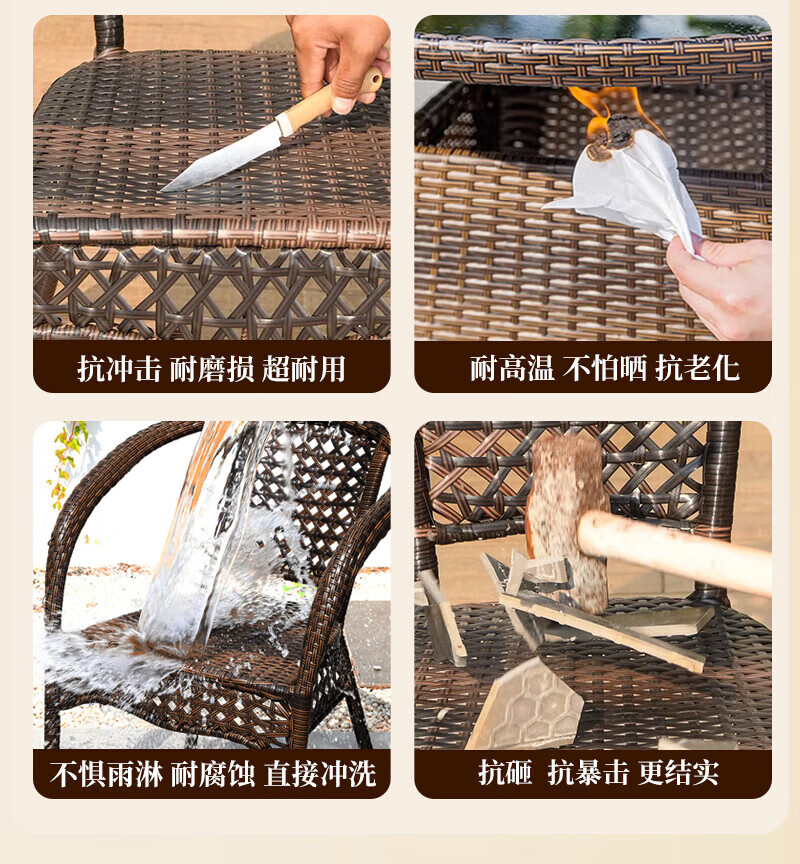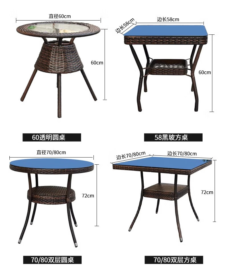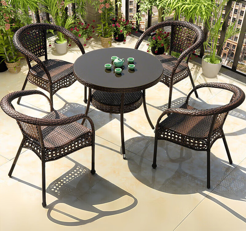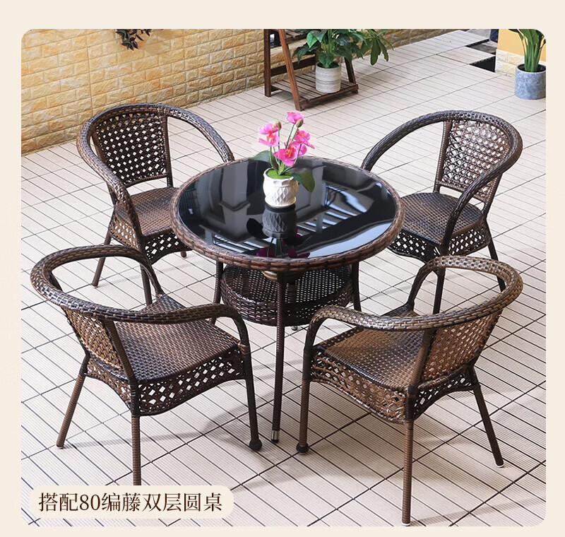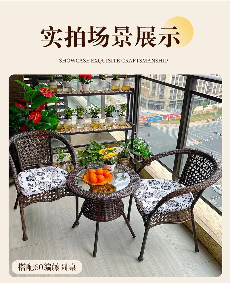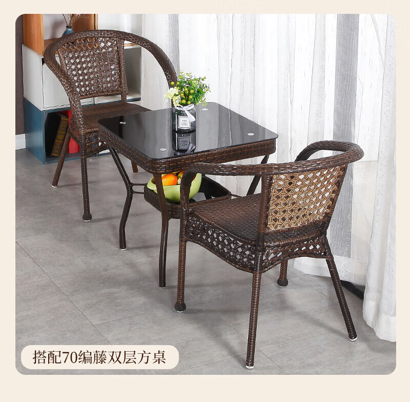 Rattan impression balcony tea table, small tea table, leisure table and chair three-piece set, outdoor open-air rattan chair set, courtyard home tea table, 2 chairs + 58 double-layer round table, free cushions