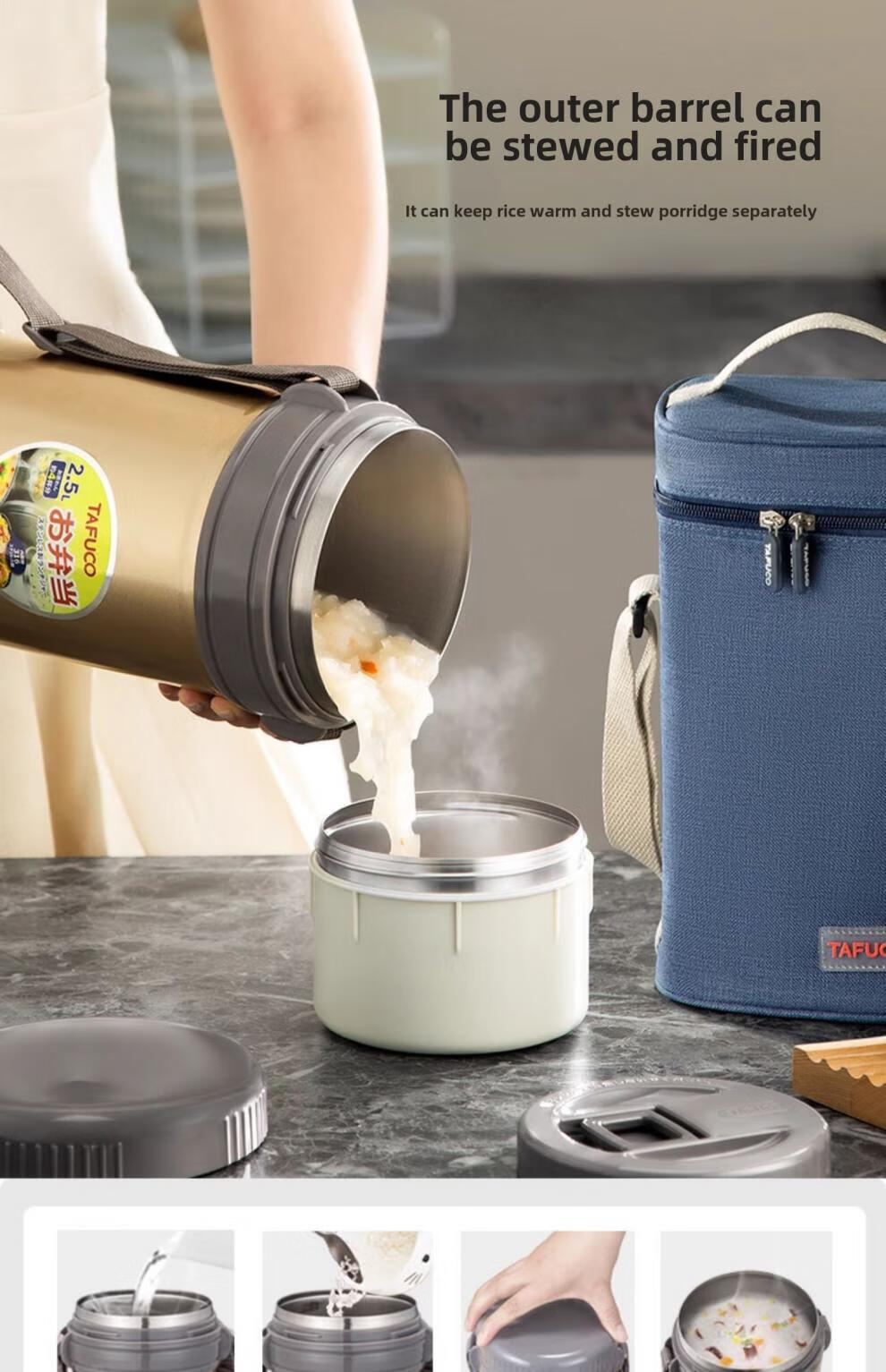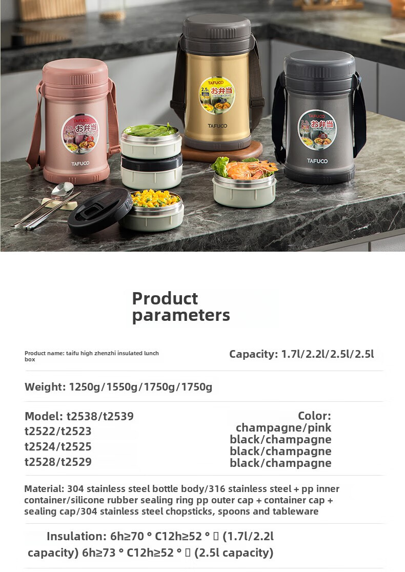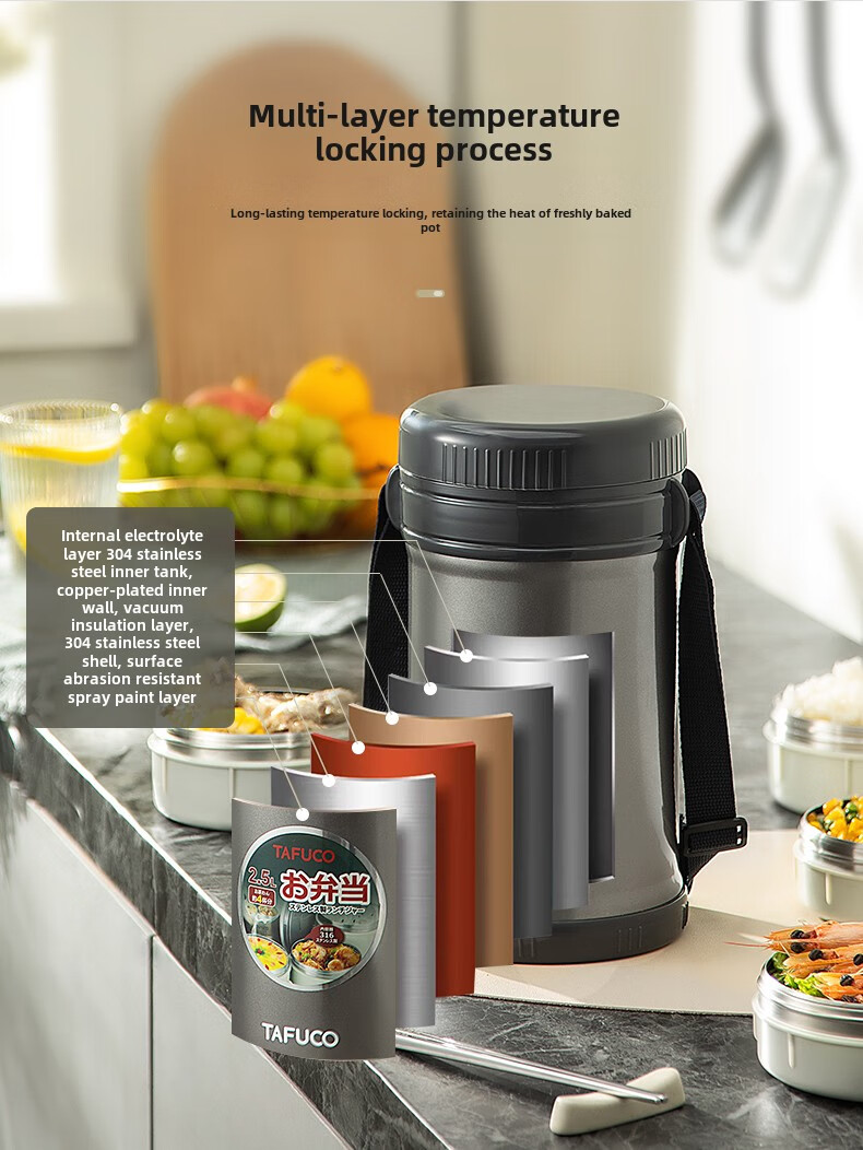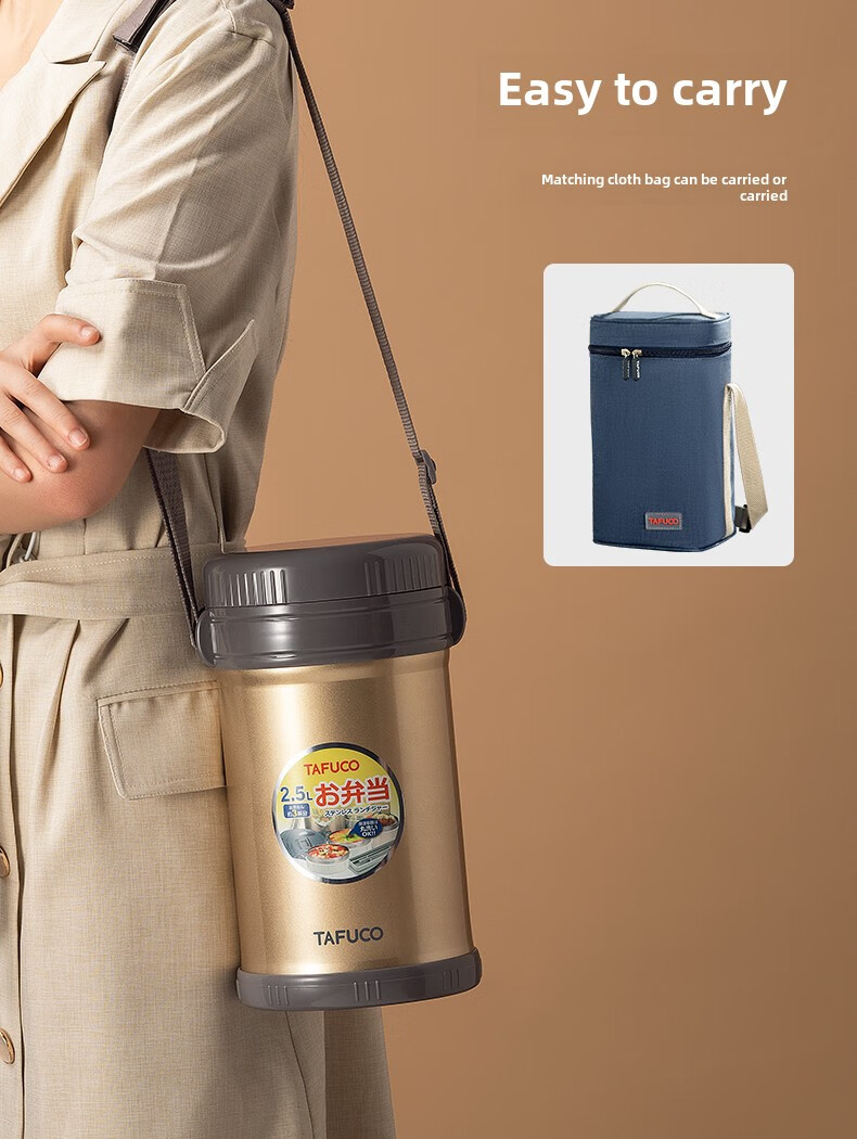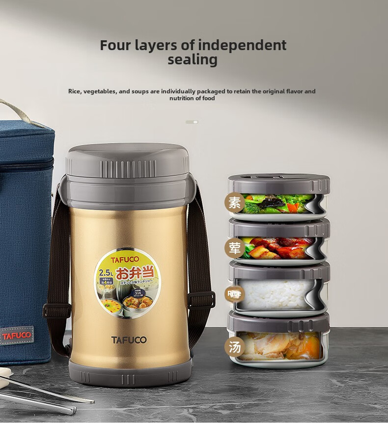 TAFUCO Japanese TAFUCO Insulated Lunch Box Large Capacity Extra Long Insulated Bucket Winter Portable Lunch Box for Office Workers and Students Anti-scalding - Enhanced Insulation _2.5L Champagne Color Four Layers + Insulation Bag +