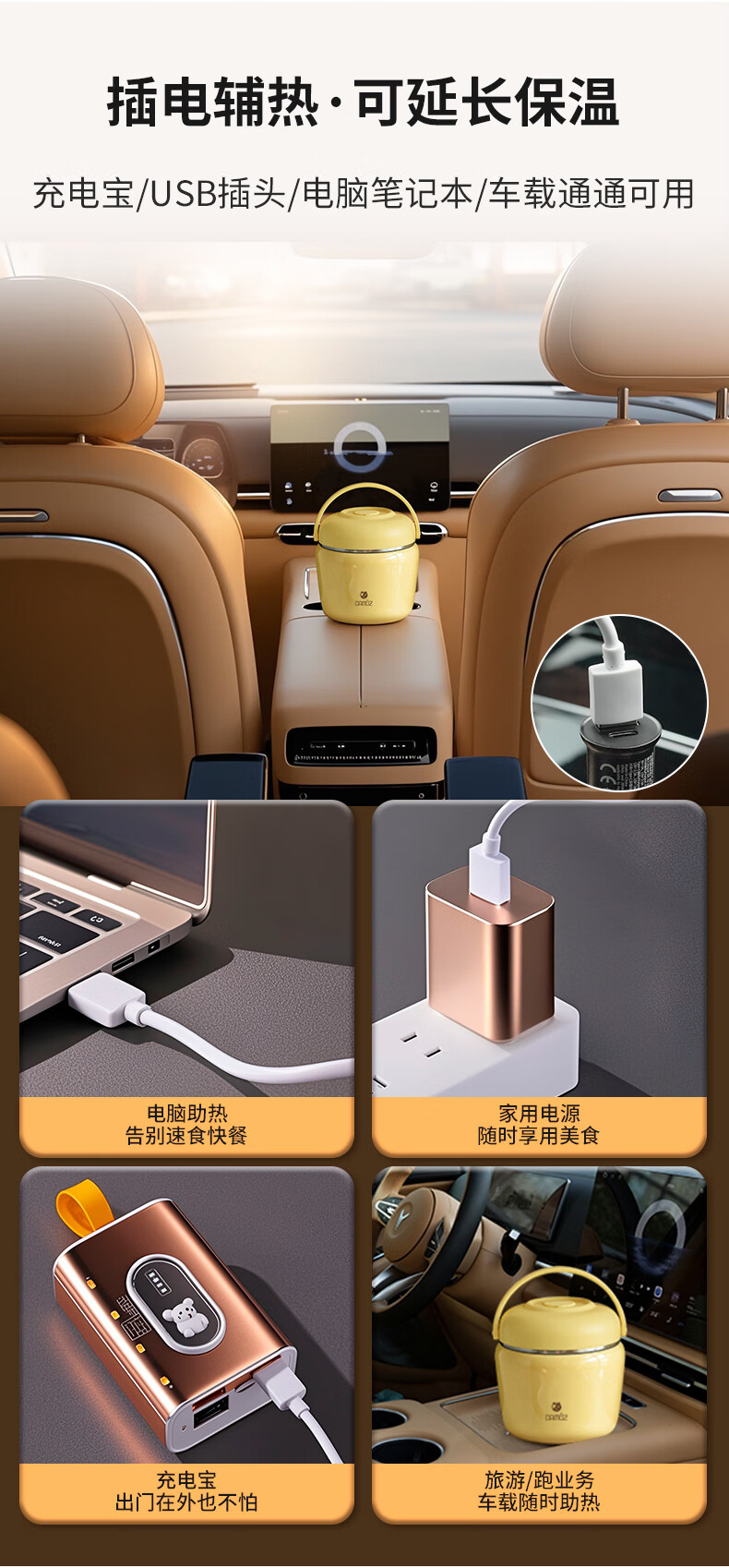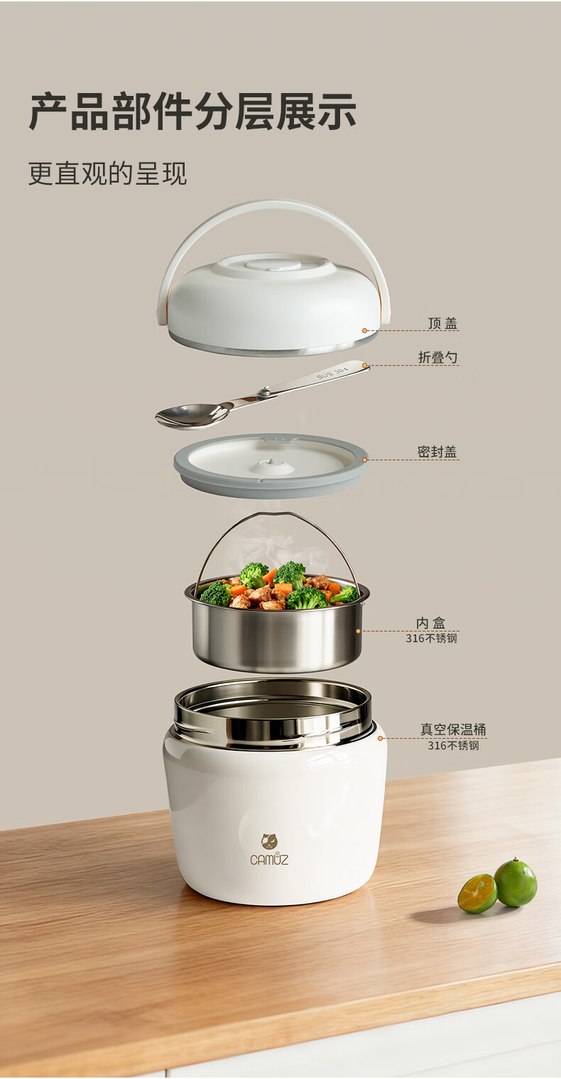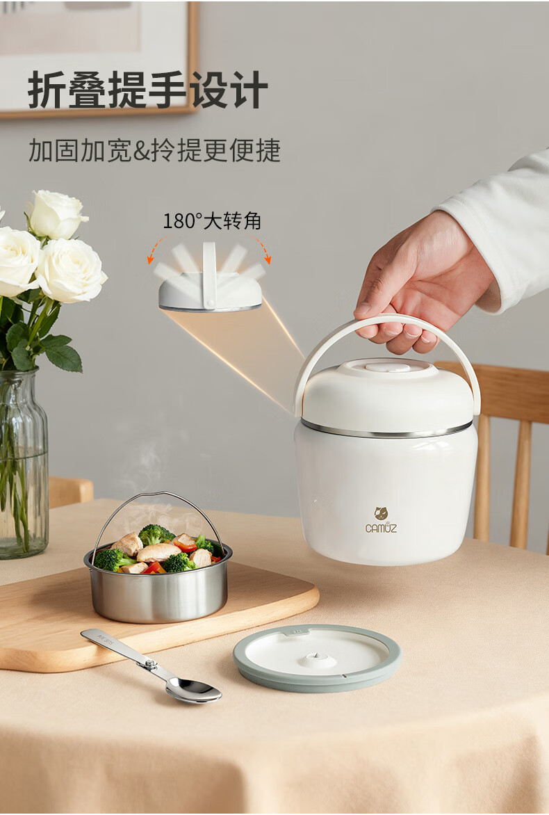 CAMUZ Insulated Lunch Box 316 Stainless Steel Large Capacity Portable Extra Long Insulated Bucket Lunch Box for Office Workers and Students Creamy Yellow Stainless Steel Spoon + Meal Bag + Free Type-C Cable