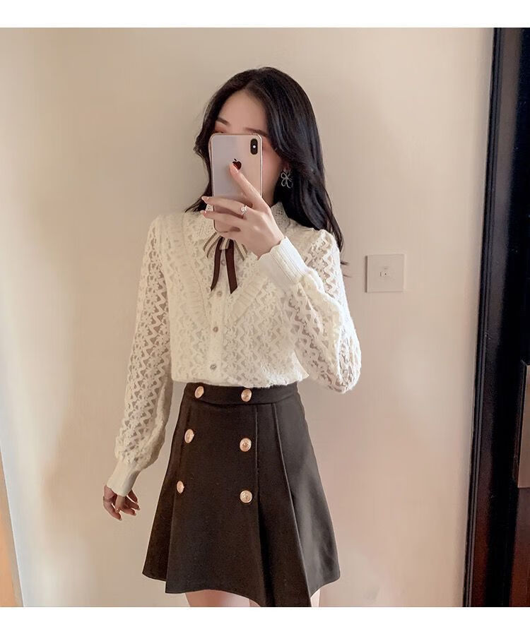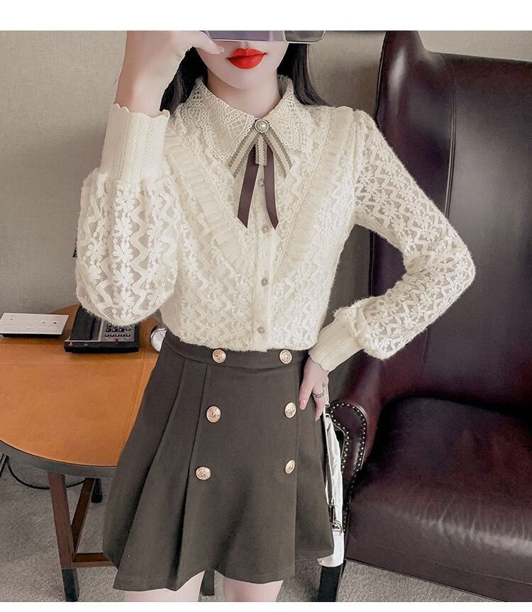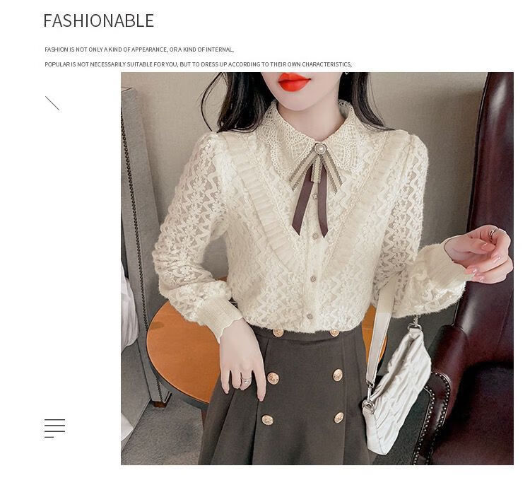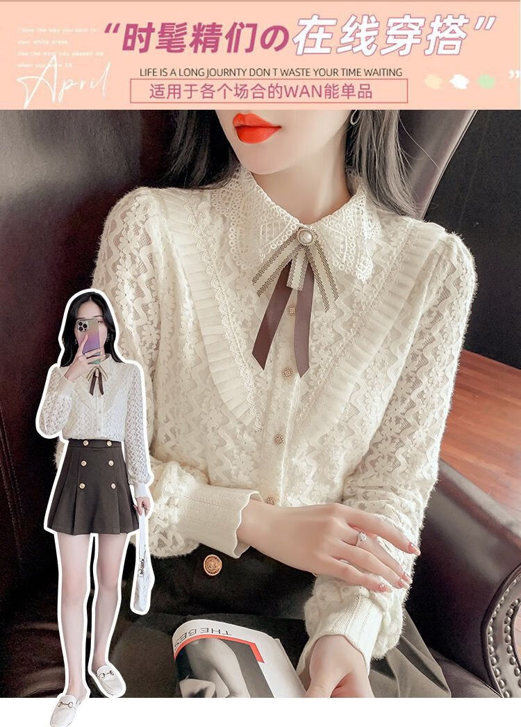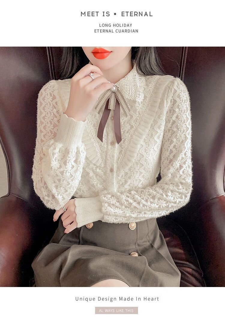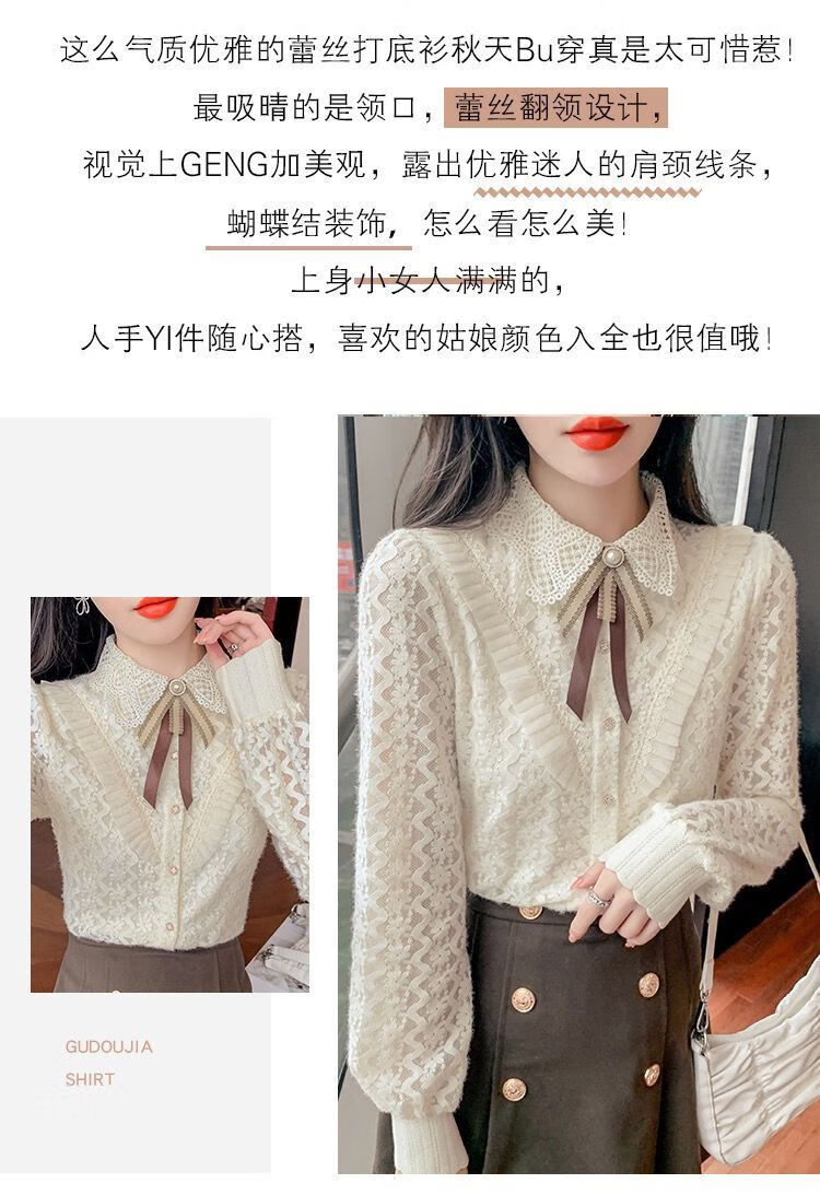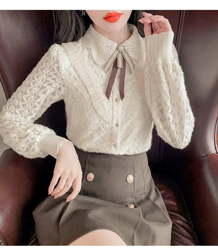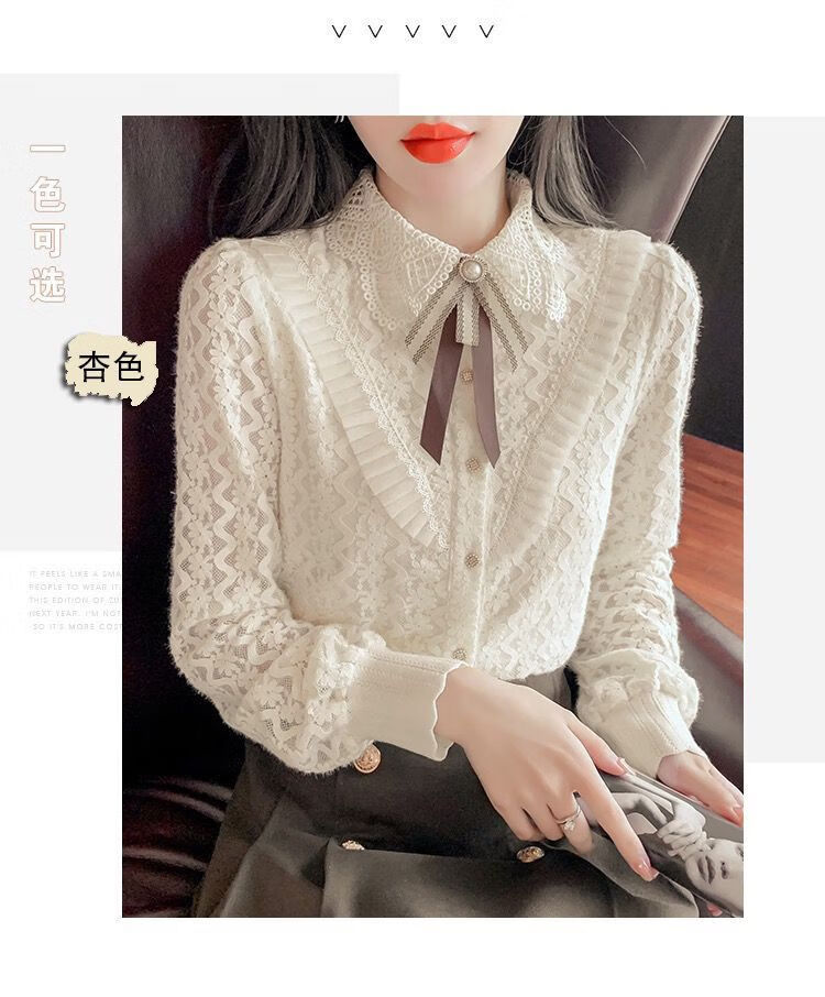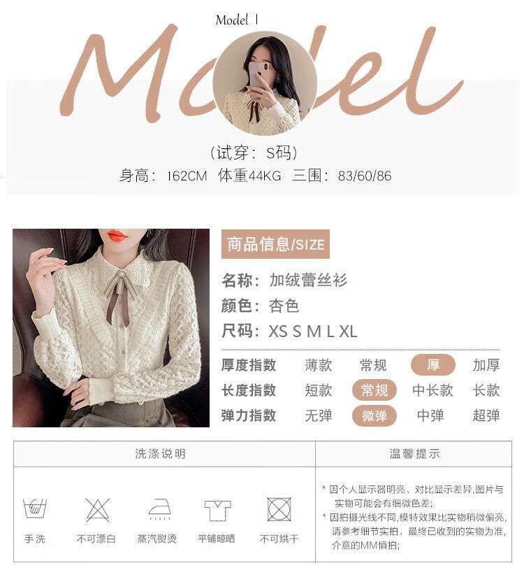 Pierre Cardin velvet thickened lace bottoming shirt for women autumn and winter style new winter shirt women's fashionable inner warm top apricot full body official flagship plus velvet S 80-95 pounds