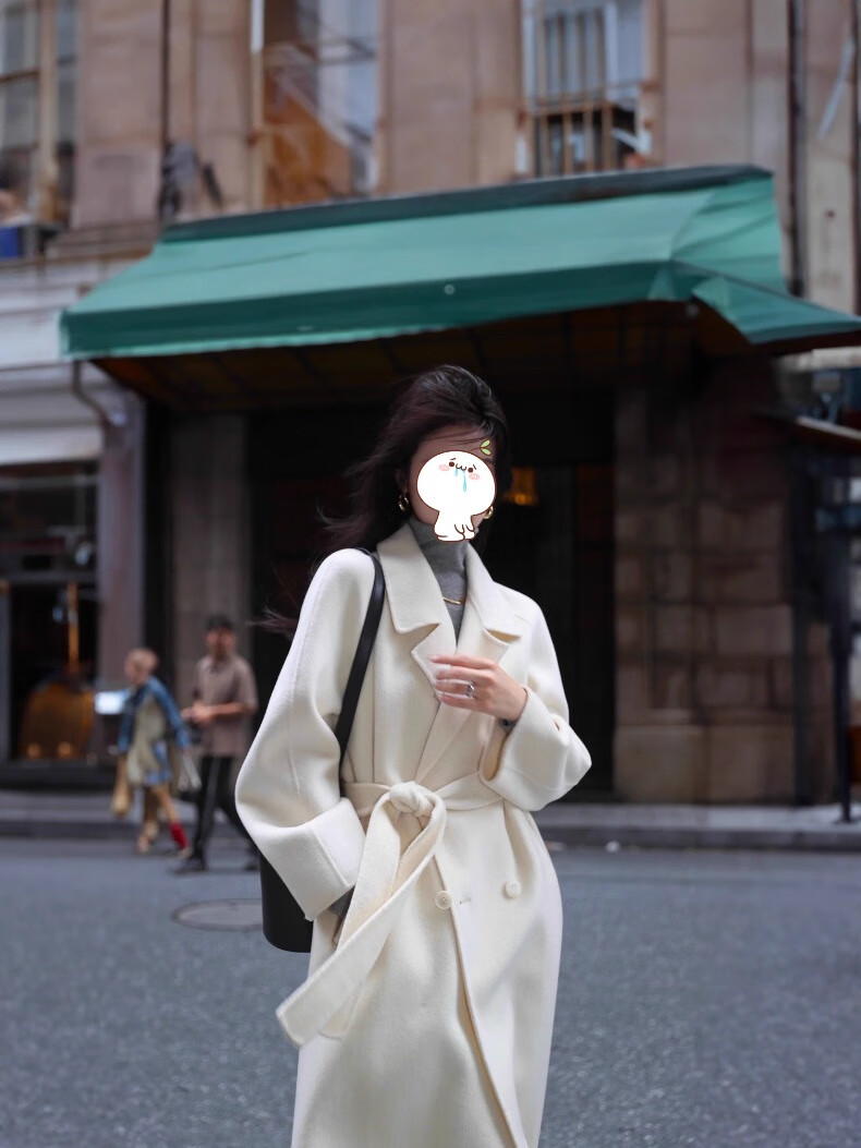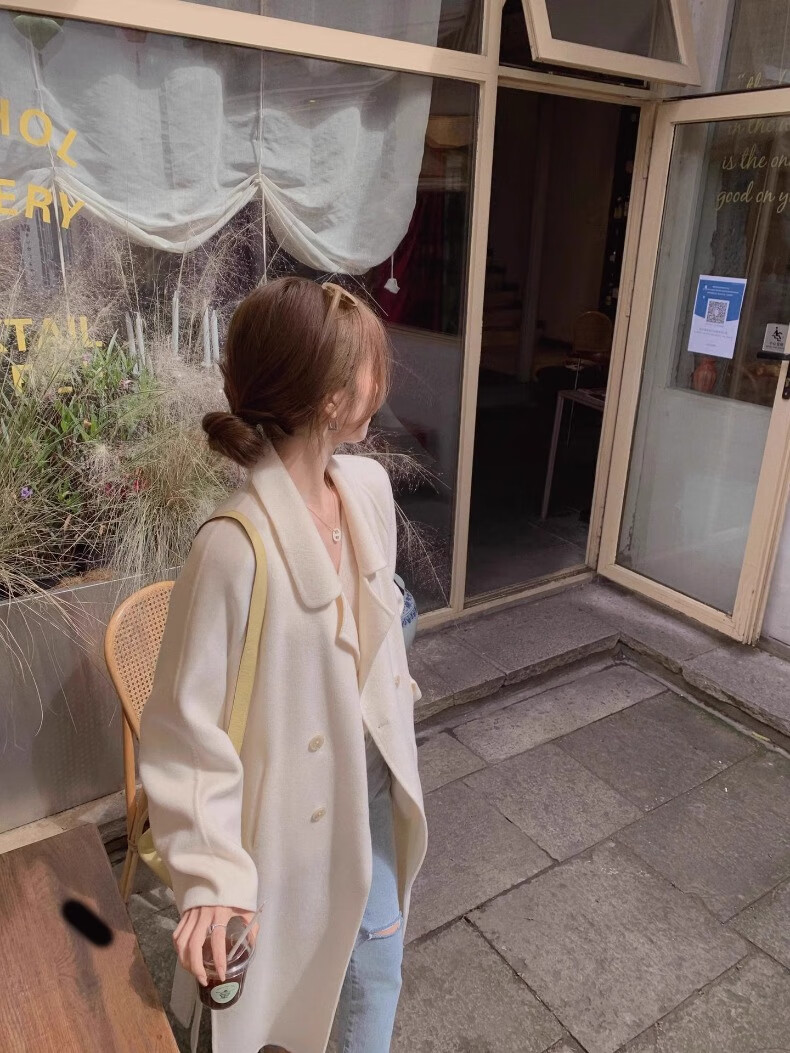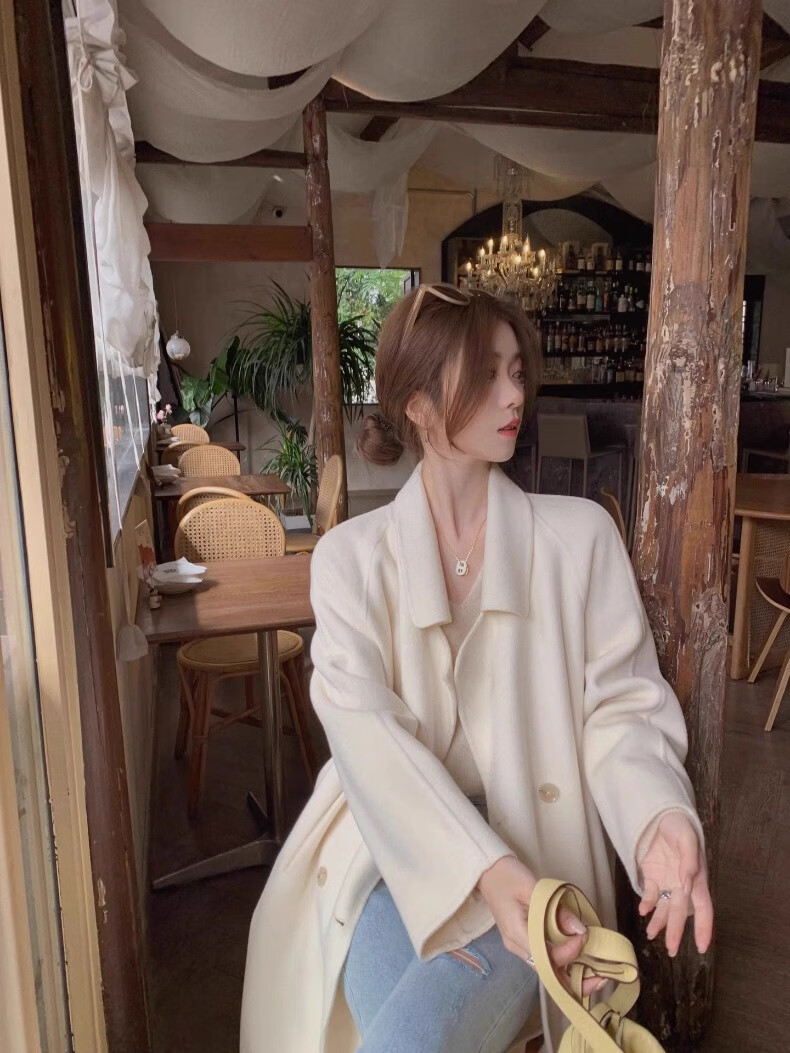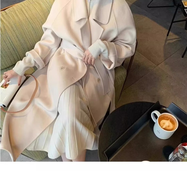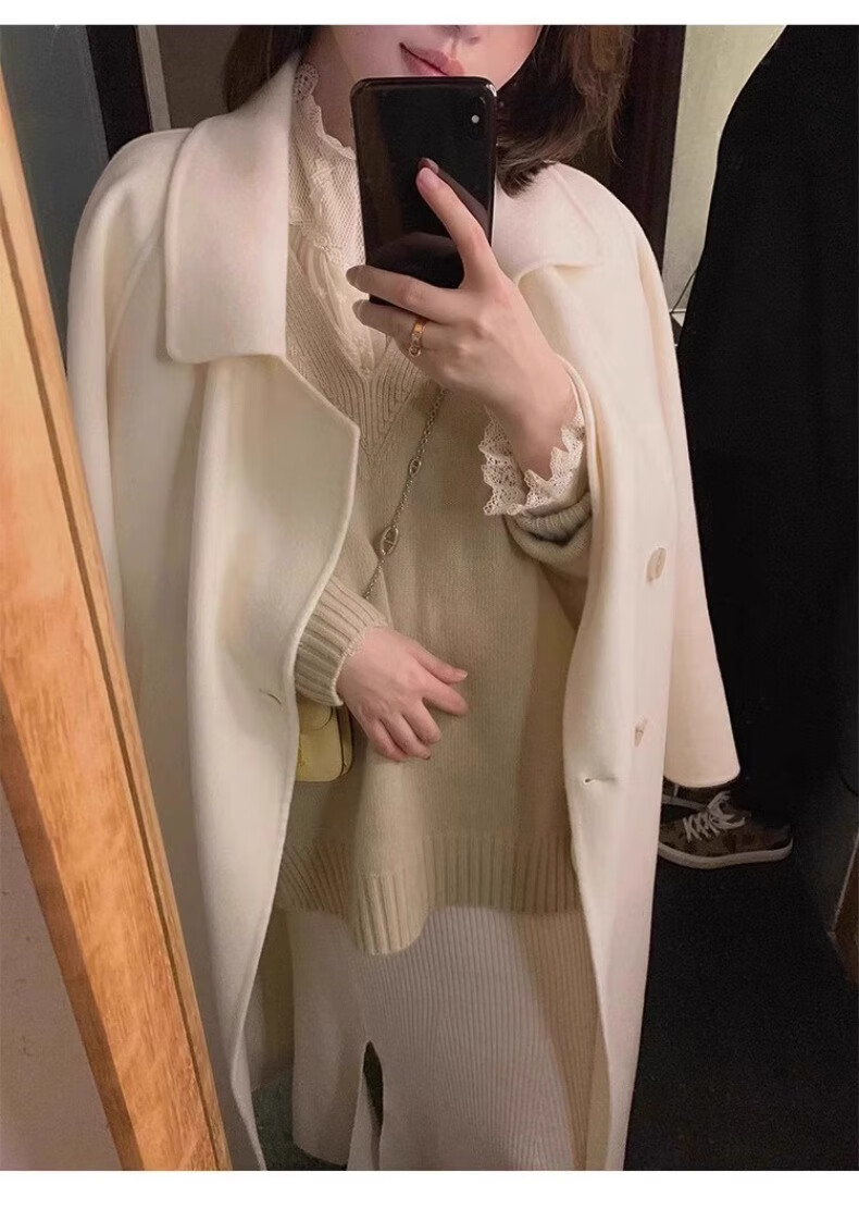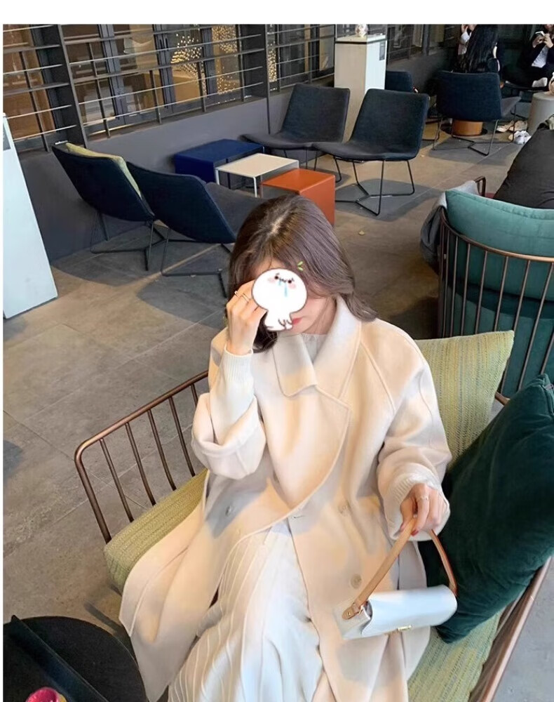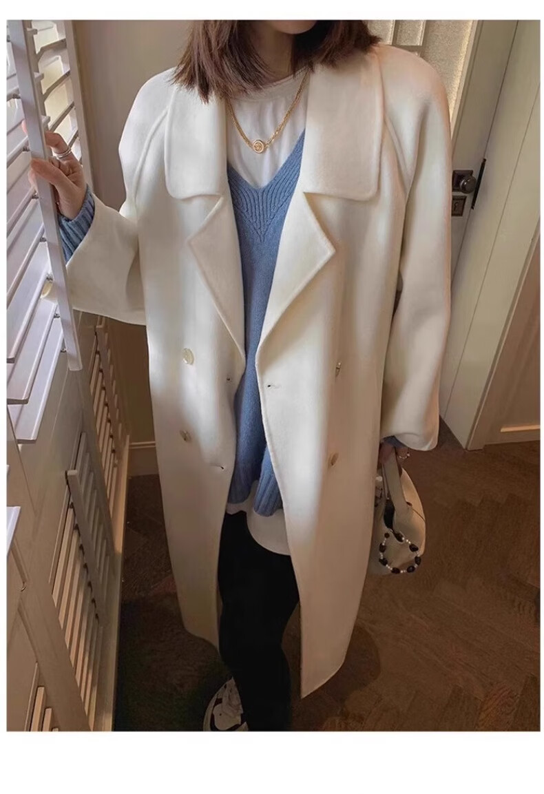 KMZOE double-sided fleece wool coat for women loose 2025 autumn and winter new style small over-the-knee wool coat off-white S 105-120 catties