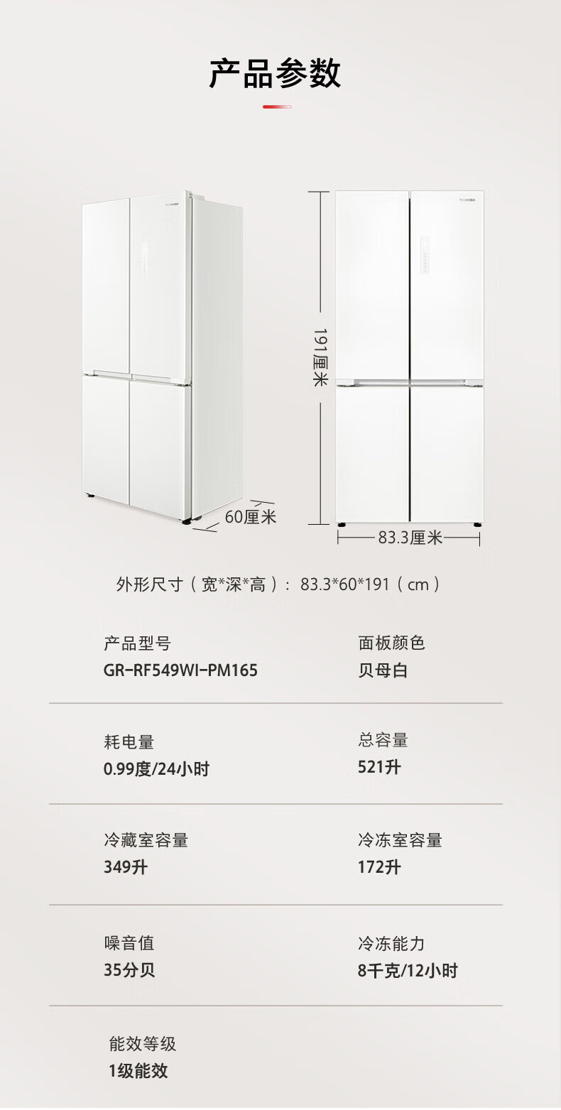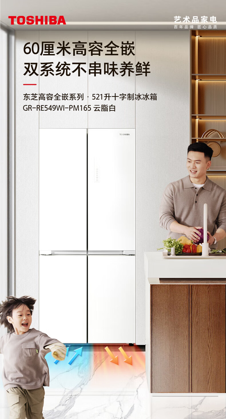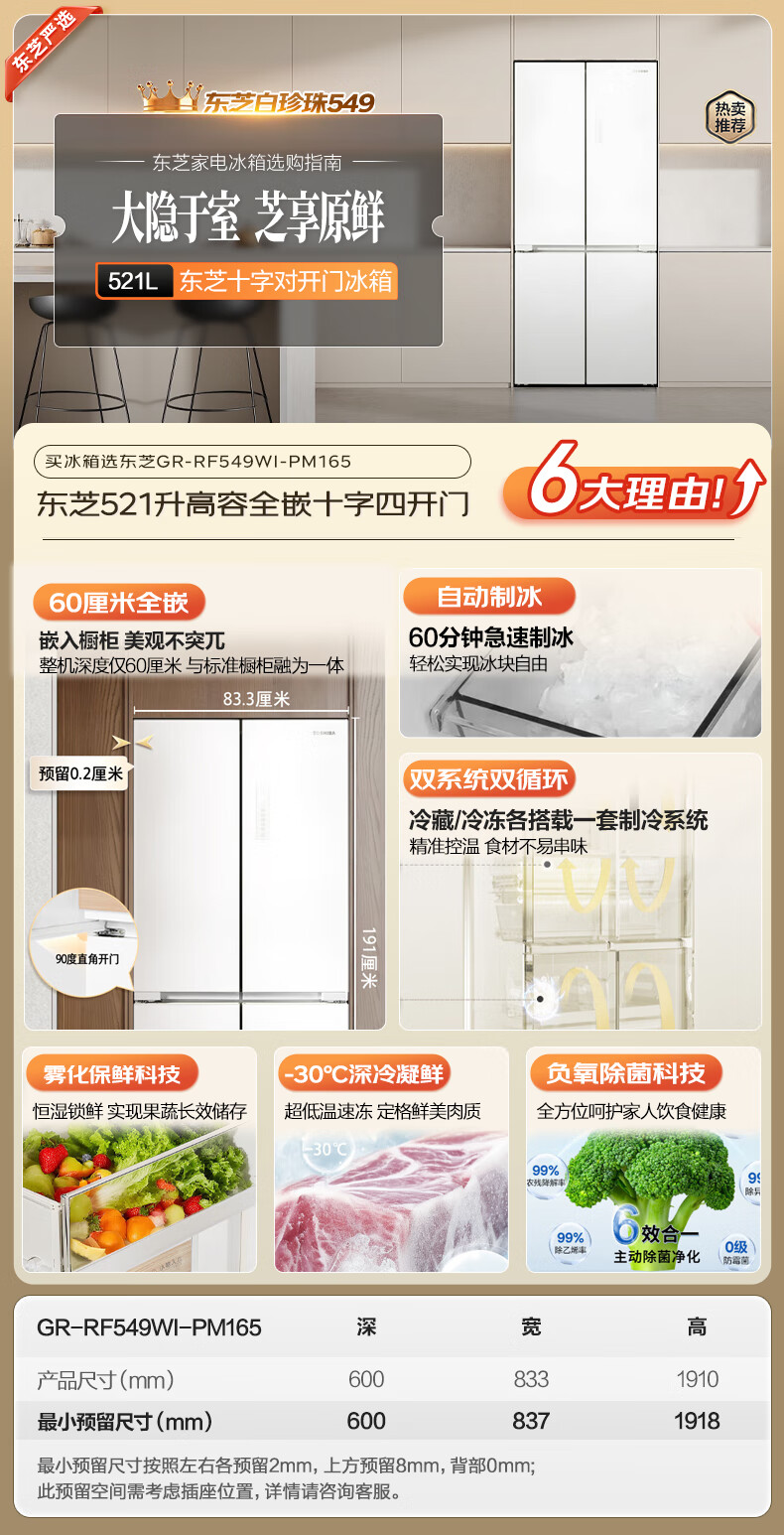 TOSHIBA 549 white pearl high capacity fully embedded 60cm ultra-thin zero embedded dual system automatic ice making cross double door air-cooled frost-free household refrigerator GR-RF549WI-PM165 cloud white