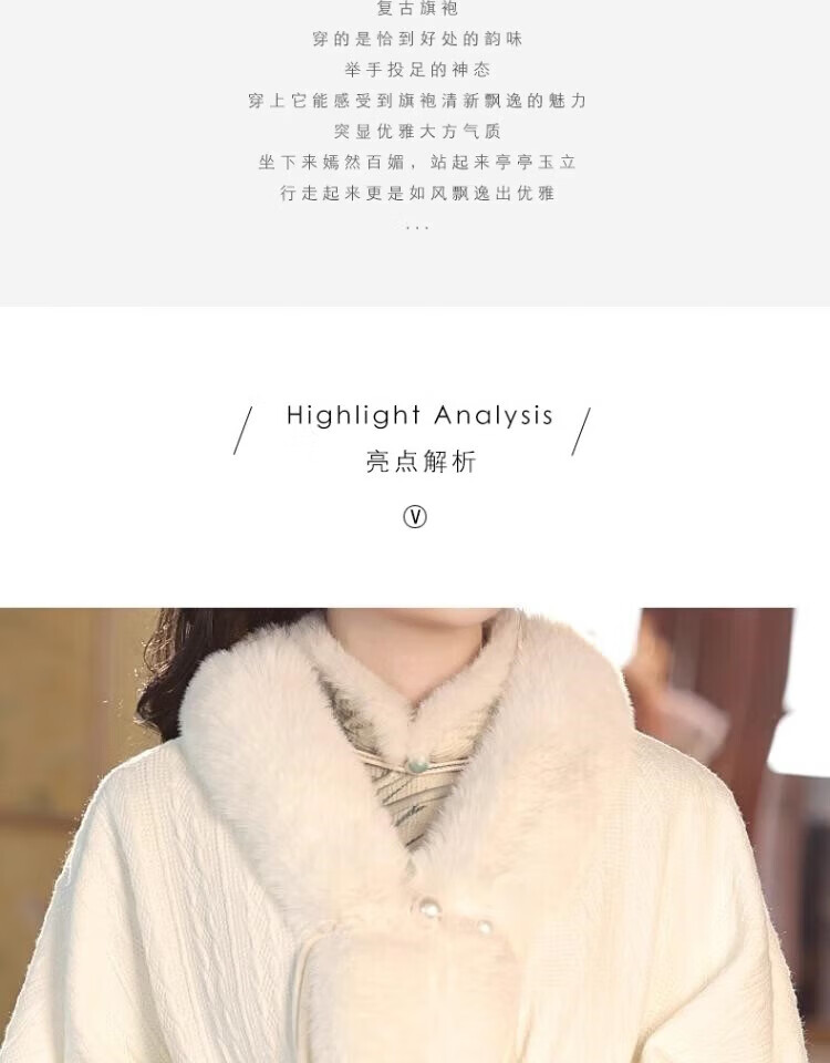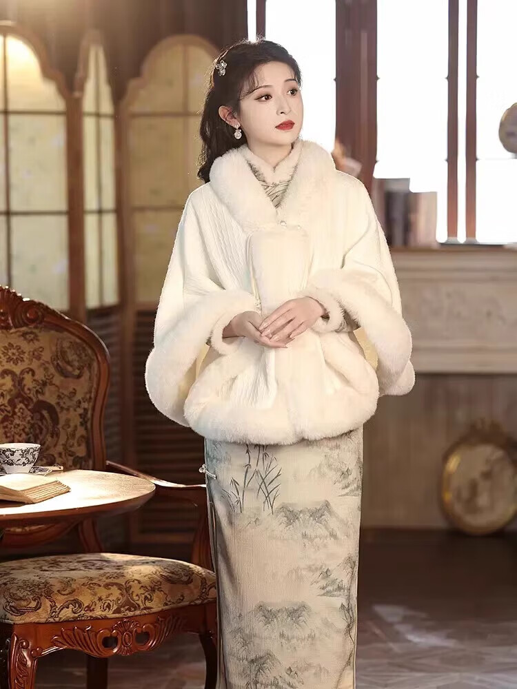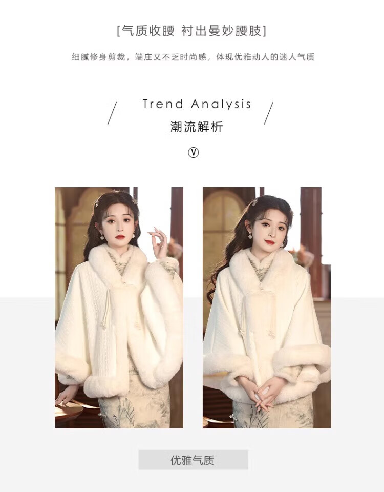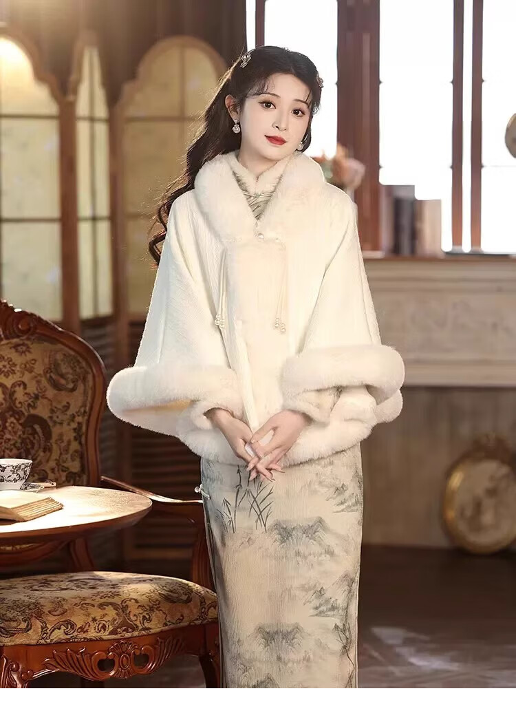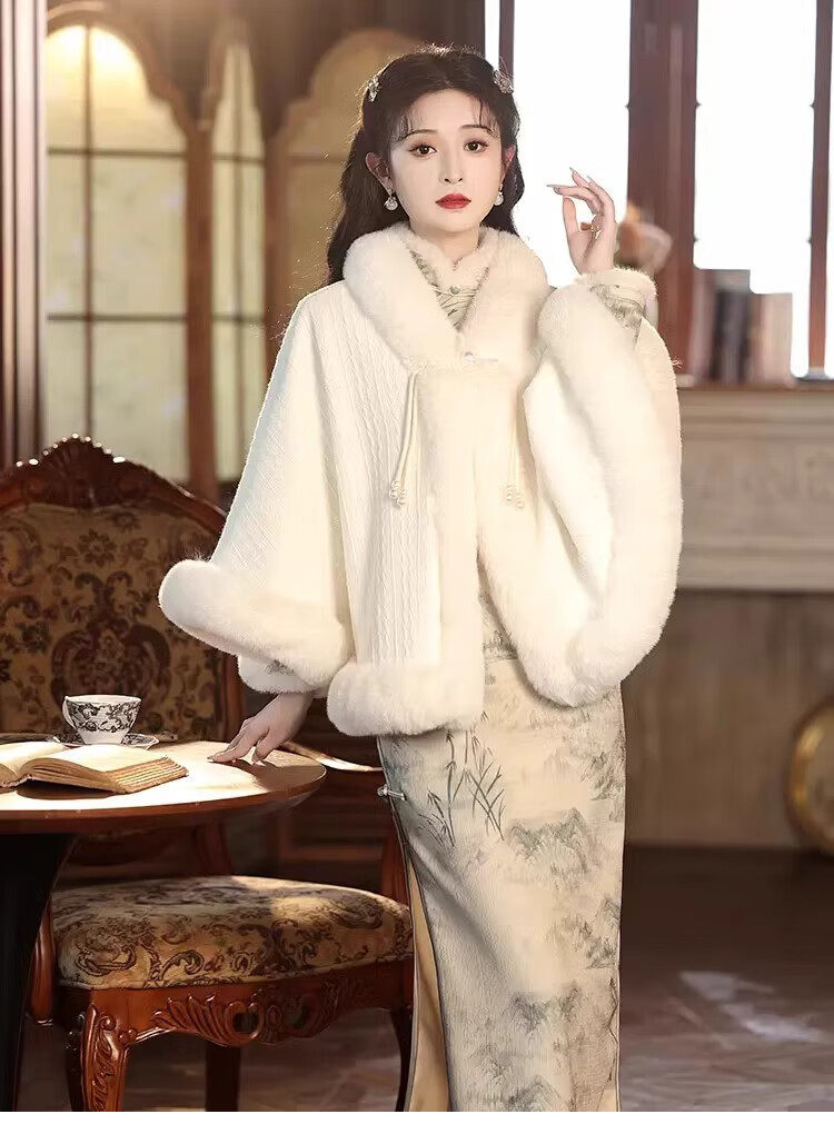 First New Chinese Style Plush Collar Autumn and Winter Thickened Cloak and Shawl with Cheongsam and Republican Style Warm Outer Noble Women's Cardigan White One Size Thickened Suitable for 80-160 Jin