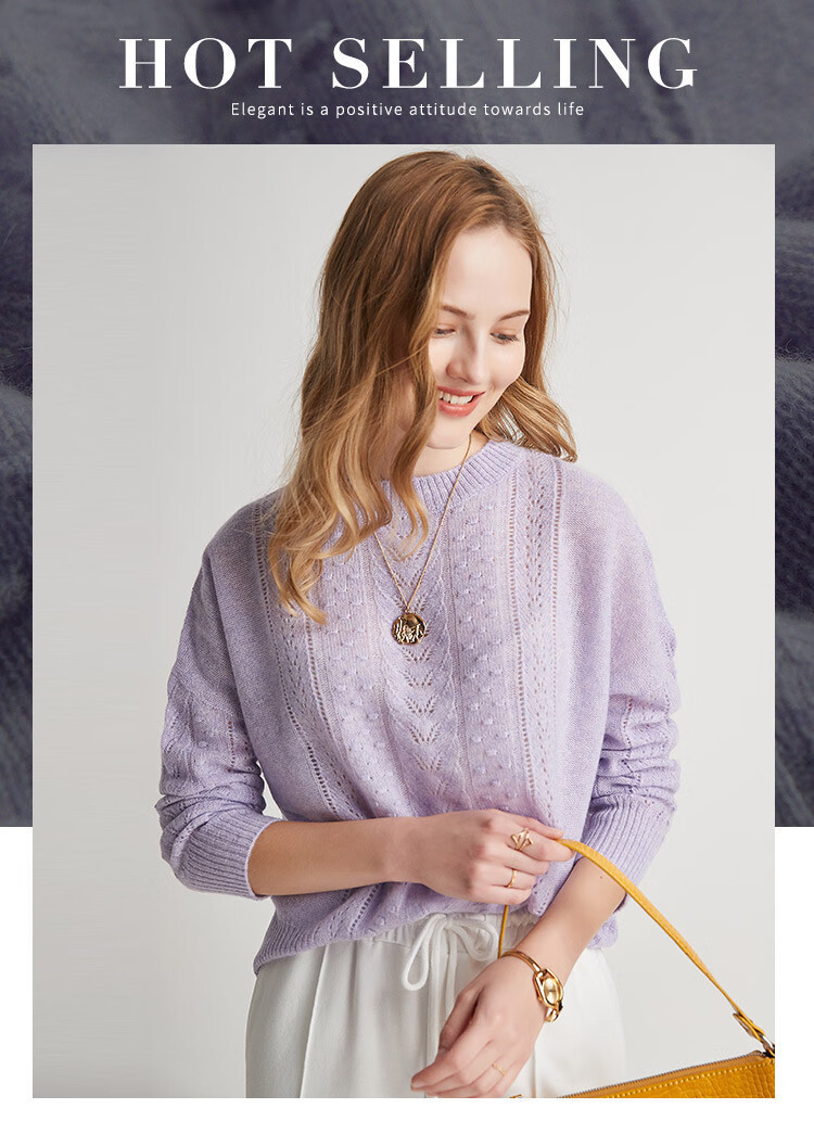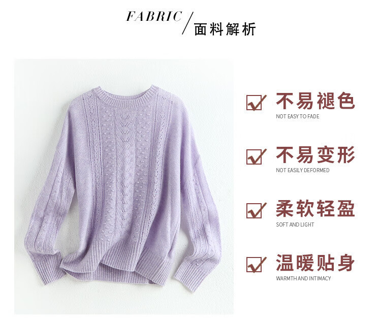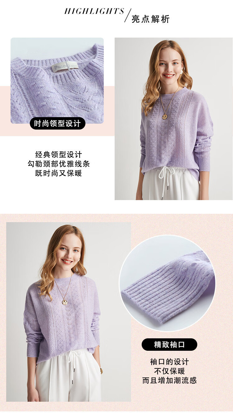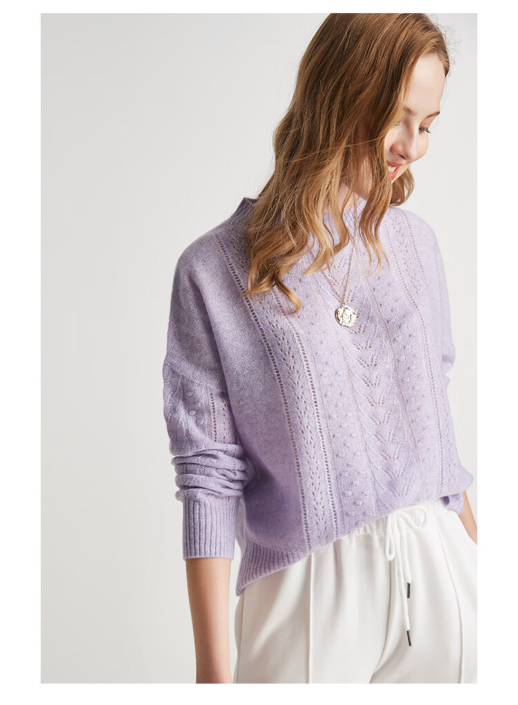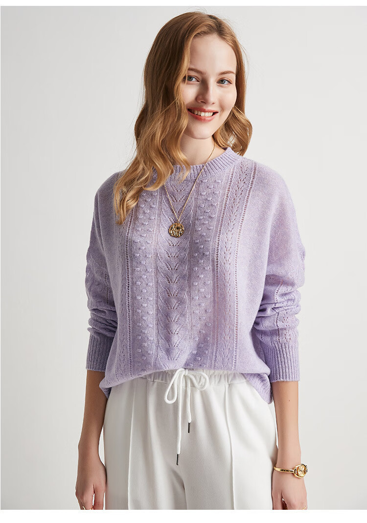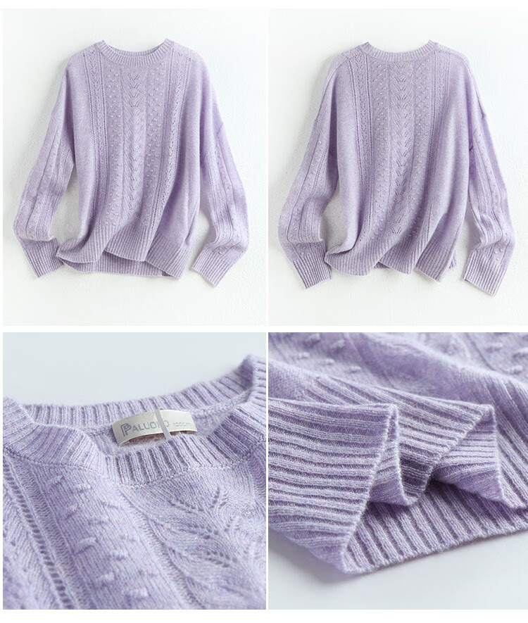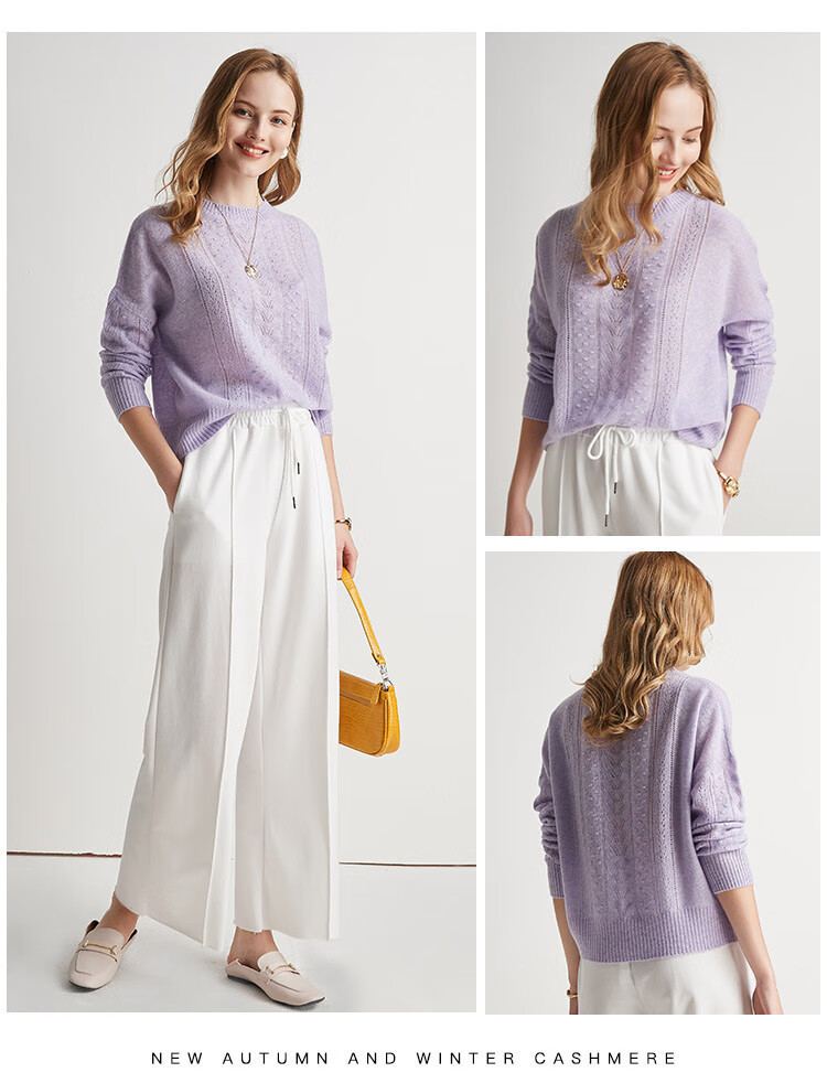 PALUOPO 100% Cashmere Autumn and Winter Hollow Cable Design Lady's Loose Temperament Knitted Cashmere Sweater for Women Light Purple Flower XL 110