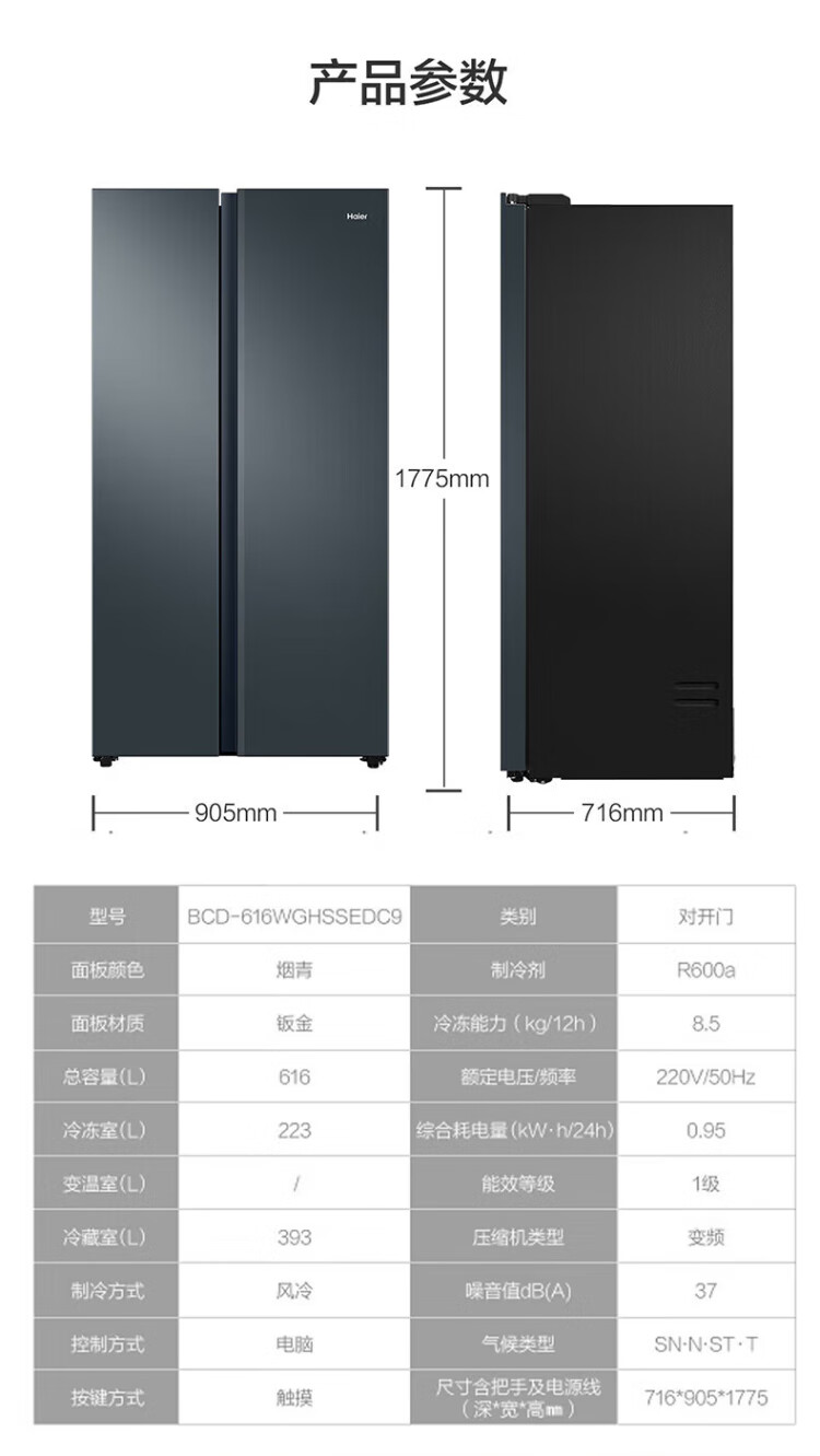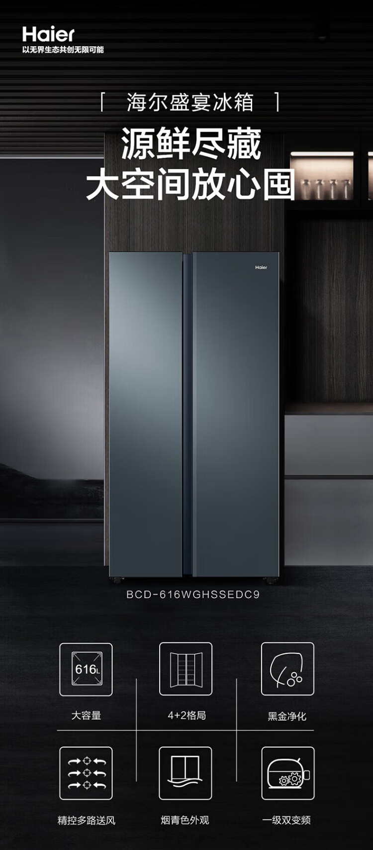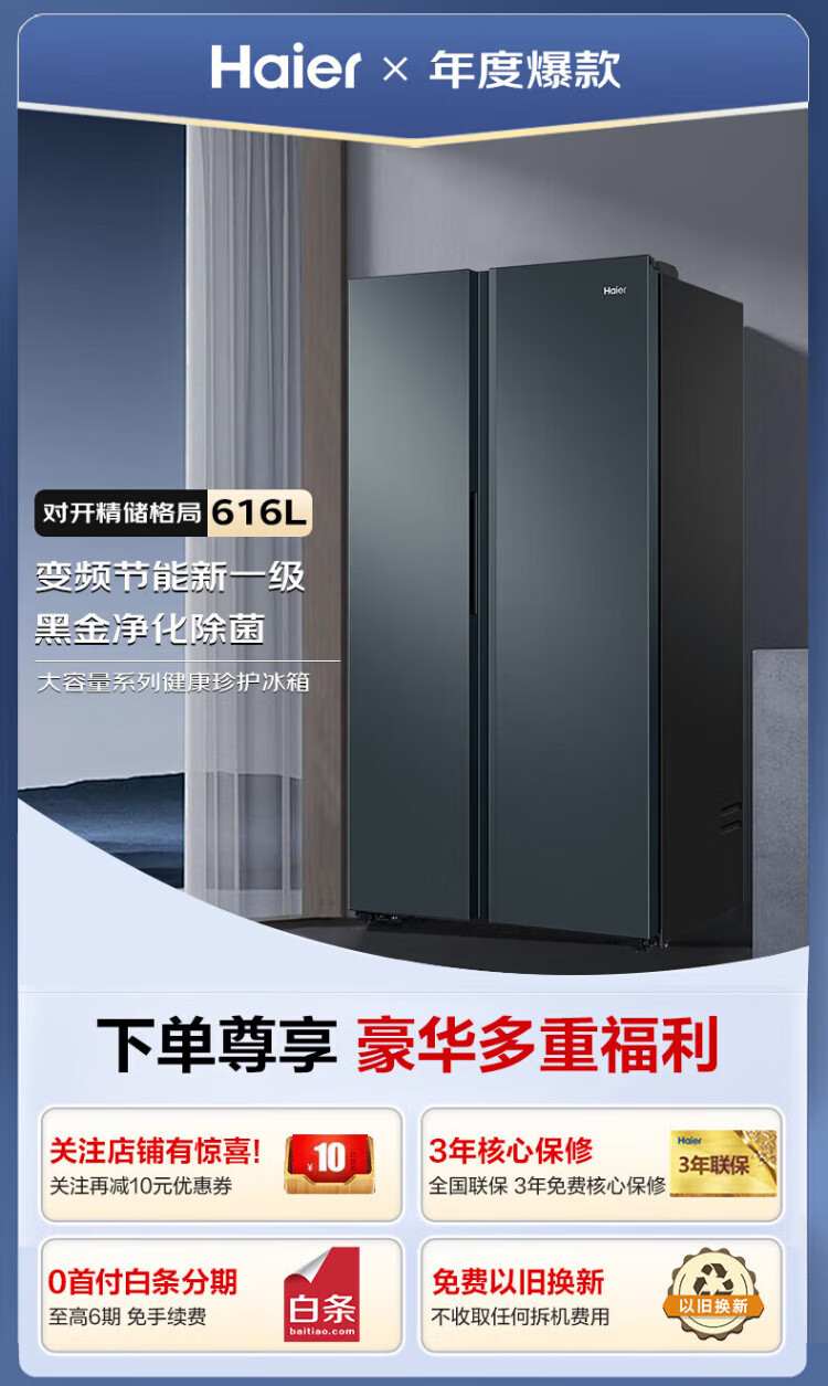 Haier Double Door Refrigerator 616 Upgraded Level 1 Energy Efficiency Frequency Converter Air-cooled Frost-free Large Capacity Home Side-by-side Two-Door Ultra-Thin Refrigerator Home Appliance Subsidy 20% Trade-In Black Gold Purification + Precision Control Multi-channel Air Supply 616WGHSSEDC9