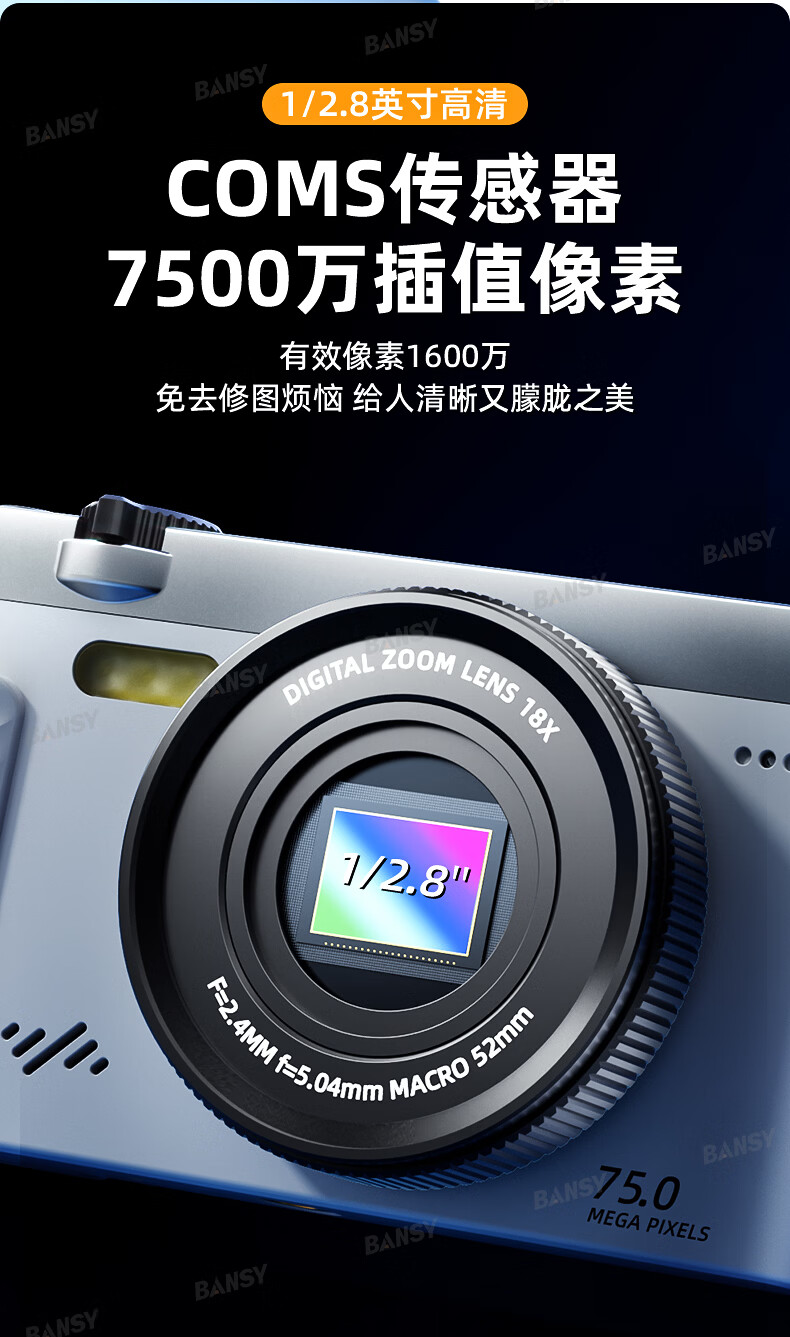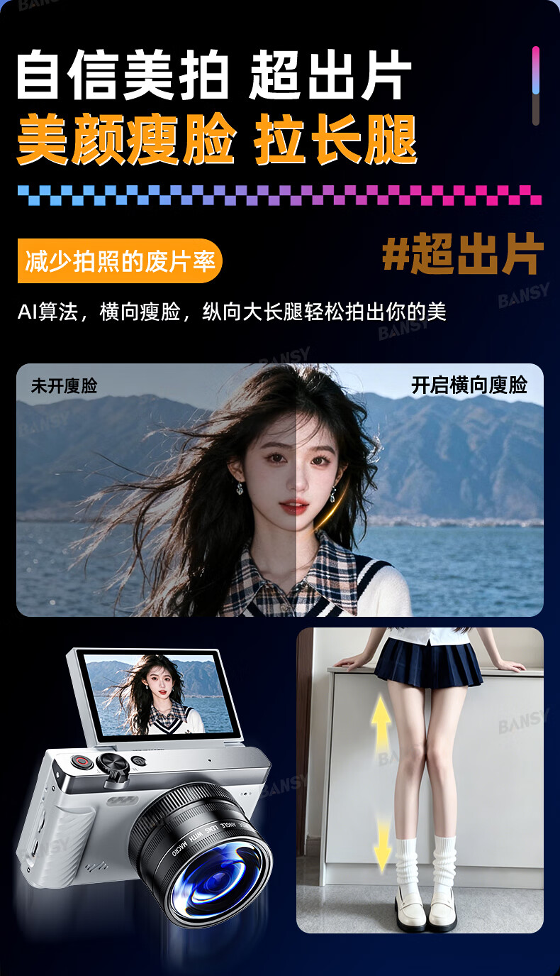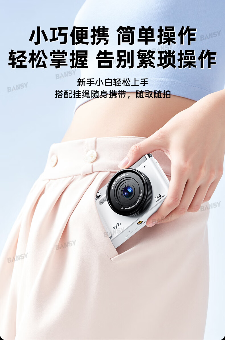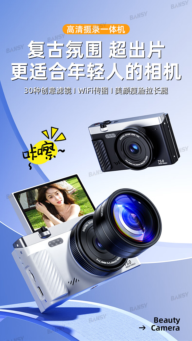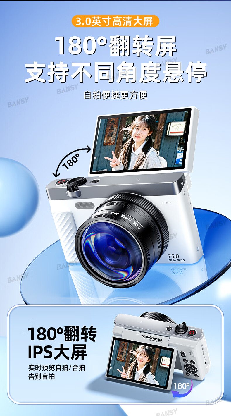 Bansy high-definition mirrorless digital camera ccd flip screen camera vlog campus photography travel special video beauty selfie entry-level students can transfer to mobile phone Valentine's Day gift 3-inch flip screen wide angle + macro lens + beauty and face slimming 64G memory card can store about 6000 photos