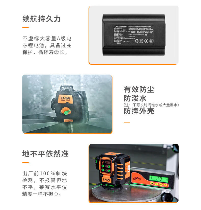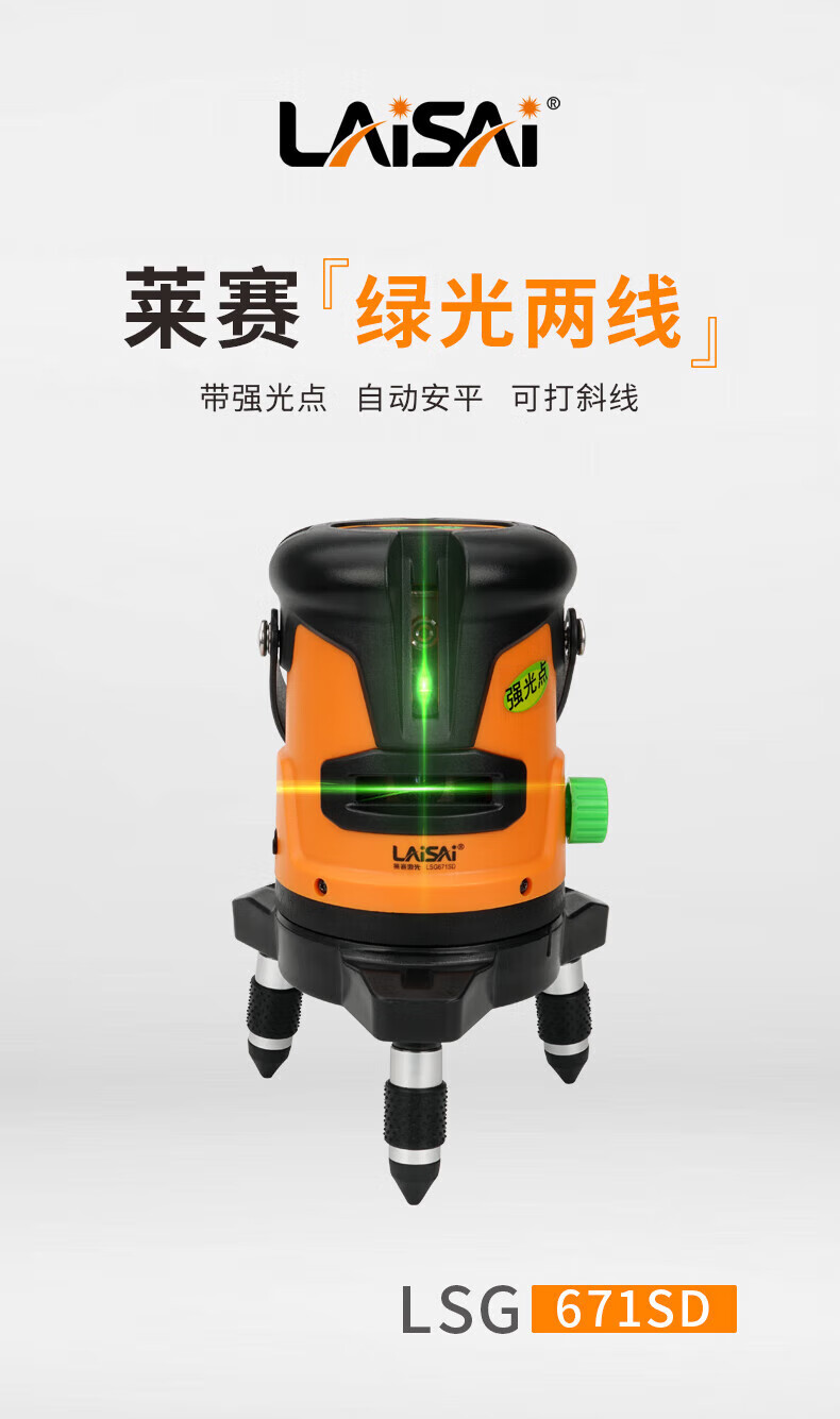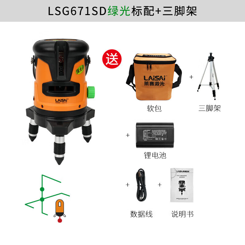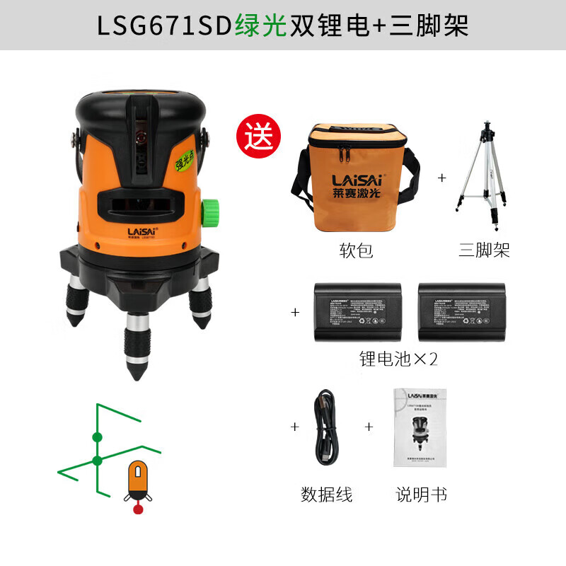 Laisai laser level green light 2-line LSG671SD indoor and outdoor with enhancement point high-precision strong light thin line infrared 2-line green light 671 dual power standard comes with charging head