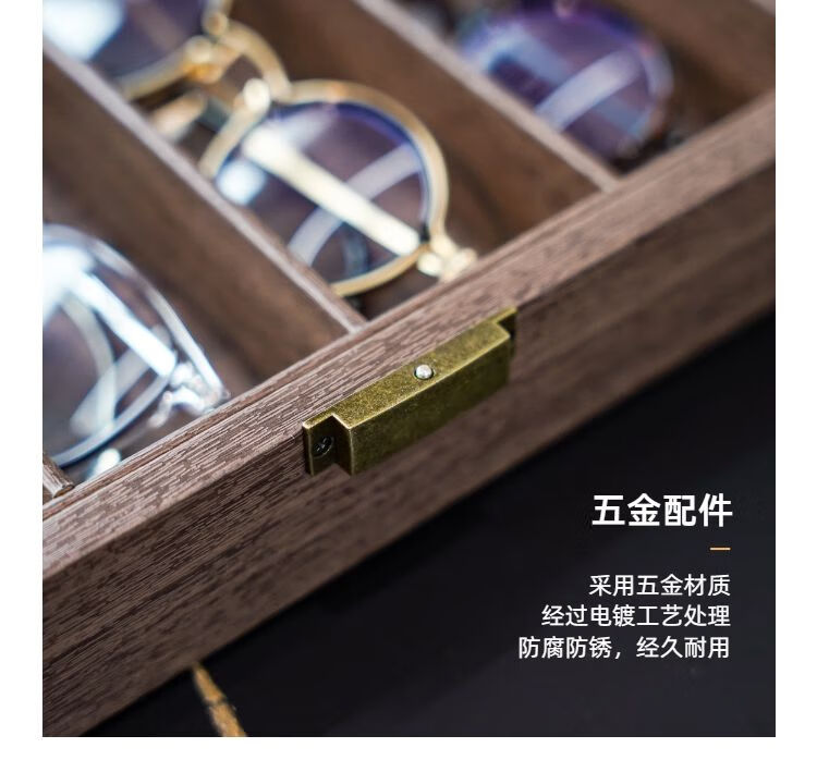 Yusenyi 6-digit wood grain leather glasses storage box, retro 6-compartment sunglasses display collection box with lock and dustproof 6-compartment wood grain leather glasses storage box