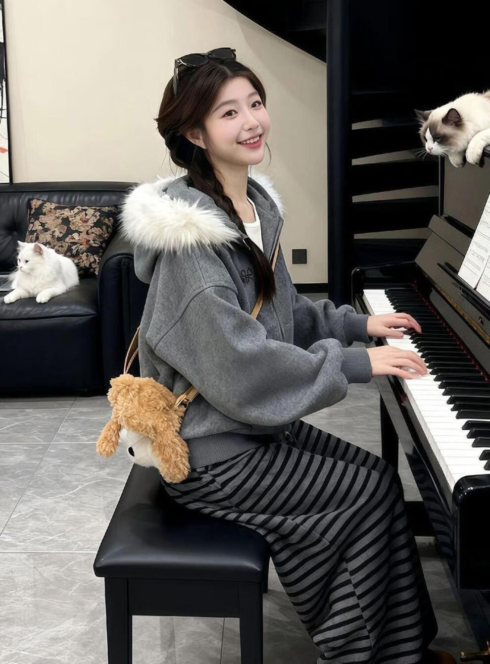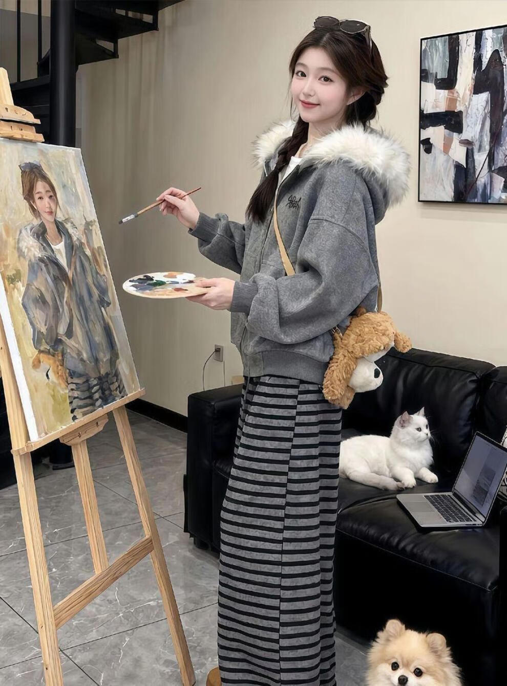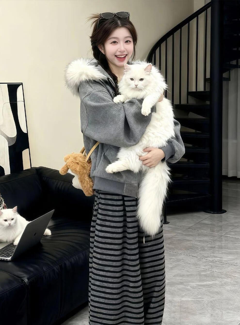 JRET velvet coat for women Korean style gray lazy fur collar 2025 autumn and winter new temperament striped wide-leg pants two-piece set for women fur collar jacket + pants two-piece set plus velvet M recommended 95-110 pounds