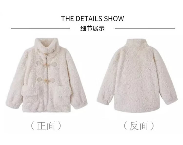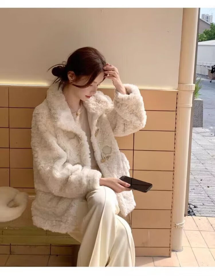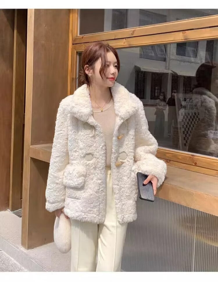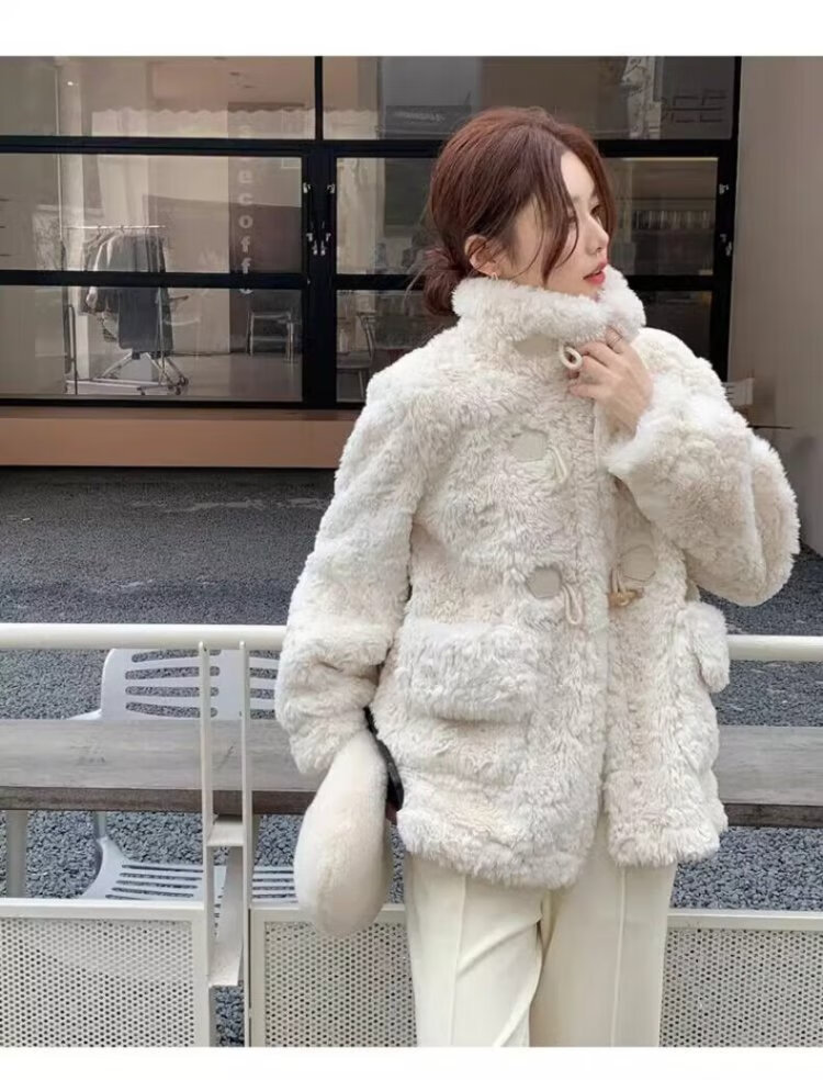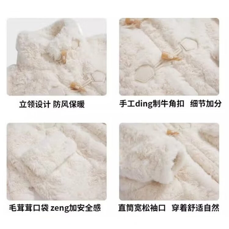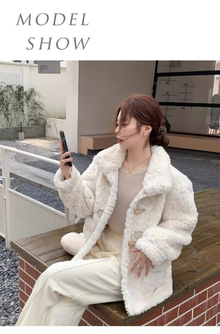 Fistel lamb wool coat for women 2025 autumn and winter new style small fragrant horn button lamb velvet coat small plus velvet cotton coat white with cotton lining L suitable for 115-130 pounds