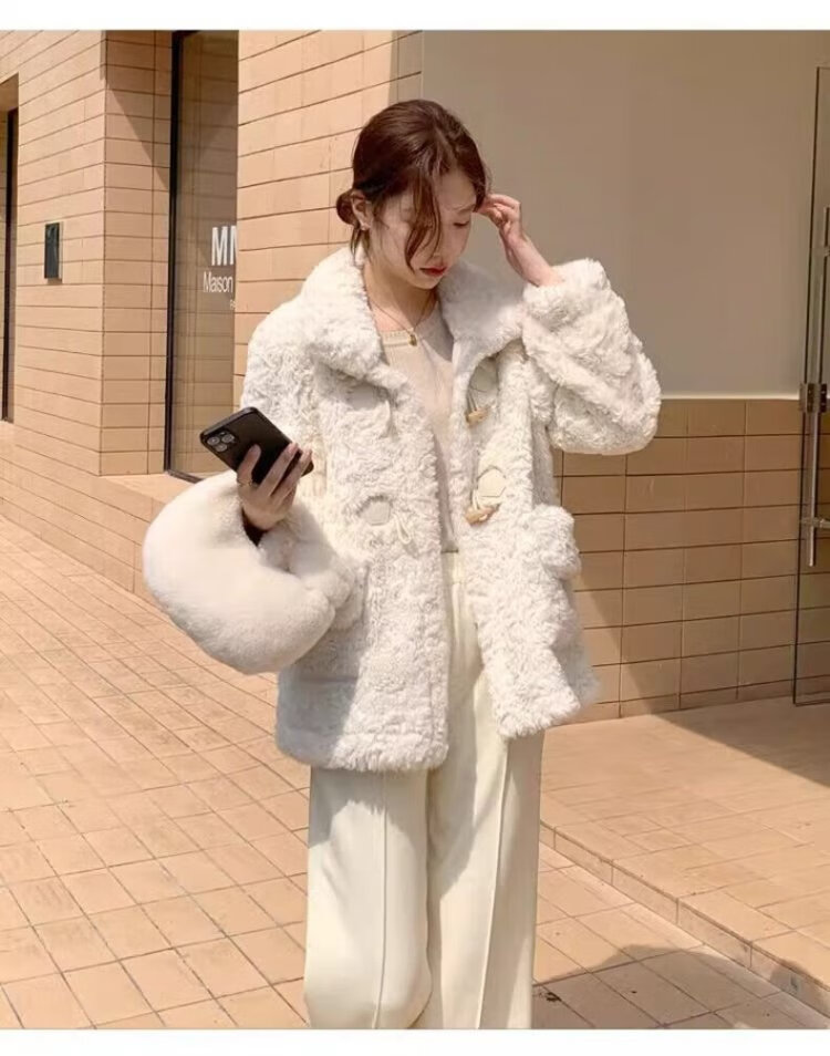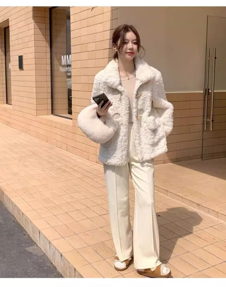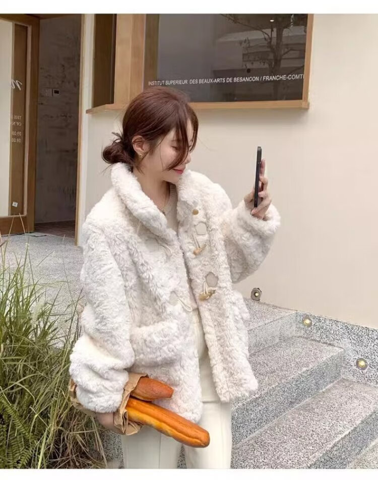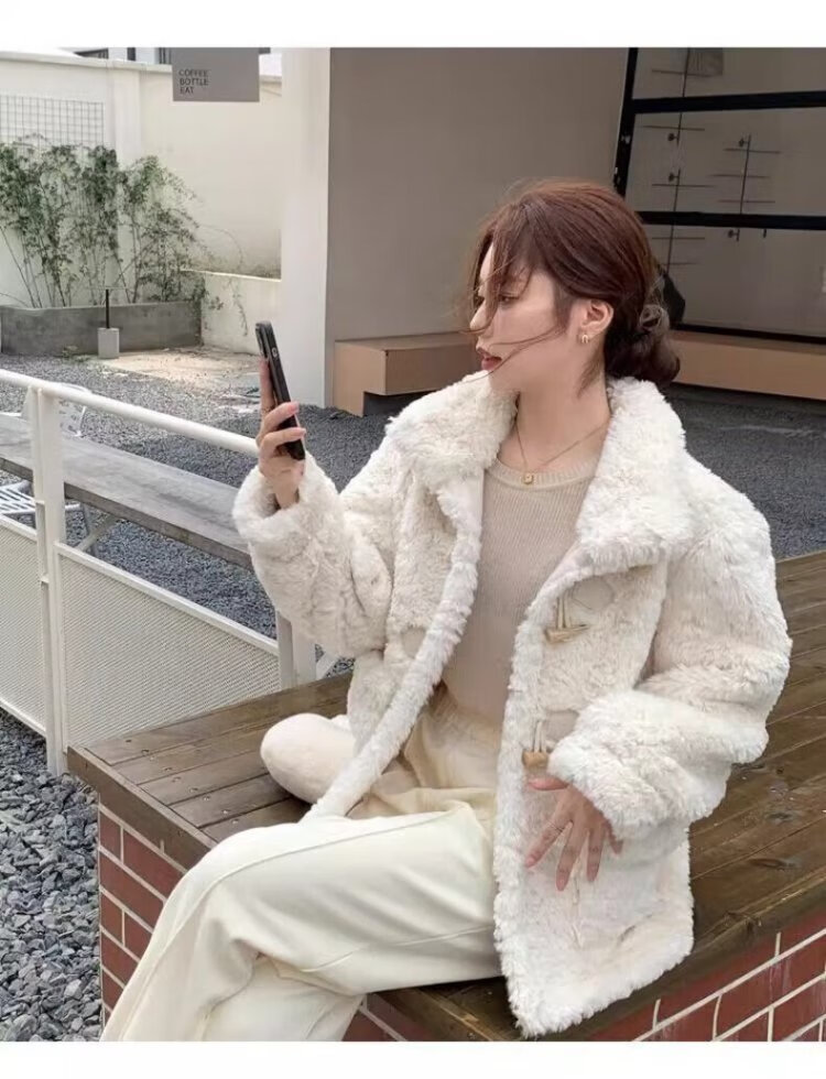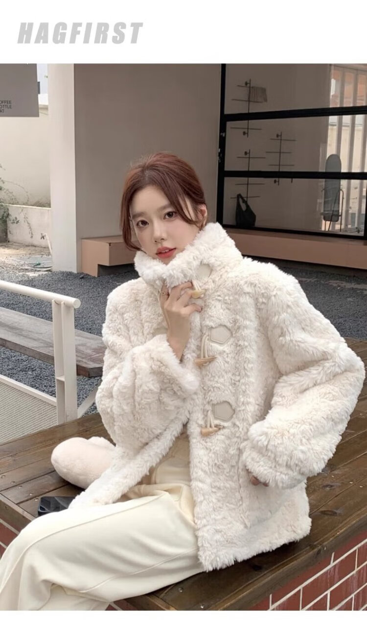 Fistel lamb wool coat for women 2025 autumn and winter new style small fragrant horn button lamb velvet coat small plus velvet cotton coat white with cotton lining L suitable for 115-130 pounds