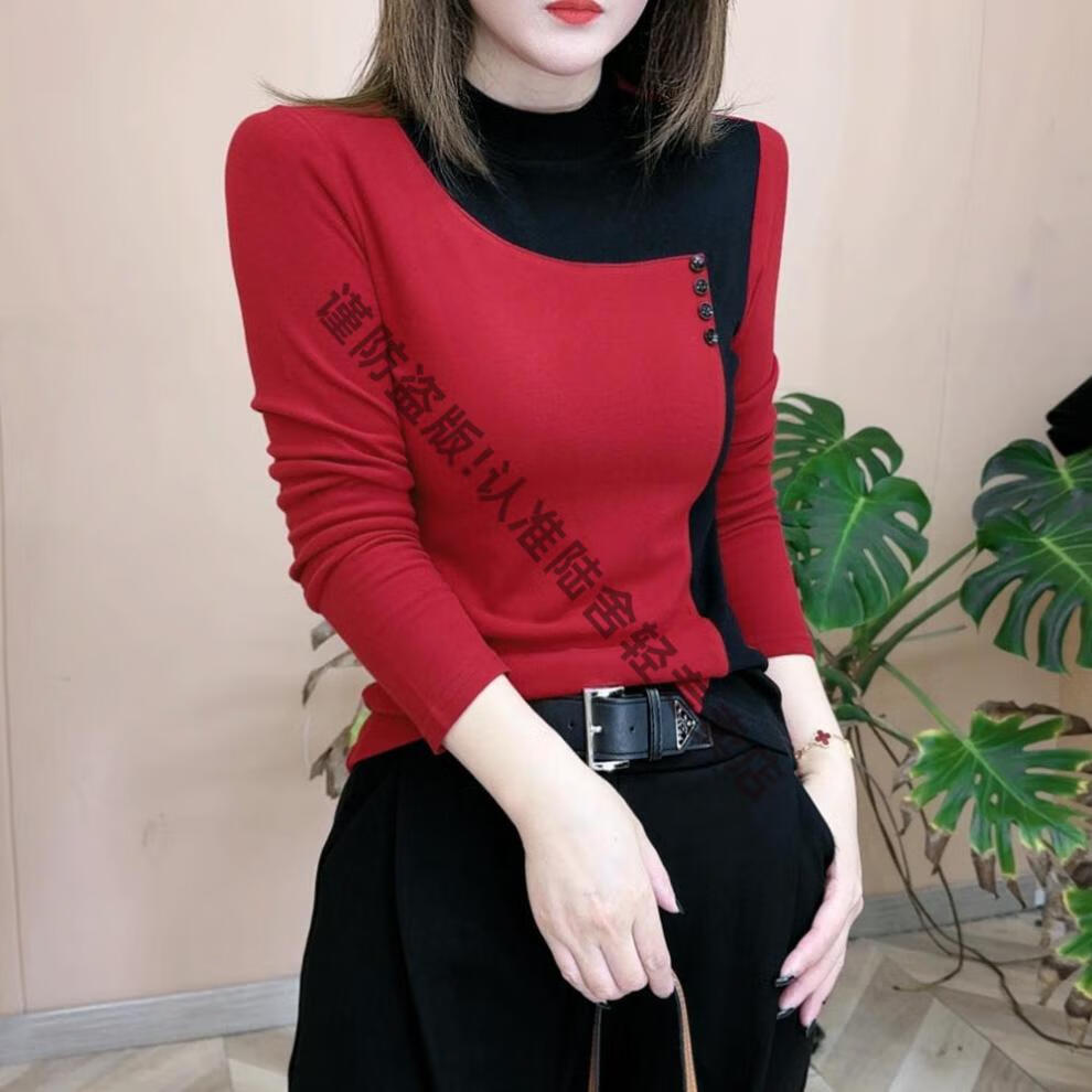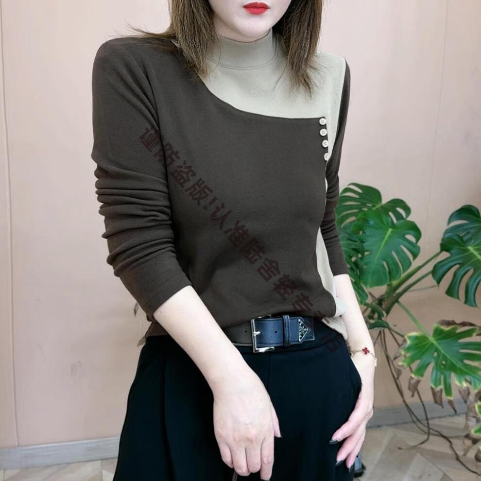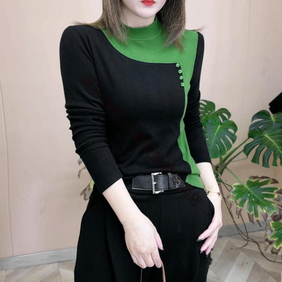 Pierre Cardin thickened German velvet half turtleneck top for women 2025 autumn and winter with warm base layer for women color block long-sleeved T-shirt green M recommended 85-105 catties